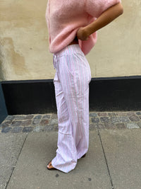 These trousers have a loose and relaxed fit. They have an elastic waistband with tieable strings. The trousers have slanted side pockets.