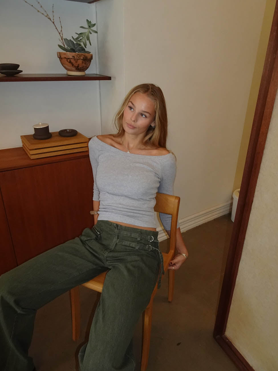 This grey basic blouse with a boat neckline is a timeless must-have in any wardrobe. The close-fitting cut and soft, stretchy fabric ensure both comfort and a flattering drape, while the subtle boat neckline adds a feminine and refined touch.