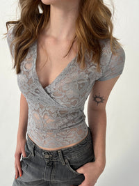 Beautiful close-fitting lace V t-shirt. In the pictures, it is styled with a neutral bra, and therefore it will be transparent if you don't have anything underneath.