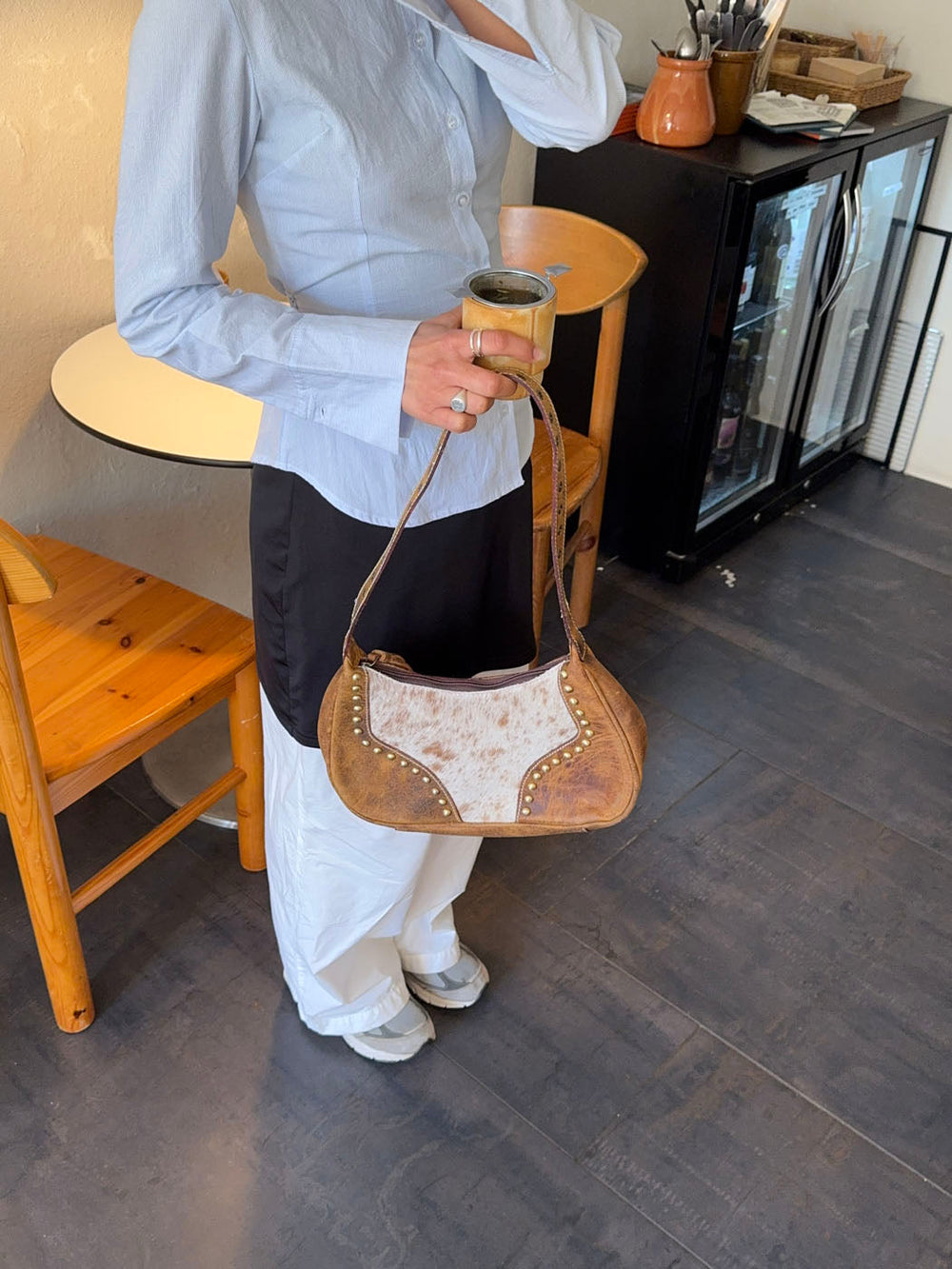 A unique and stylish handbag made from genuine cowhide and light brown vegan leather. The rounded shape is accented with brass-colored studs, giving it a refined yet edgy feel. A leather tassel at the front adds a bohemian touch. Each bag is one of a kind due to the natural variation in cowhide patterns. Perfect as a statement piece for both everyday wear and weekend outings.