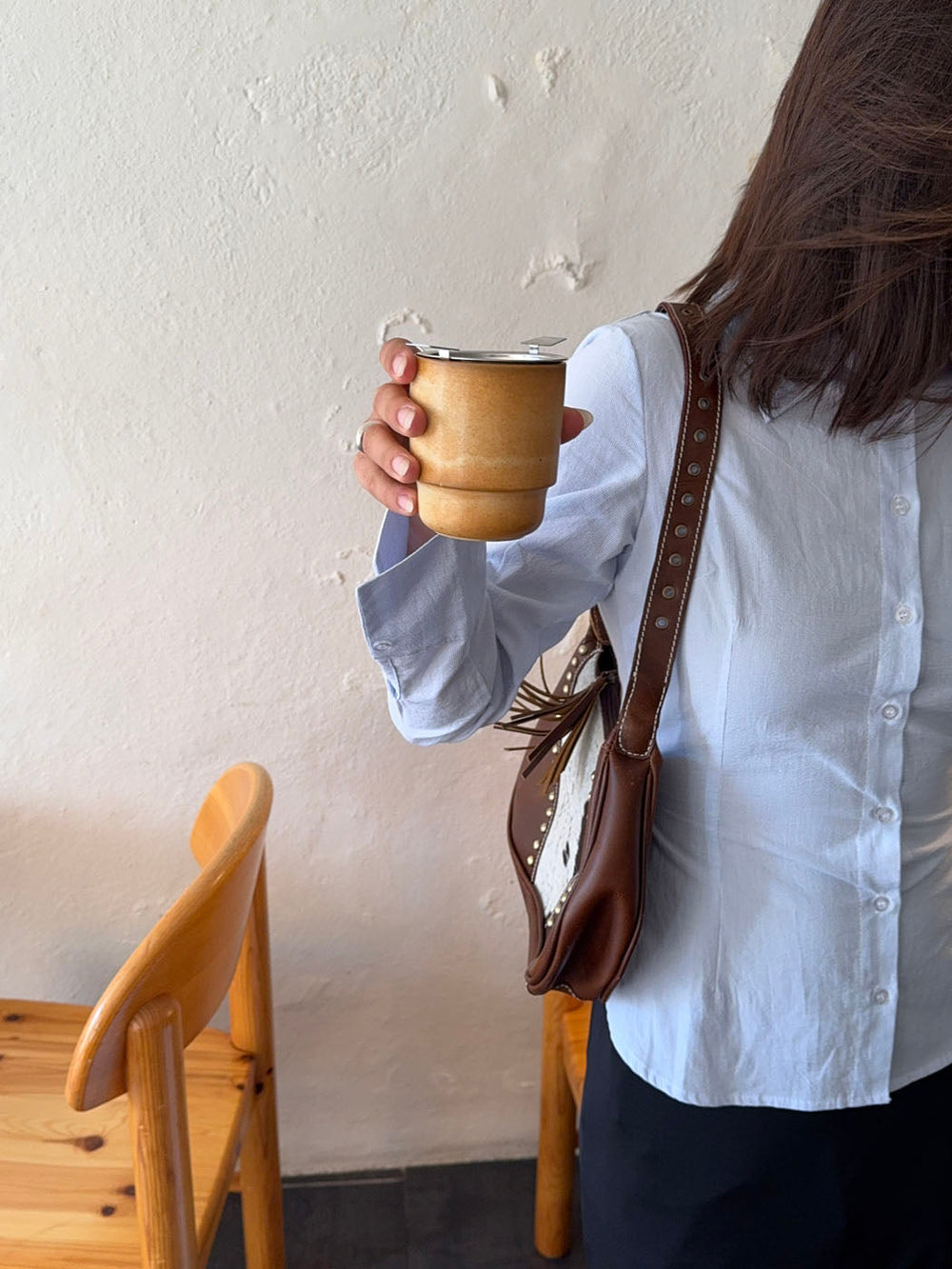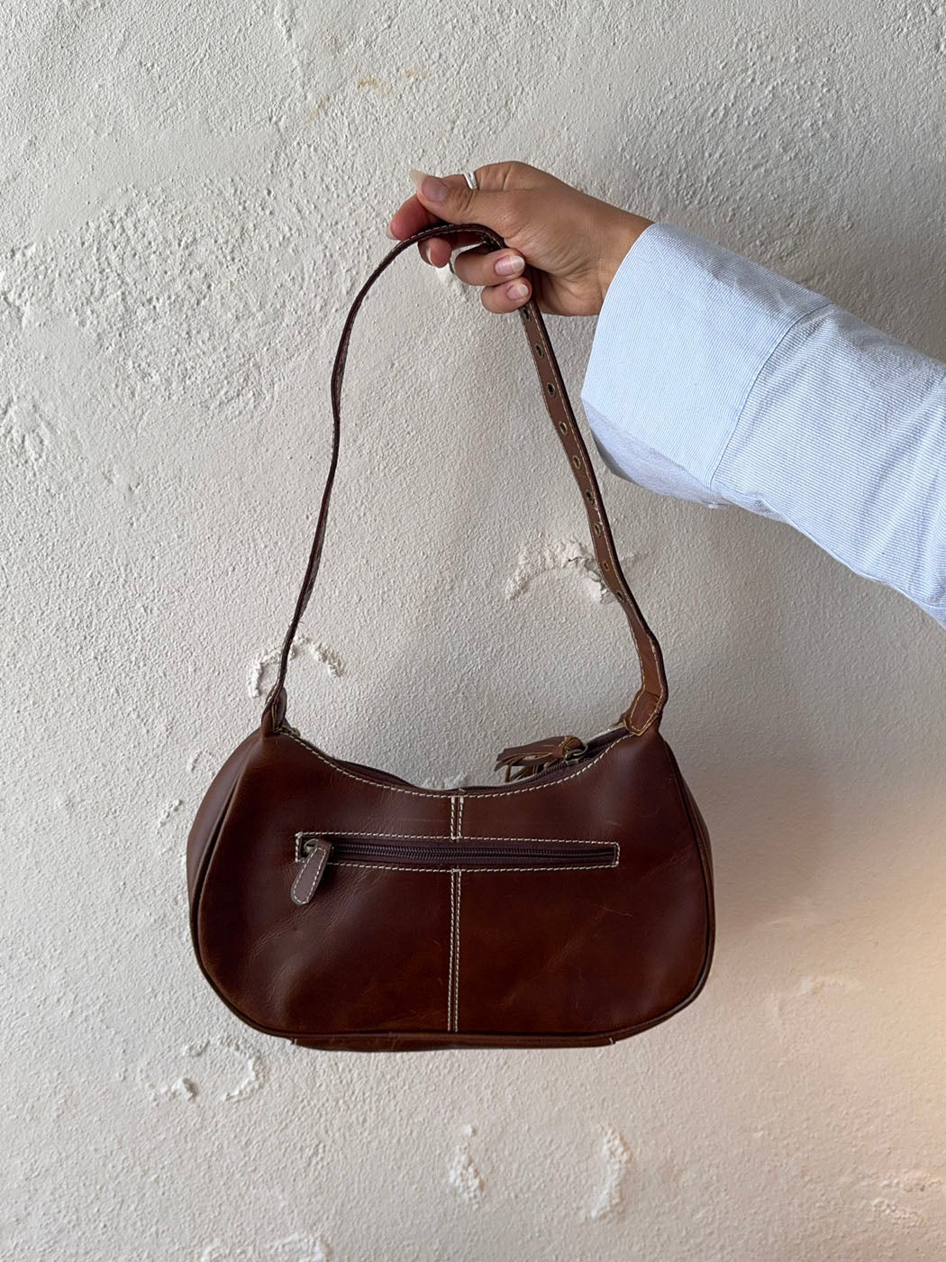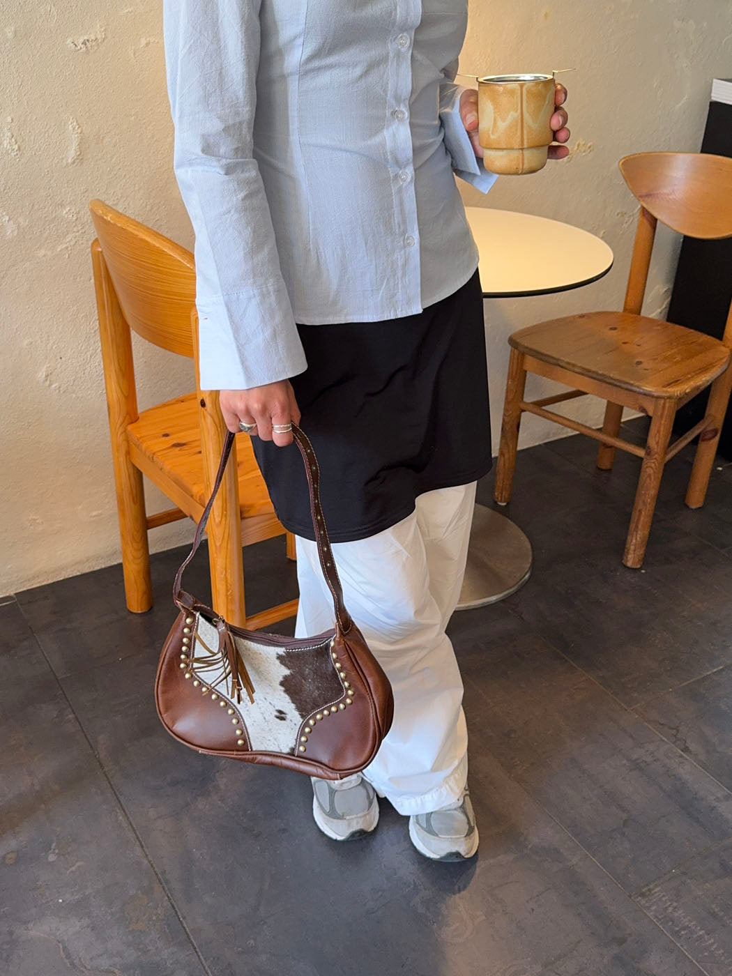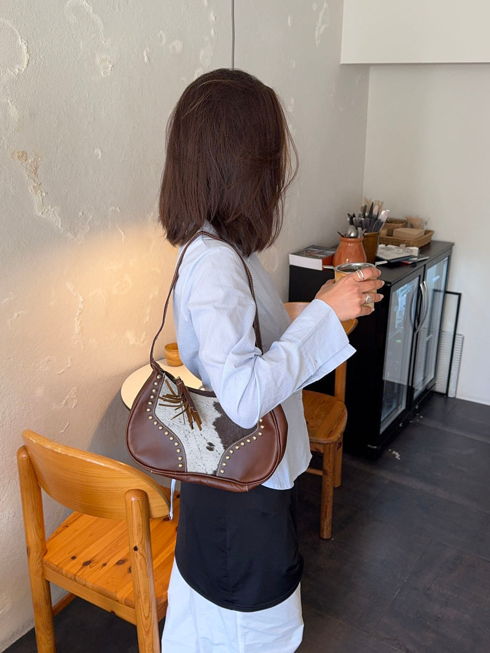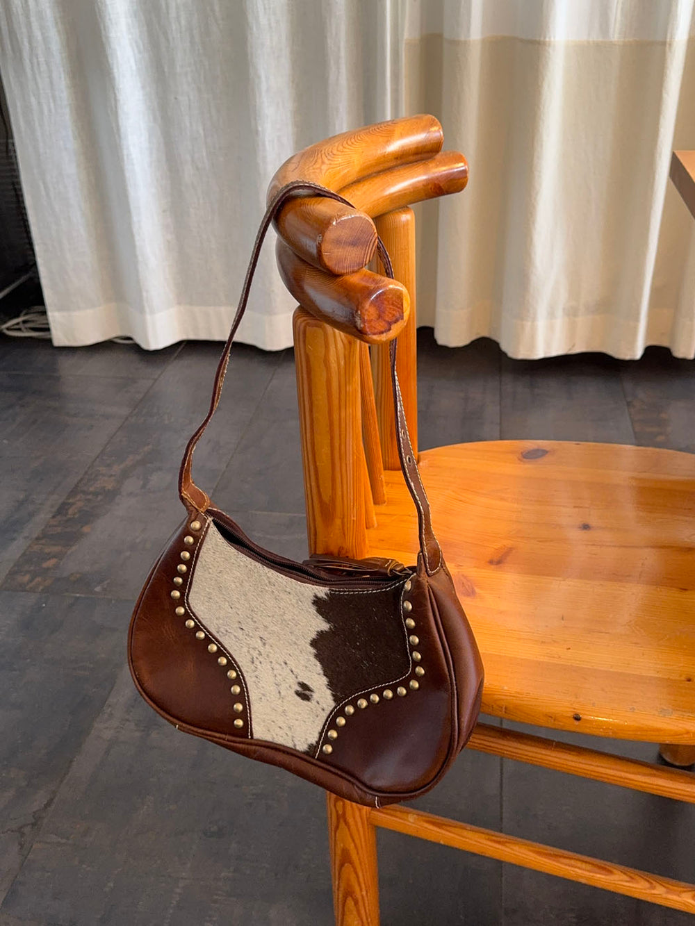 A unique and stylish handbag made from genuine cowhide and dark brown vegan leather. The rounded shape is accented with brass-colored studs, giving it a refined yet edgy feel. A leather tassel at the front adds a bohemian touch. Each bag is one of a kind due to the natural variation in cowhide patterns. Perfect as a statement piece for both everyday wear and weekend outings.