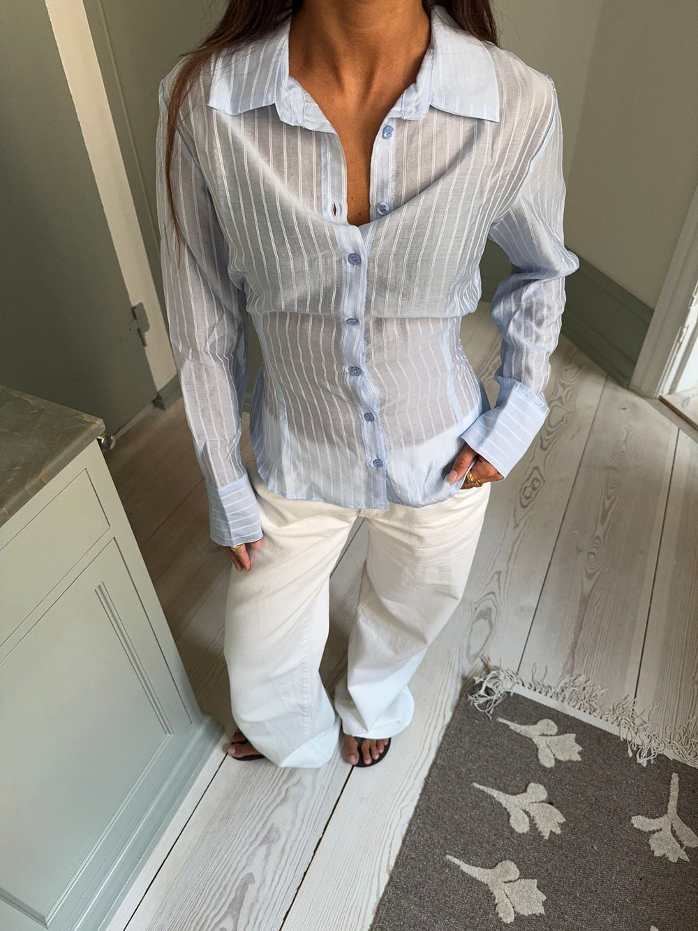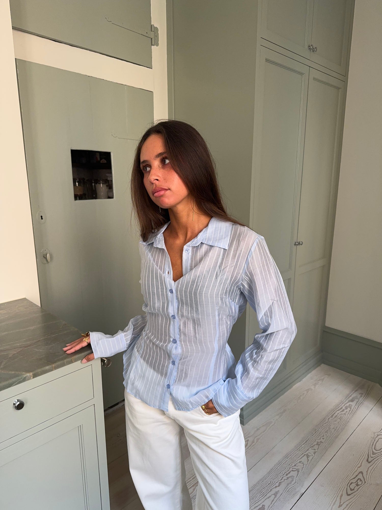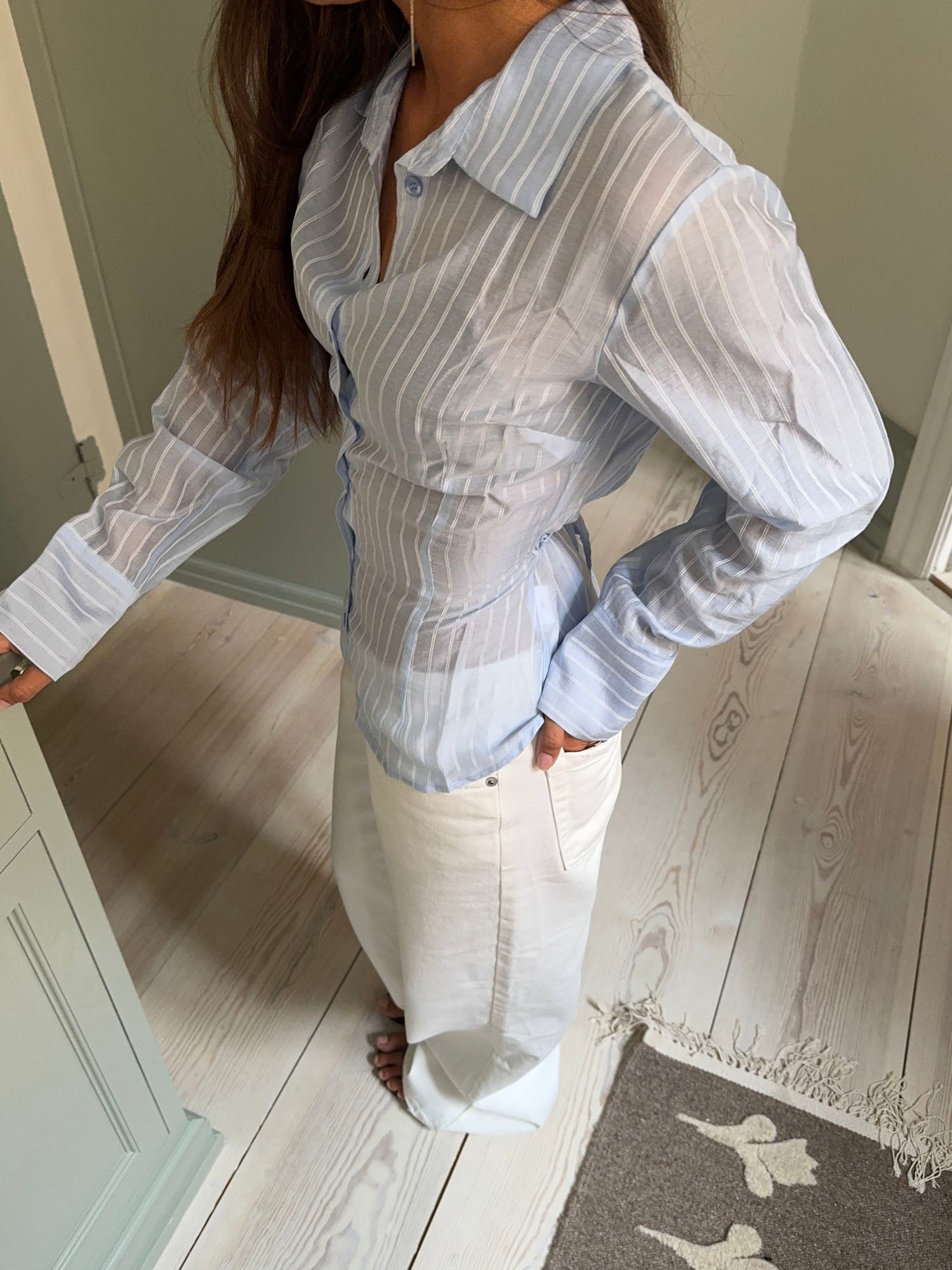 This fitted shirt smartly combines style and comfort. With long sleeves and a classic collar, it offers a timeless look, while the side ties can be fastened at the back to adjust the waist for a perfect fit. The striped detailing adds a modern touch, making it ideal for both everyday wear and more special occasions.