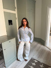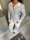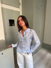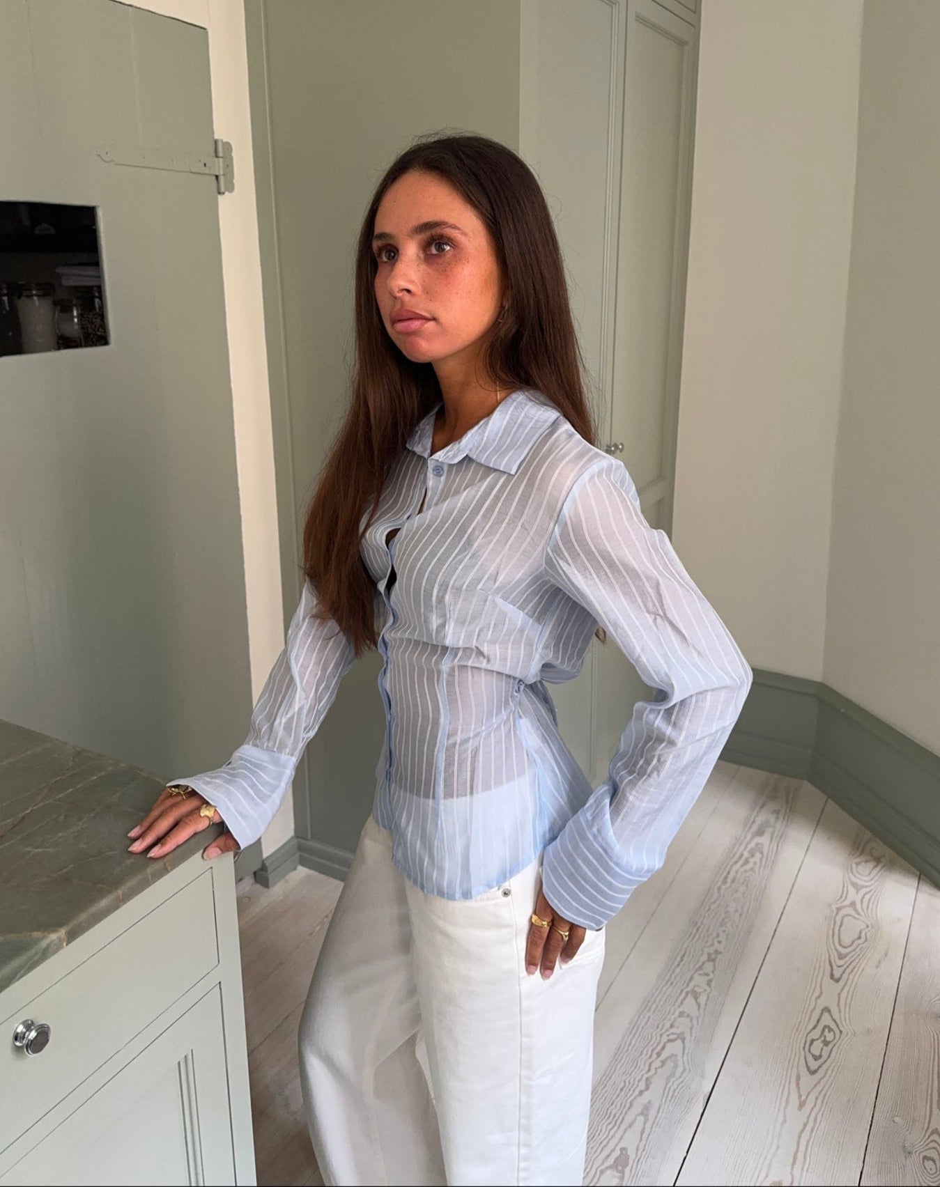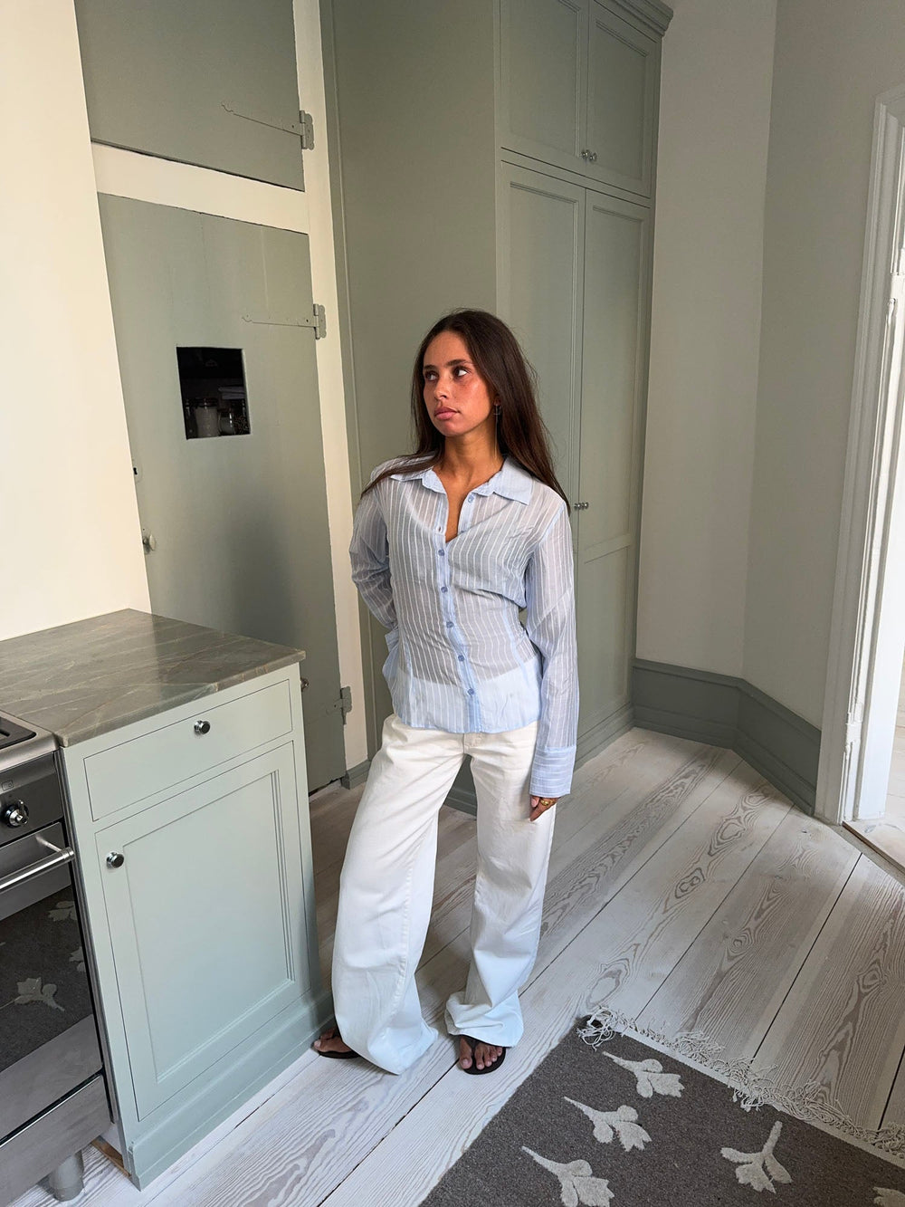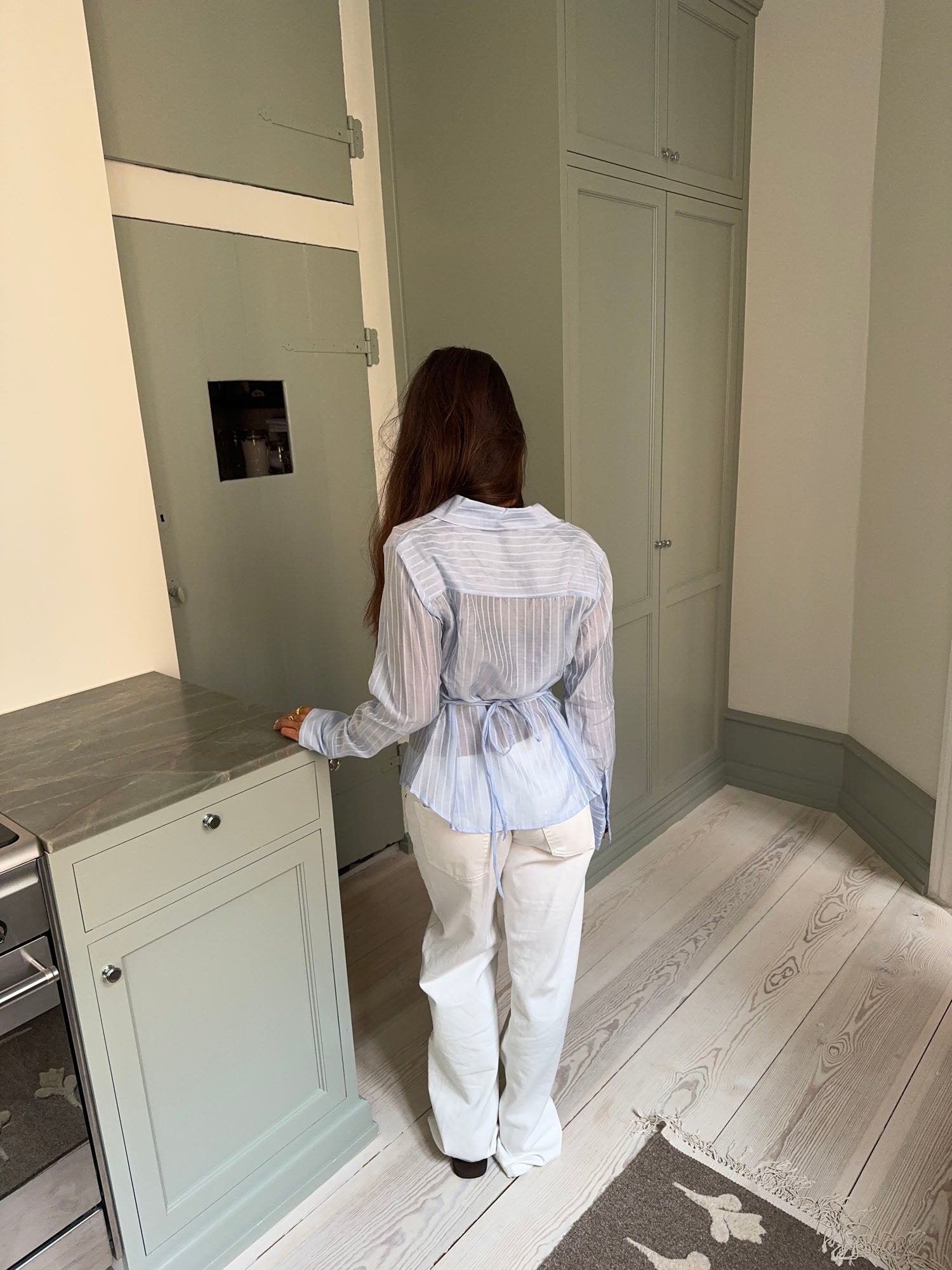 This fitted shirt smartly combines style and comfort. With long sleeves and a classic collar, it offers a timeless look, while the side ties can be fastened at the back to adjust the waist for a perfect fit. The striped detailing adds a modern touch, making it ideal for both everyday wear and more special occasions.