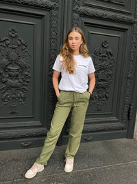 Straight linen pants with elastic and tied band. The pants have side pockets.