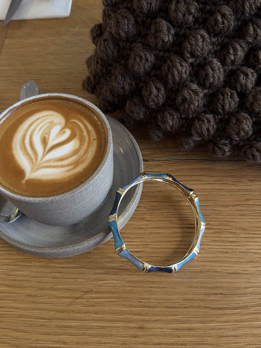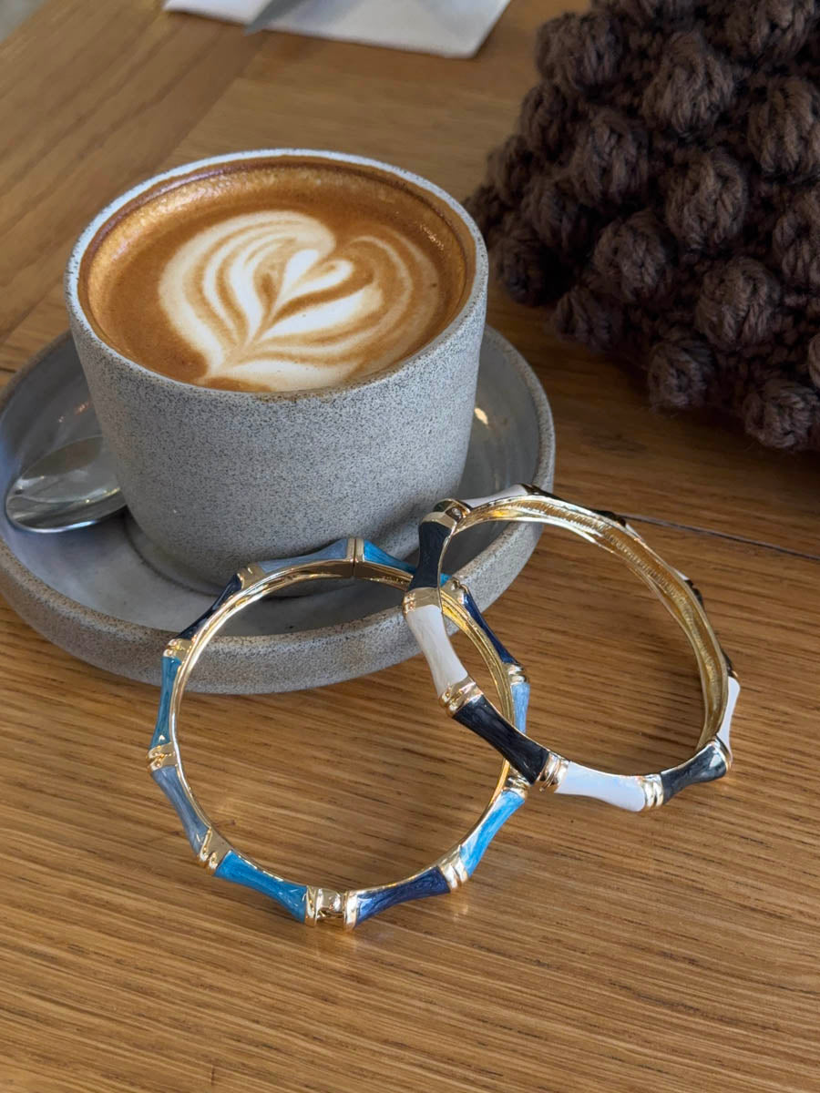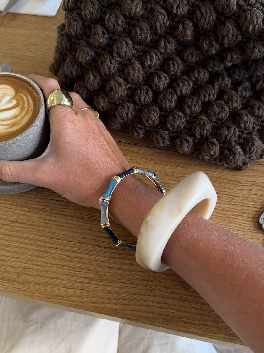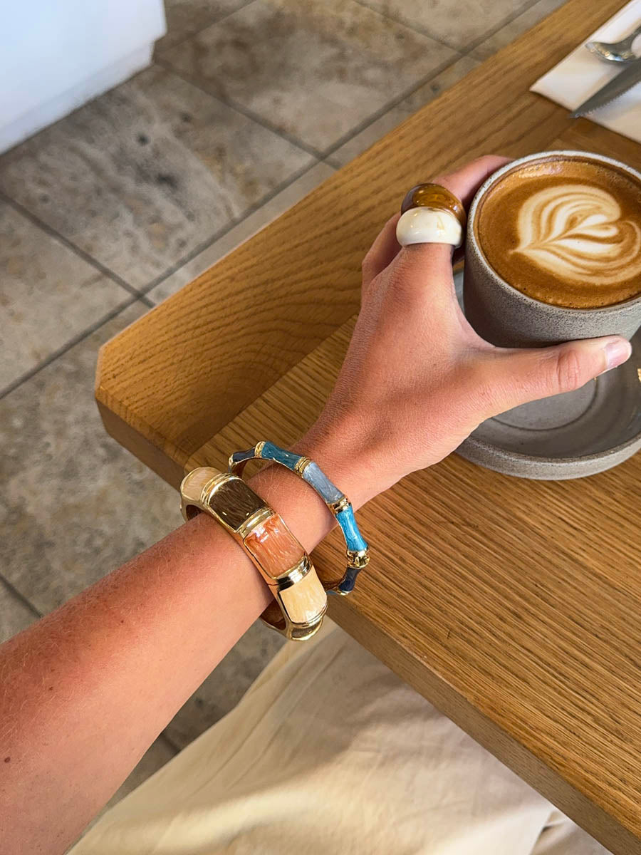 An elegant and colorful bracelet in golden metal with segments in deep blue tones. The shifting play between dark and light shades creates a vibrant contrast, while the bamboo-inspired form adds an organic and playful touch. The bracelet has a sophisticated yet fresh expression, making it an ideal choice for those who wish to add a touch of color and personality to both everyday outfits and festive occasions.