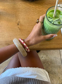 An elegant bracelet in golden metal with black enamel details in a graphic pattern. The beautiful interplay between the shiny gold and the dark contrasts creates an exclusive and modern look. With its timeless design, the bracelet can be styled for both everyday wear and festive occasions, adding a touch of sophisticated edge.