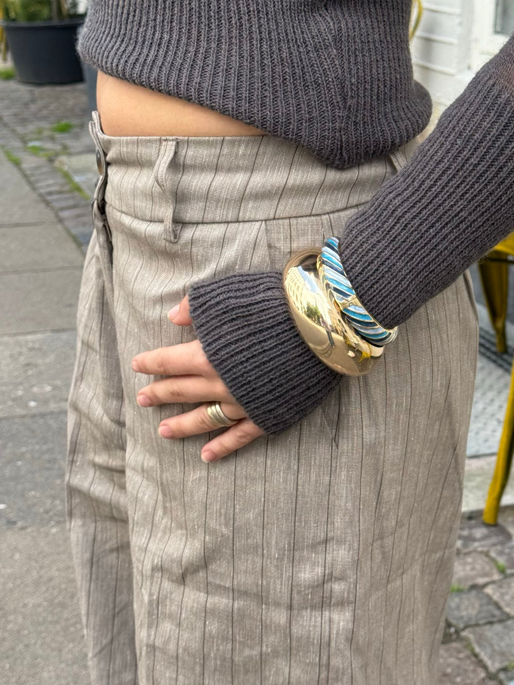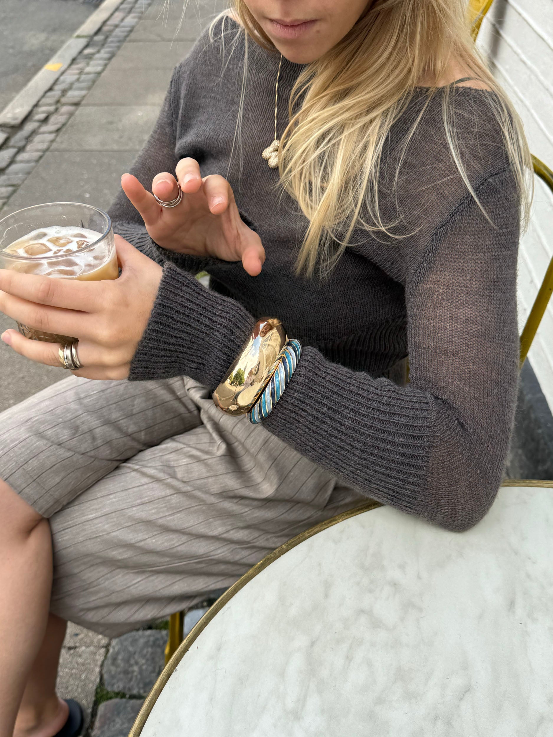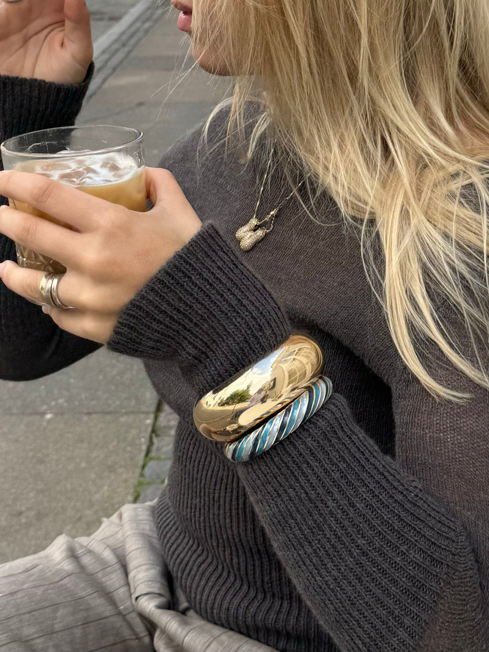 A distinctive cuff bracelet in golden metal featuring curved color segments in various shades of blue. The sculptural and organic design gives the bracelet a unique and eye-catching expression. Perfect as a statement accessory for both everyday wear and festive occasions.