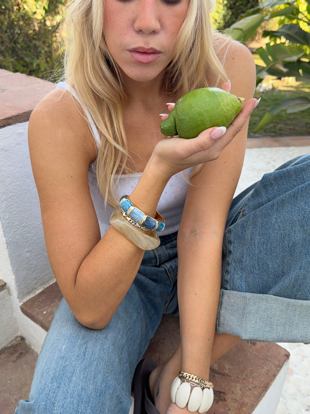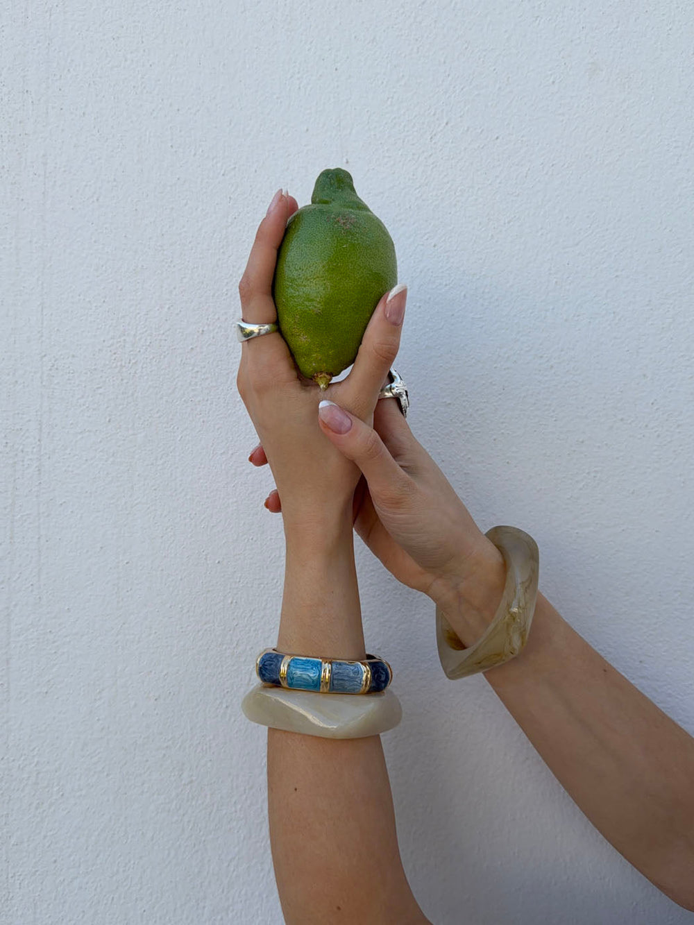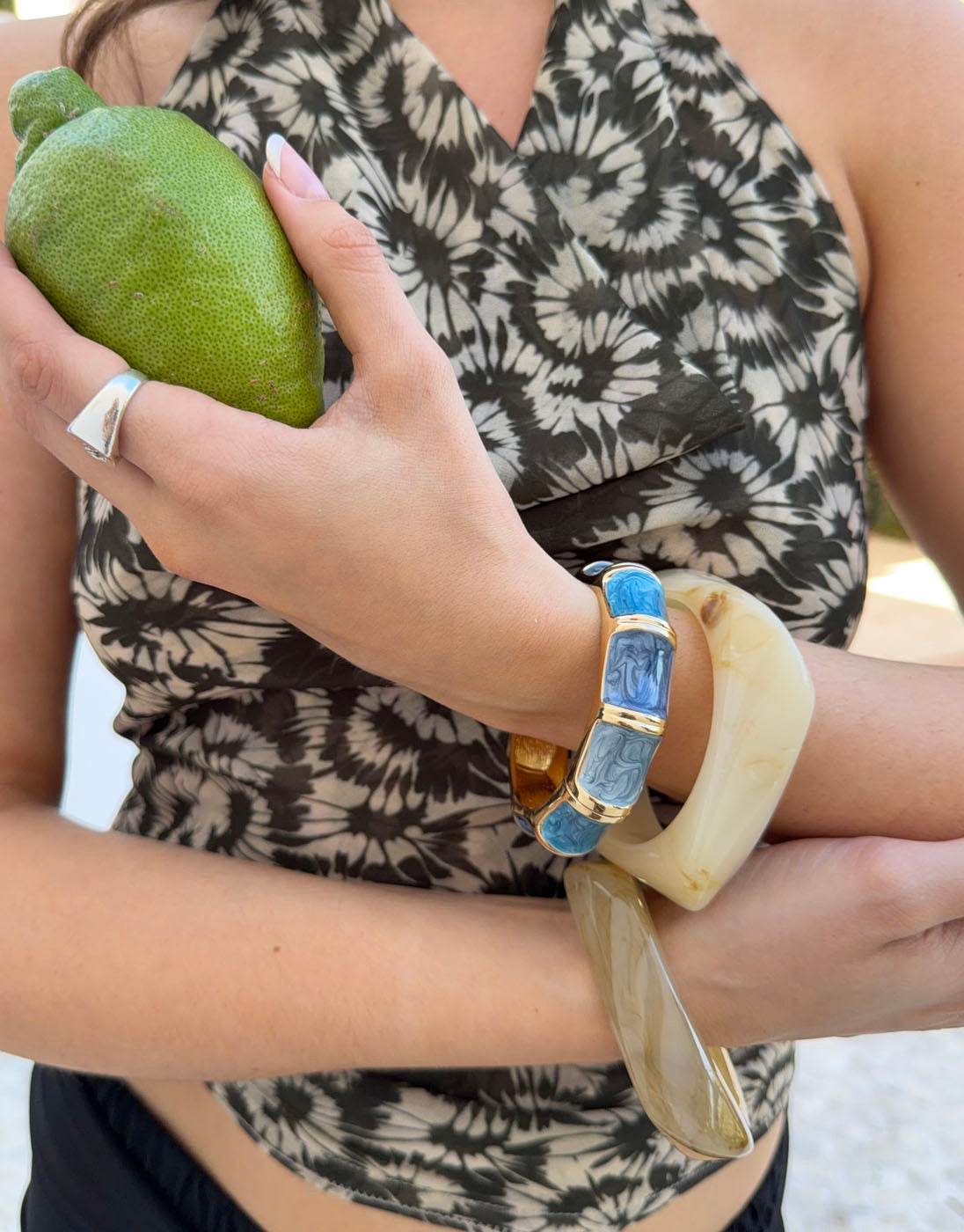 A distinctive bangle bracelet crafted from golden metal with curved color segments in shades of pink, blue, and white. the design is sculptural and organic, giving the bracelet a unique and eye-catching look. perfect as a statement accessory for both everyday wear and festive occasions.