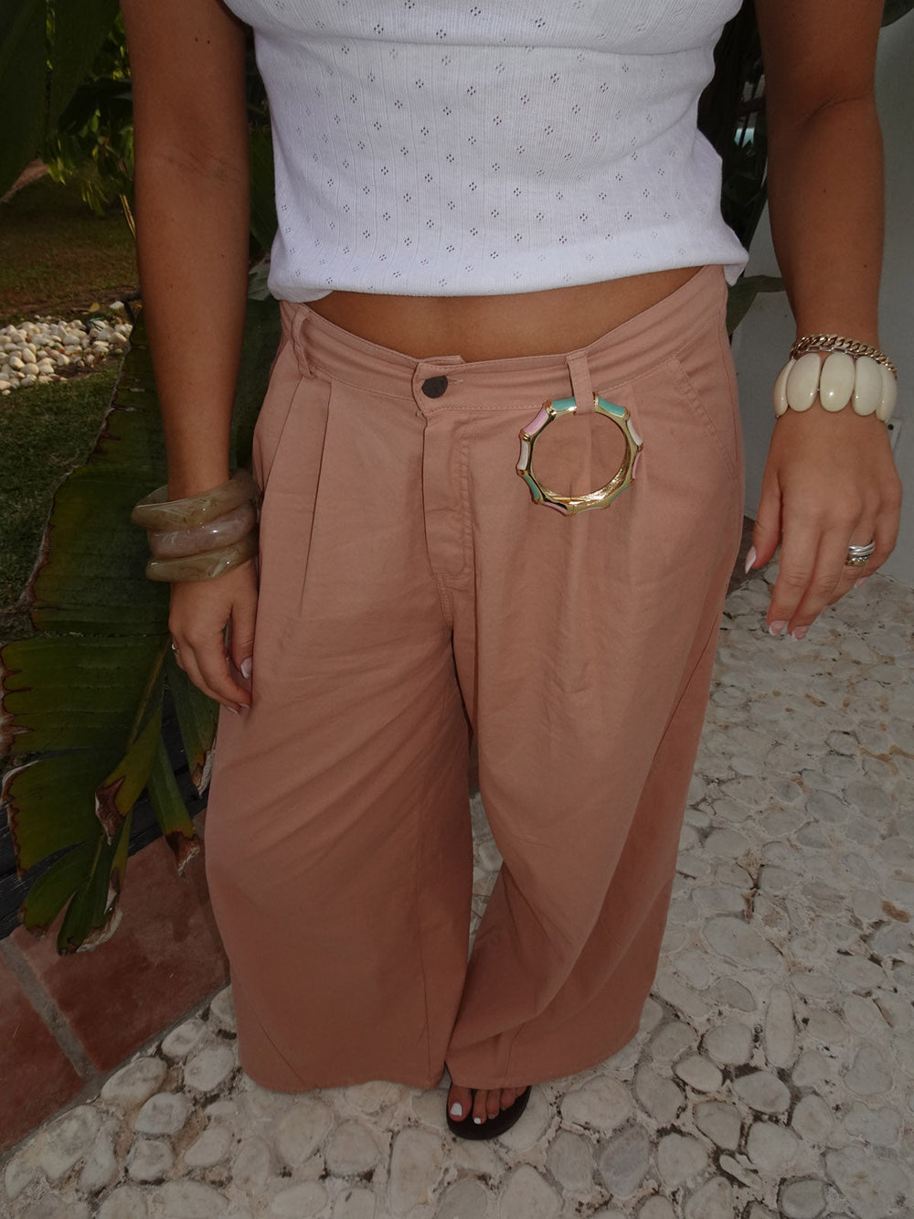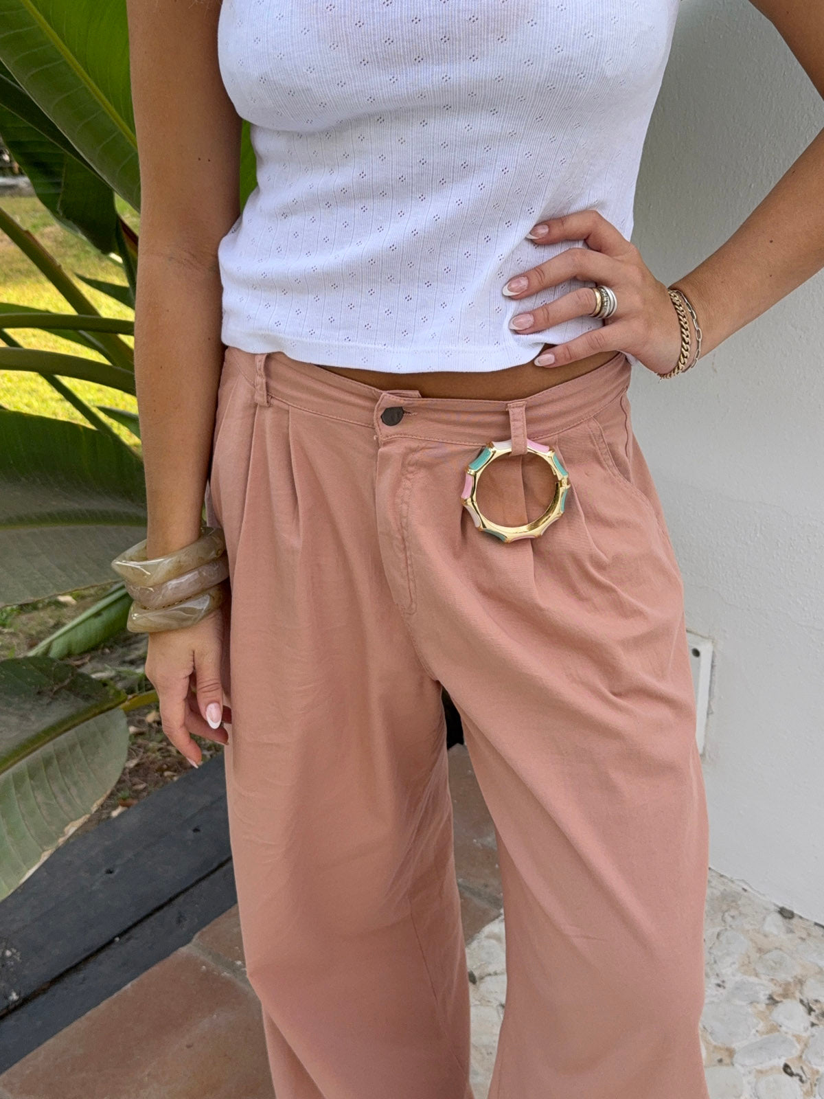 A distinctive bangle bracelet crafted from golden metal with curved color segments in shades of pink, blue, and white. The design is sculptural and organic, giving the bracelet a unique and eye-catching look. Perfect as a statement accessory for both everyday wear and festive occasions.