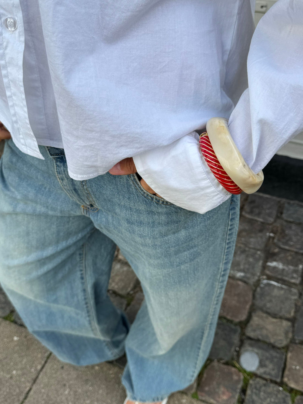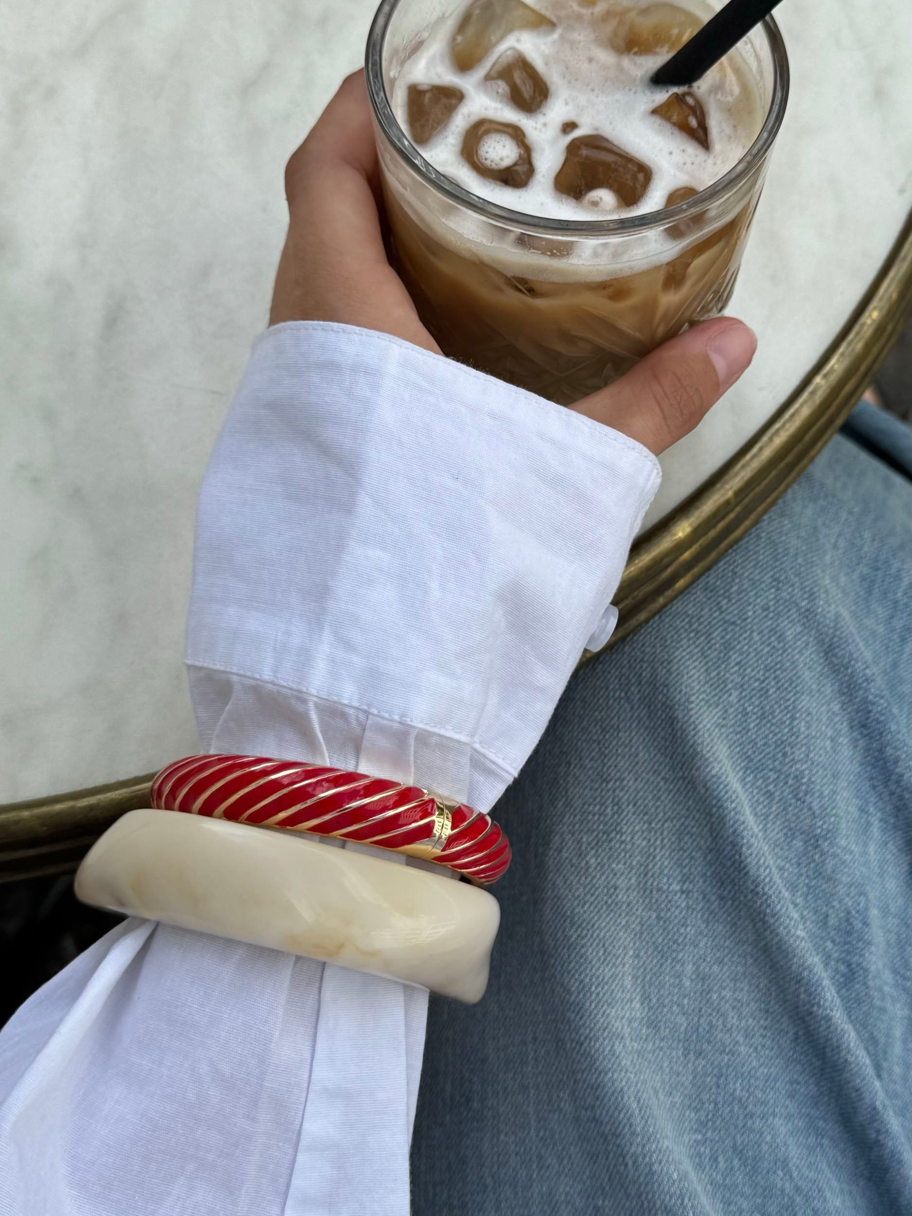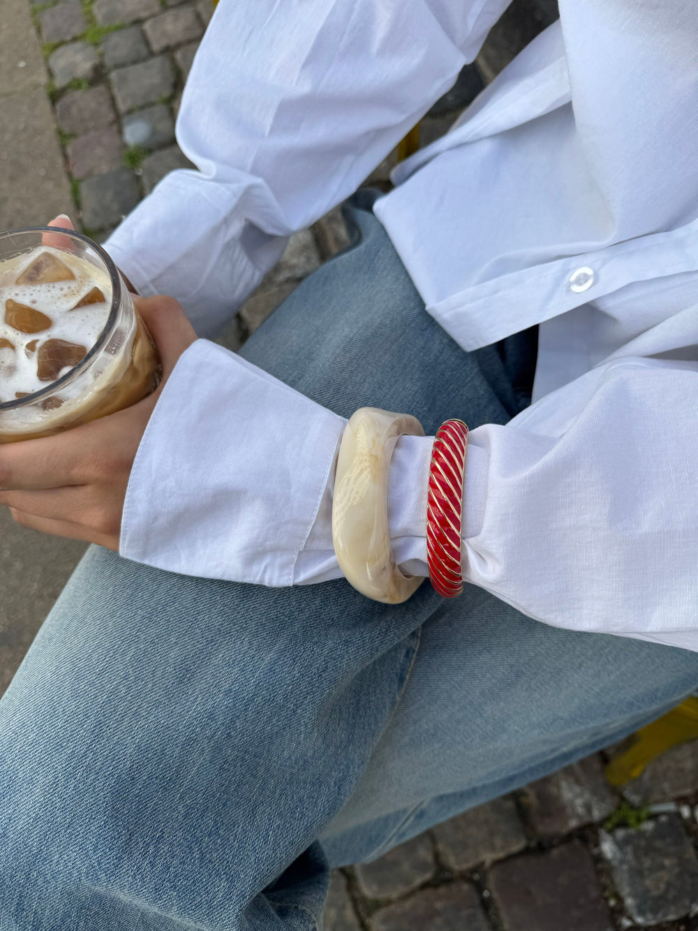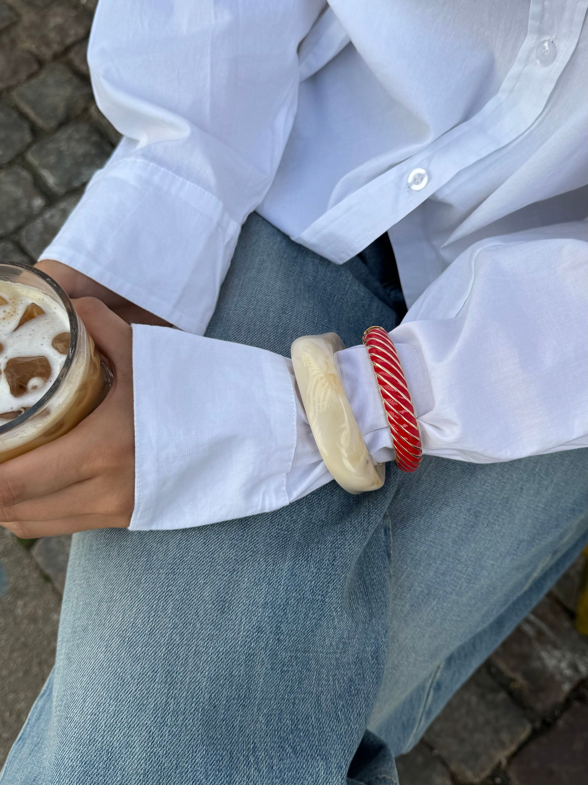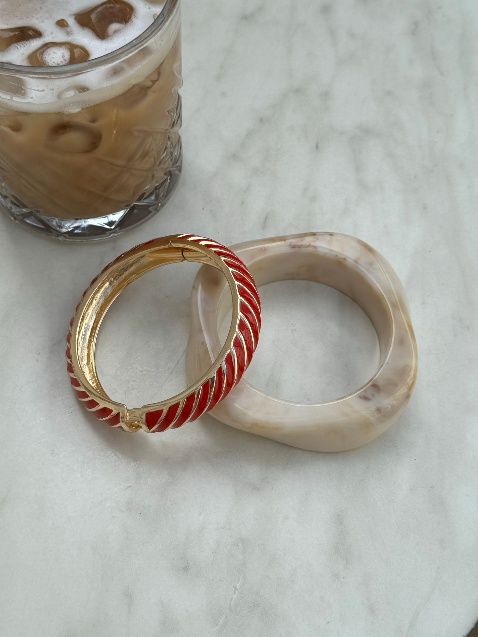 A distinctive bangle-style bracelet in golden metal with curved color segments in rich red and gold. The sculptural, organic design creates a unique and eye-catching look. Perfect as a statement accessory for both everyday wear and festive occasions.