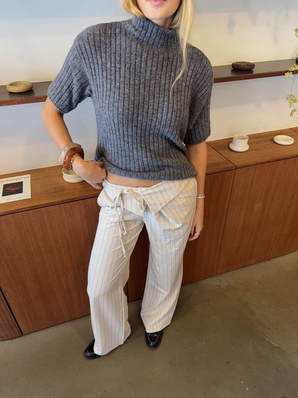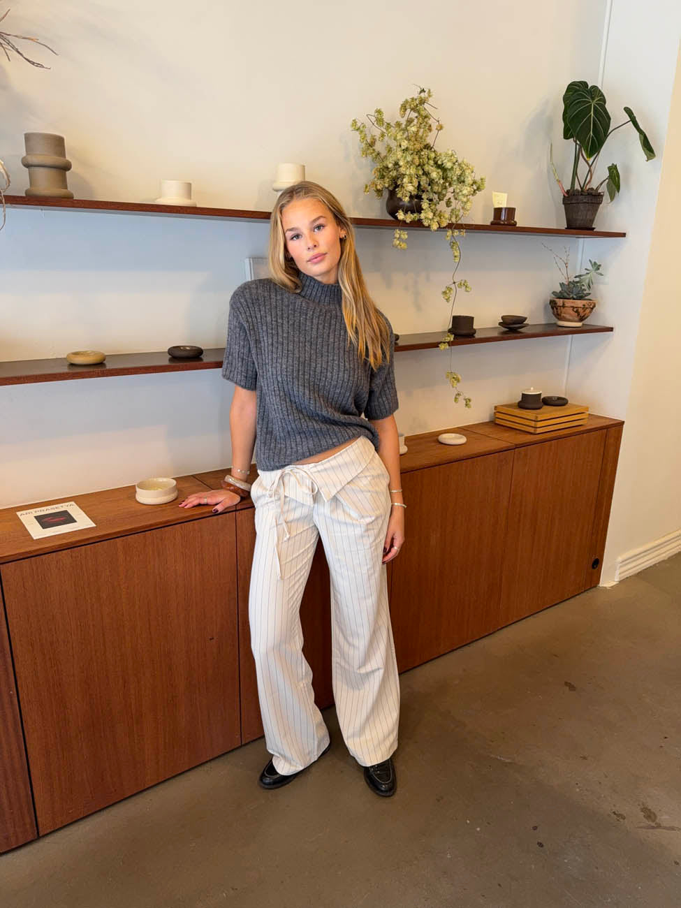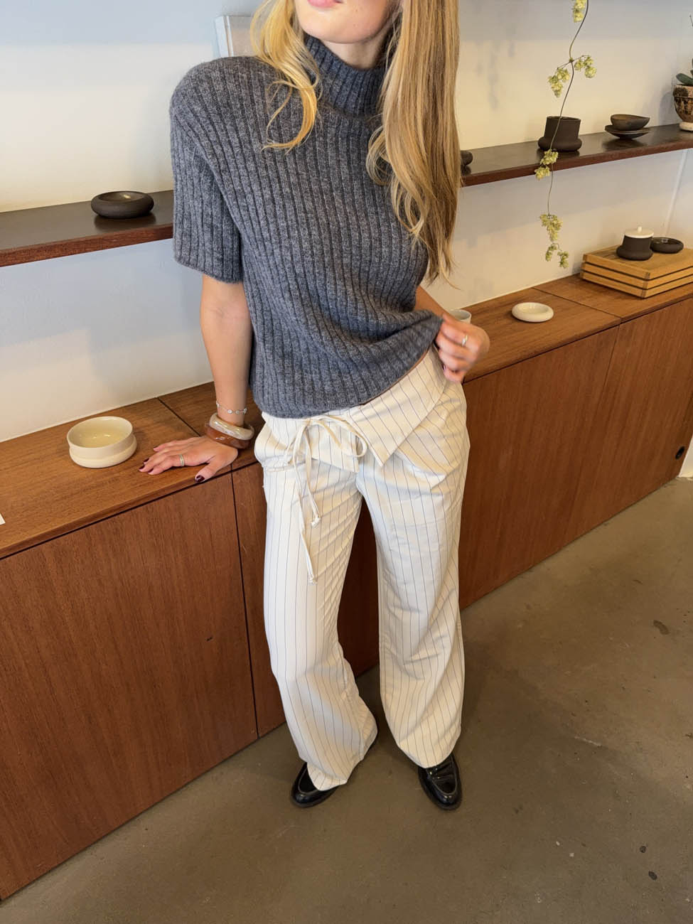 These loose striped suit trousers are an elegant alternative to classic dress pants. The subtle folded edge along the waistband sets them apart from traditional suit styles, adding a sophisticated and festive touch. The trousers feature a relaxed fit that combines comfort with style and include a tie detail on the left side for an extra refined finish.