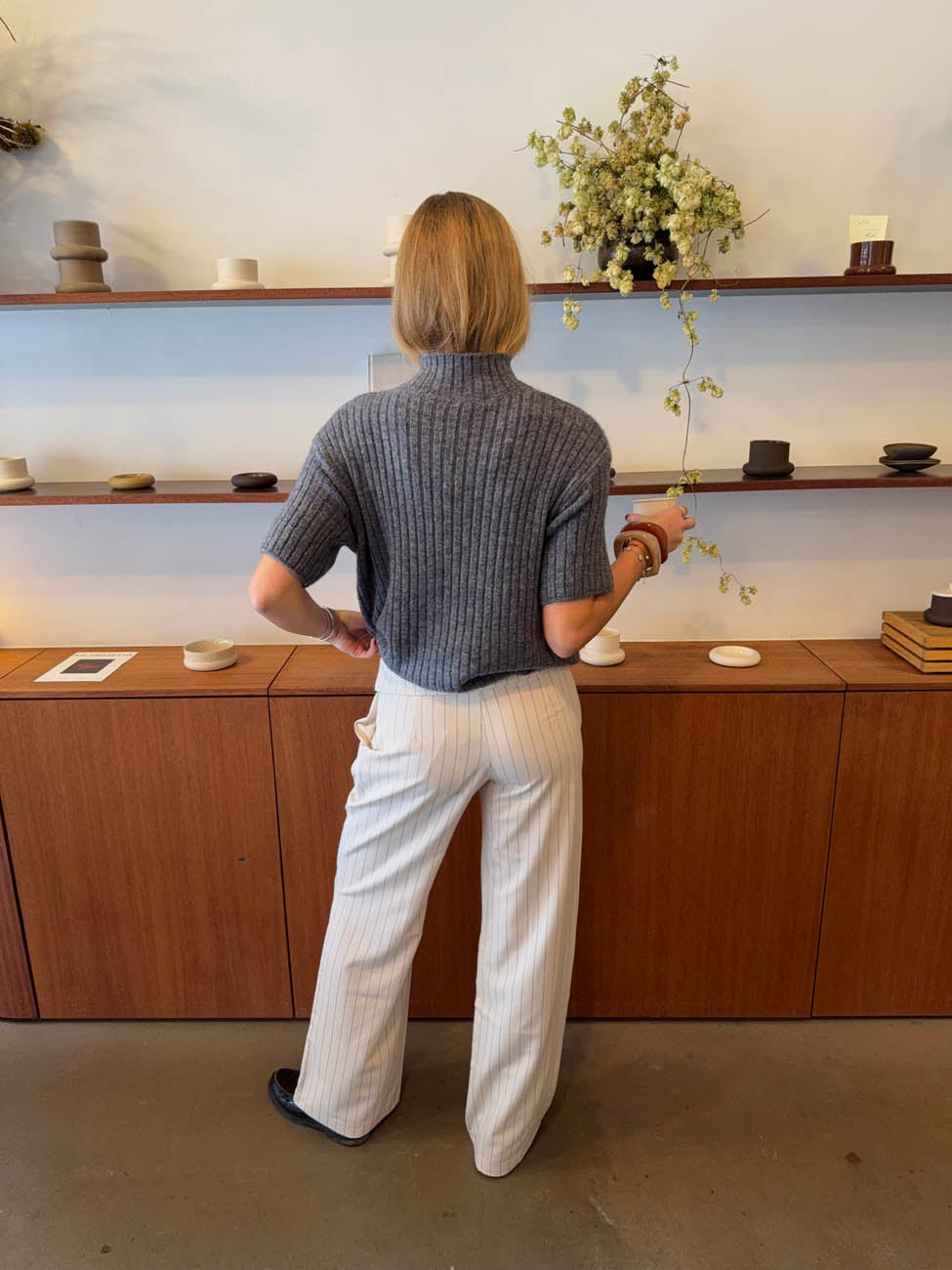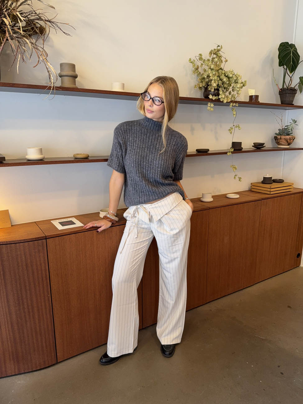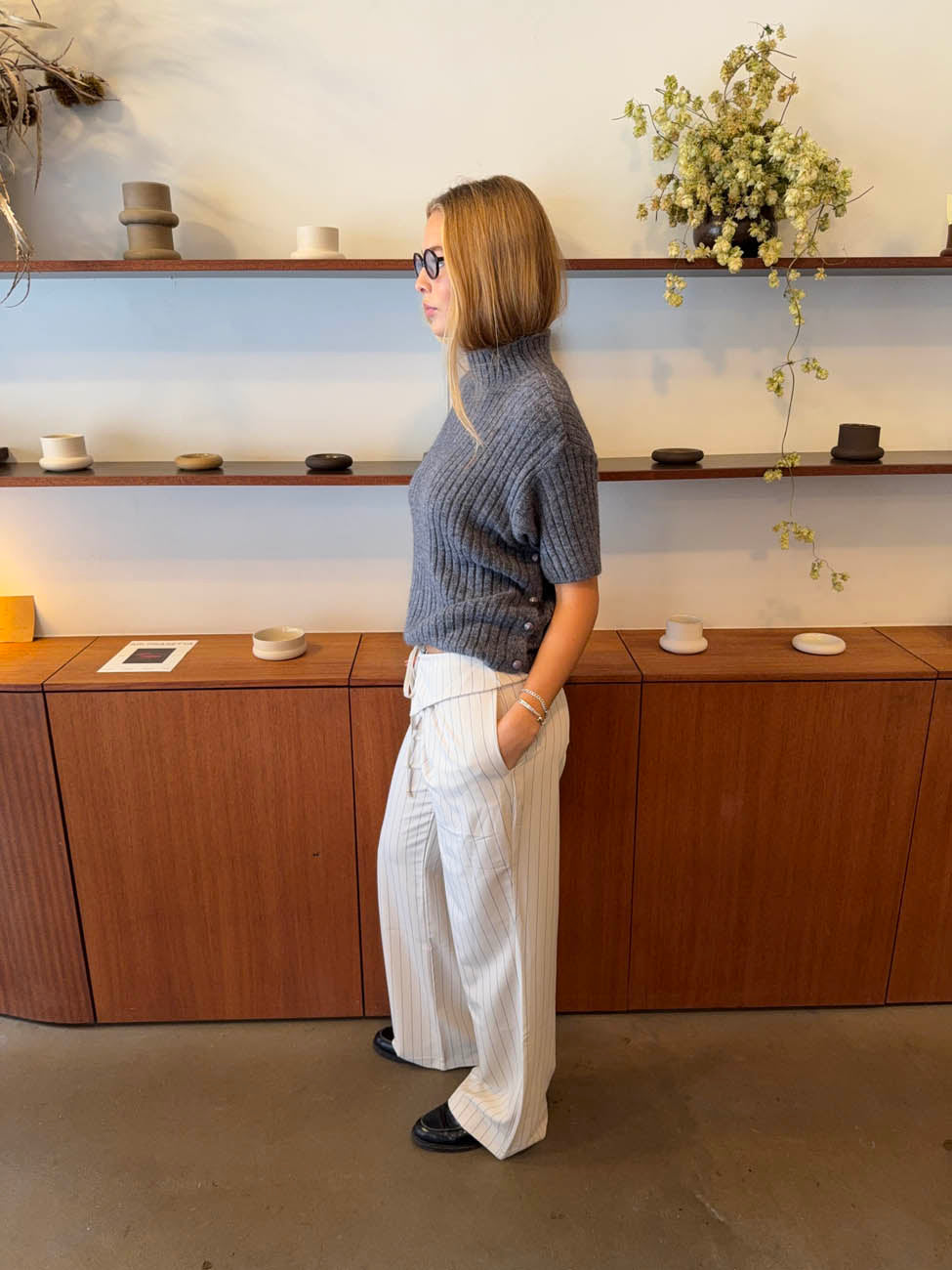 These loose striped suit trousers are an elegant alternative to classic dress pants. The subtle folded edge along the waistband sets them apart from traditional suit styles, adding a sophisticated and festive touch. The trousers feature a relaxed fit that combines comfort with style and include a tie detail on the left side for an extra refined finish.
