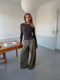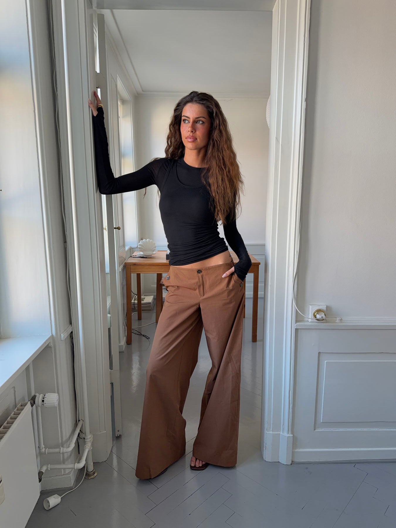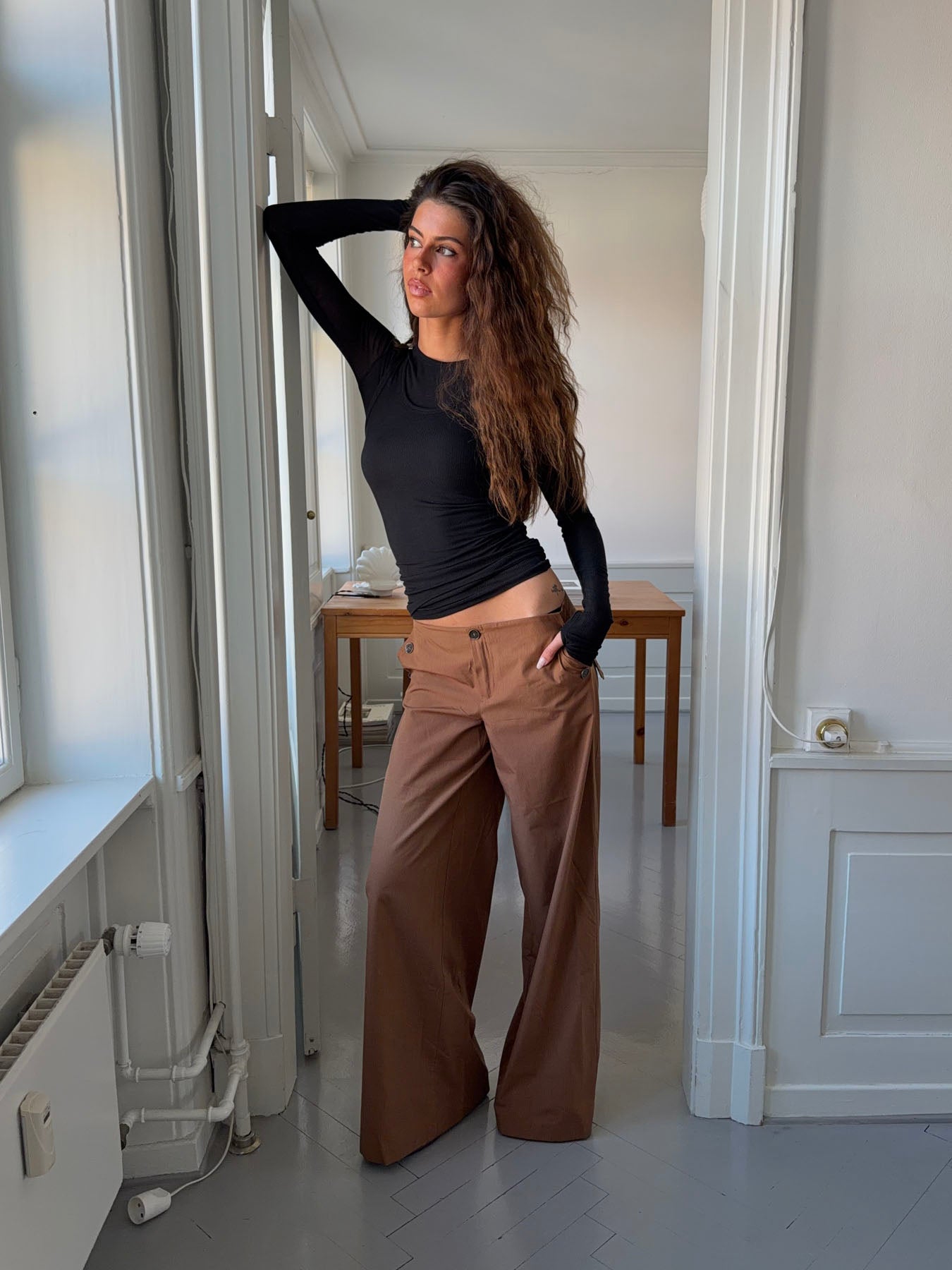Our Maluna trousers offer a sleek and sophisticated look with their fine stripe pattern. The classic design is combined with modern details such as side buttons and a relaxed yet elegant fit.