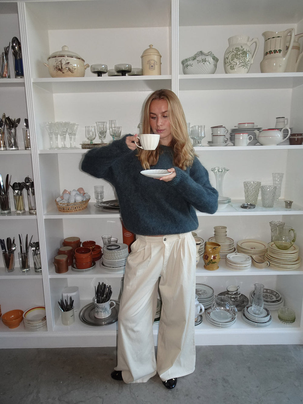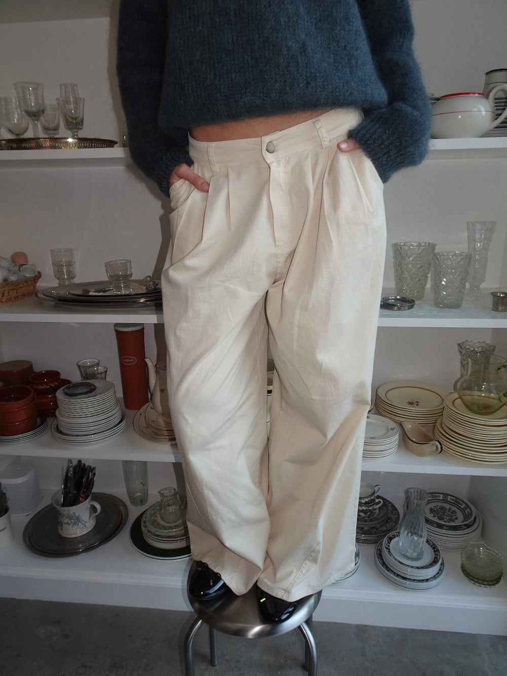 A pair of wide sand-colored trousers with a relaxed yet refined look. Designed with a focus on both comfort and structure, the trousers feature front pleats that add volume and create a beautiful drape. The light, neutral tone makes them easy to style and gives a fresh, minimalist look, whether you’re dressing up or keeping it casual.