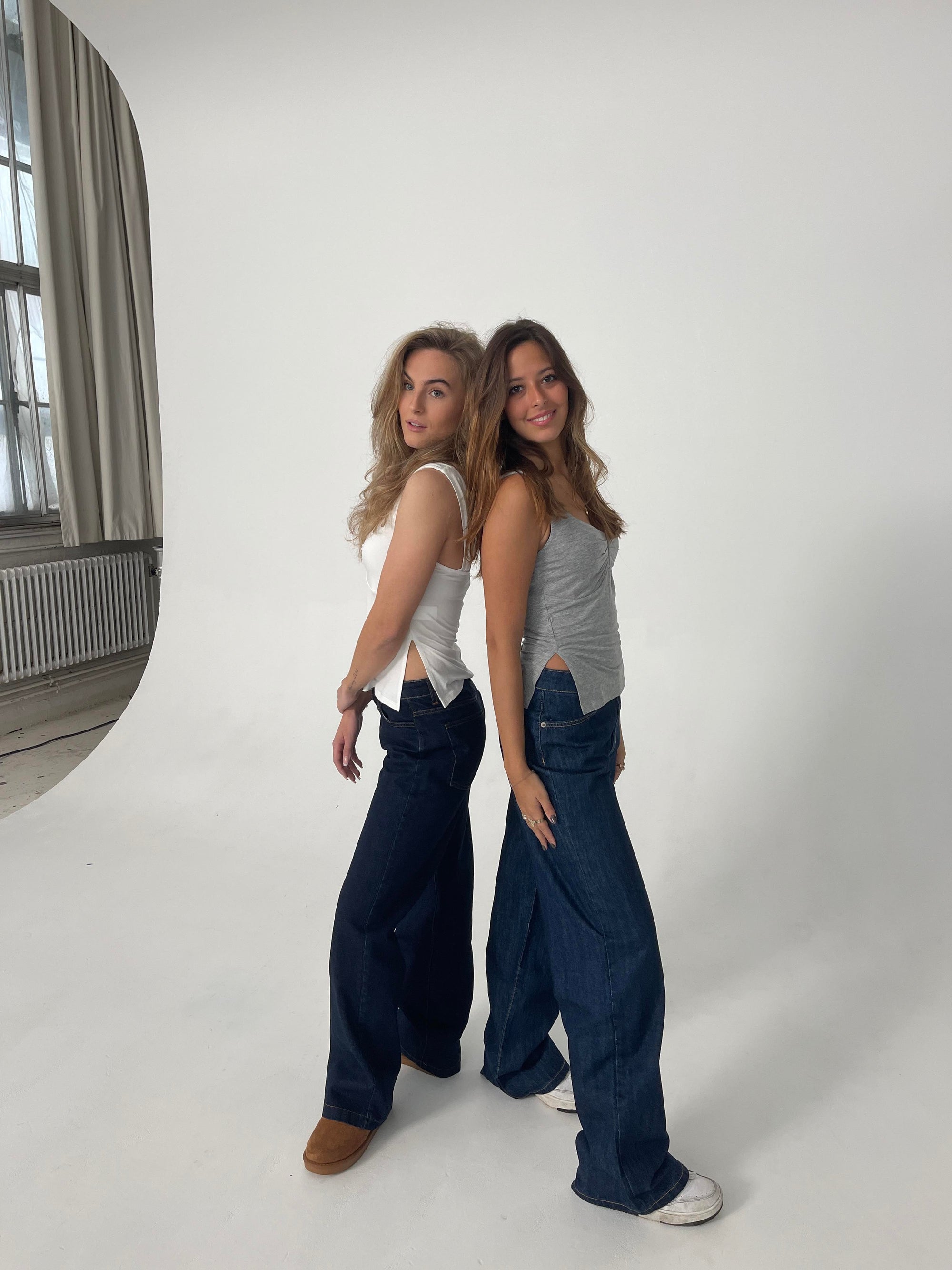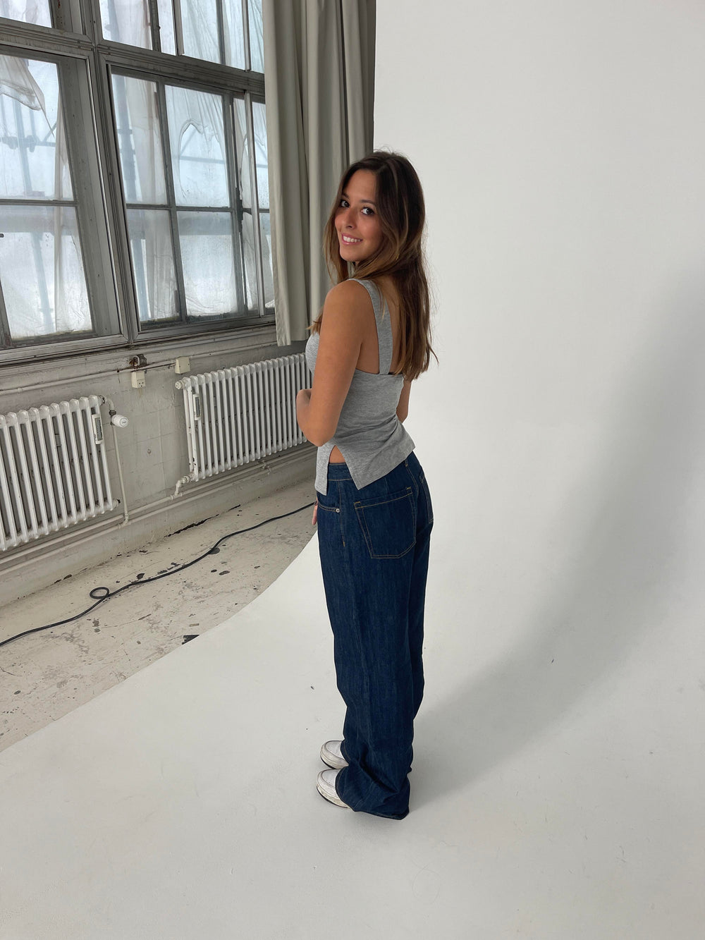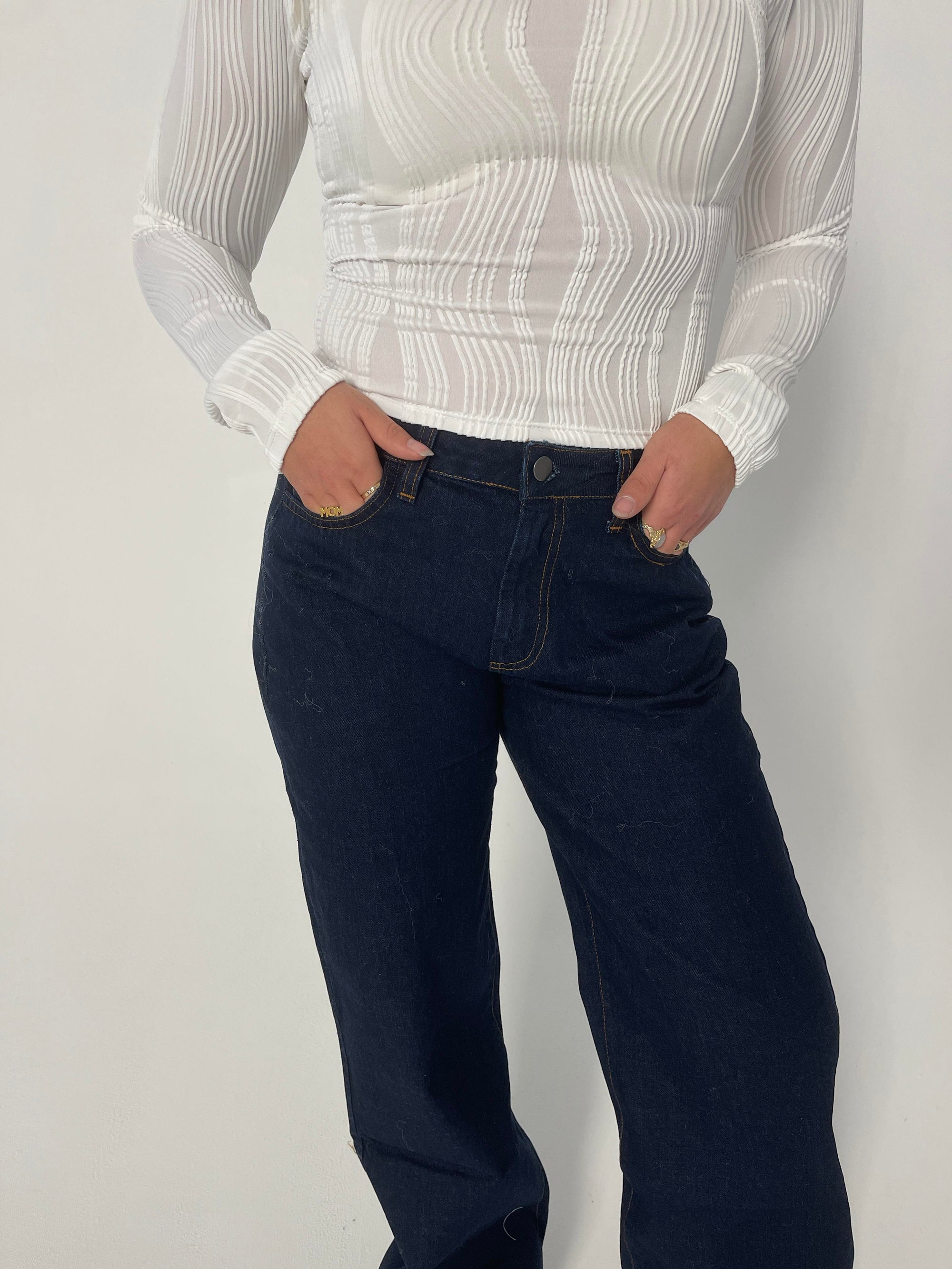 The prettiest wide leg oversized jeans that can be styled both mid- and low waist. These jeans close with a zip and button, and have two front and back pockets.