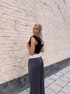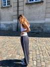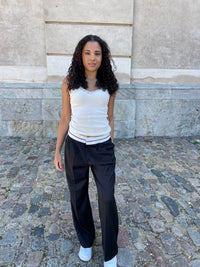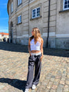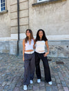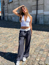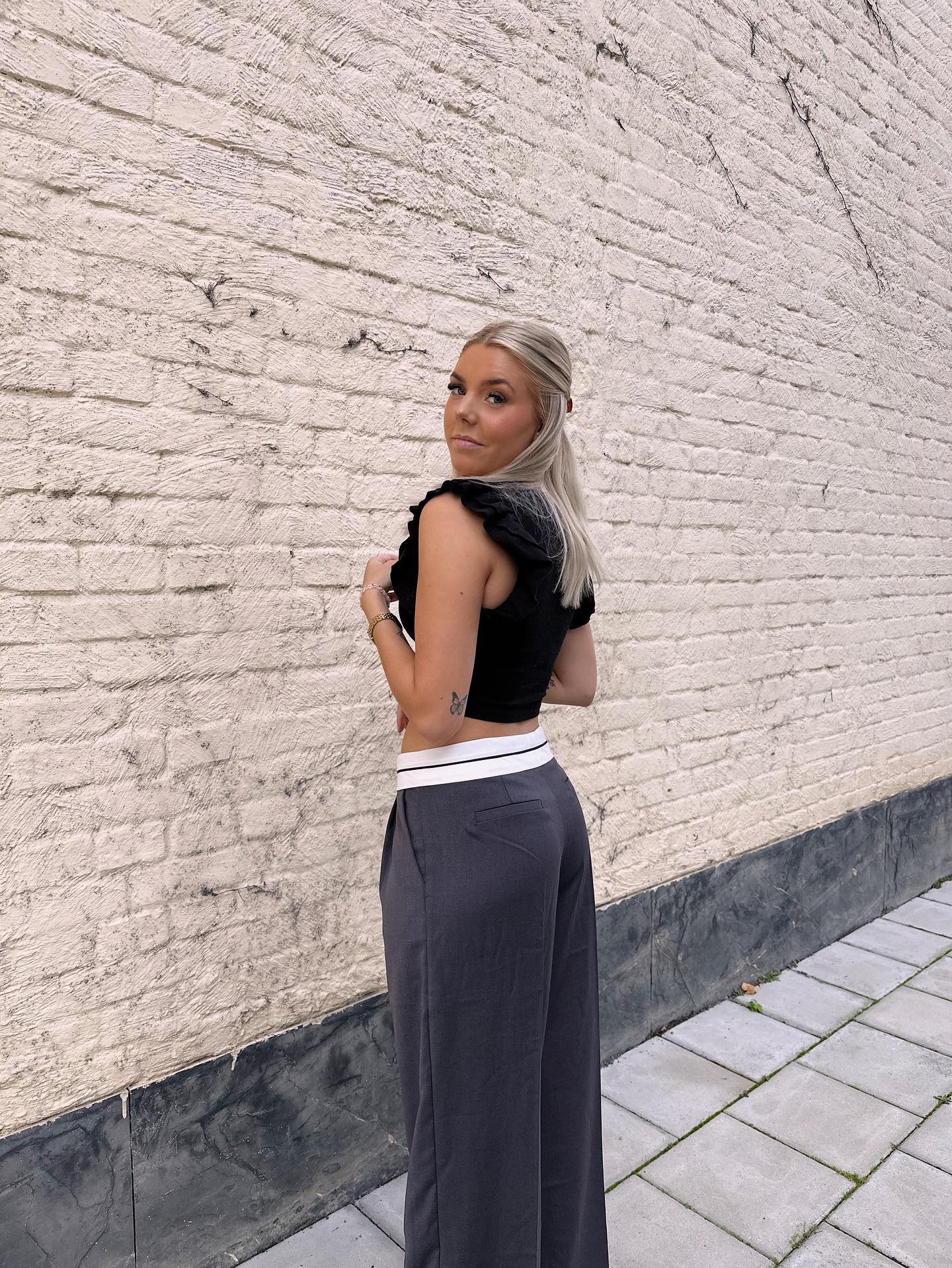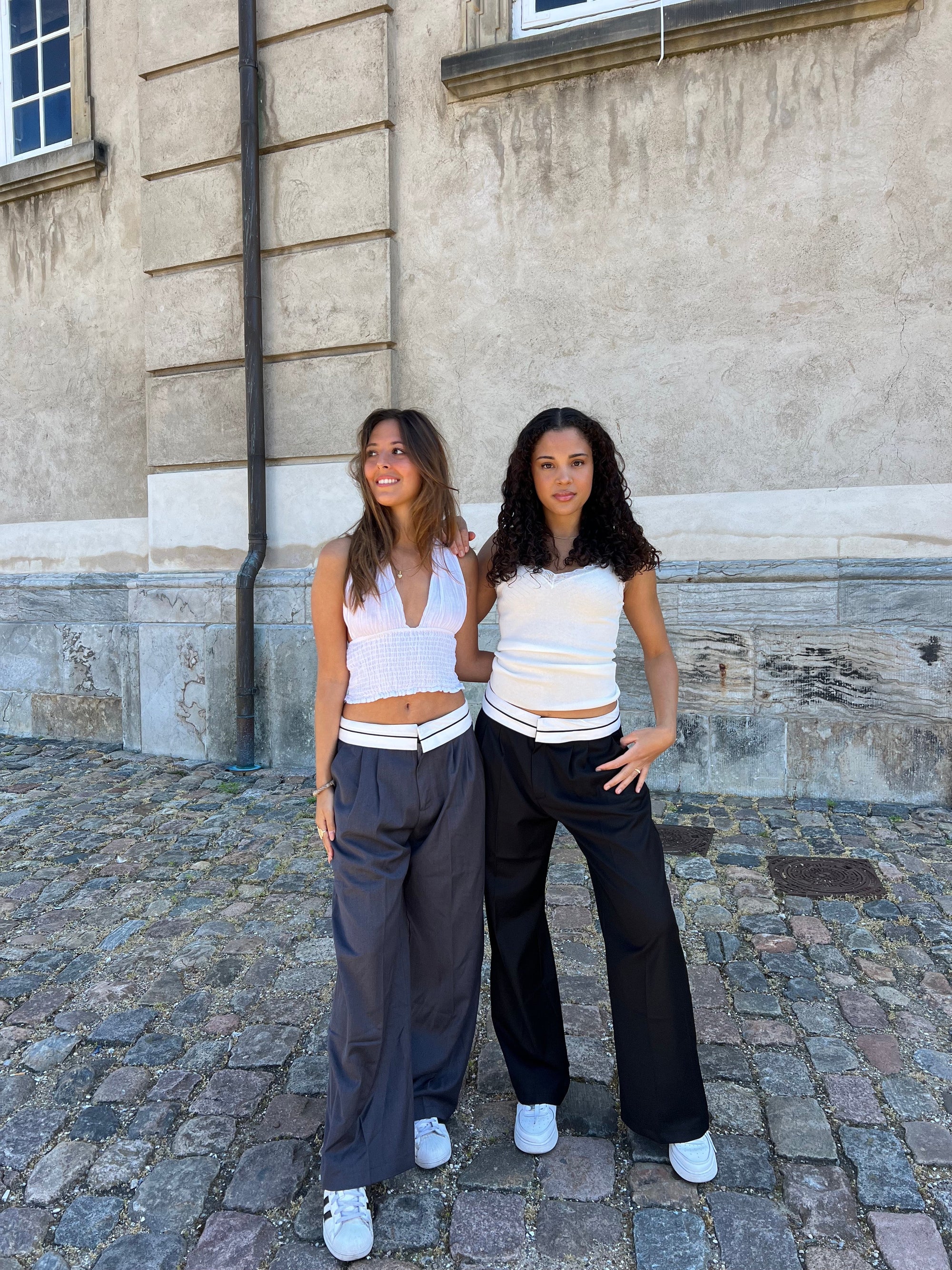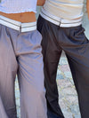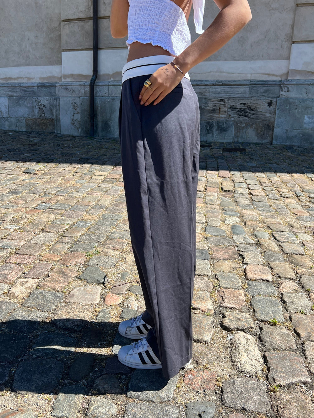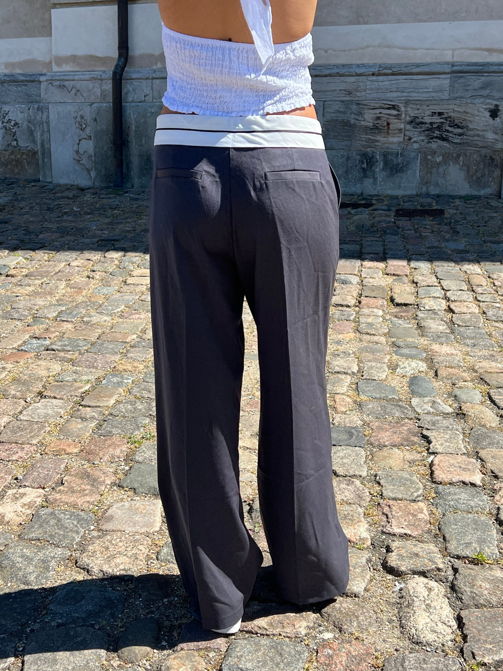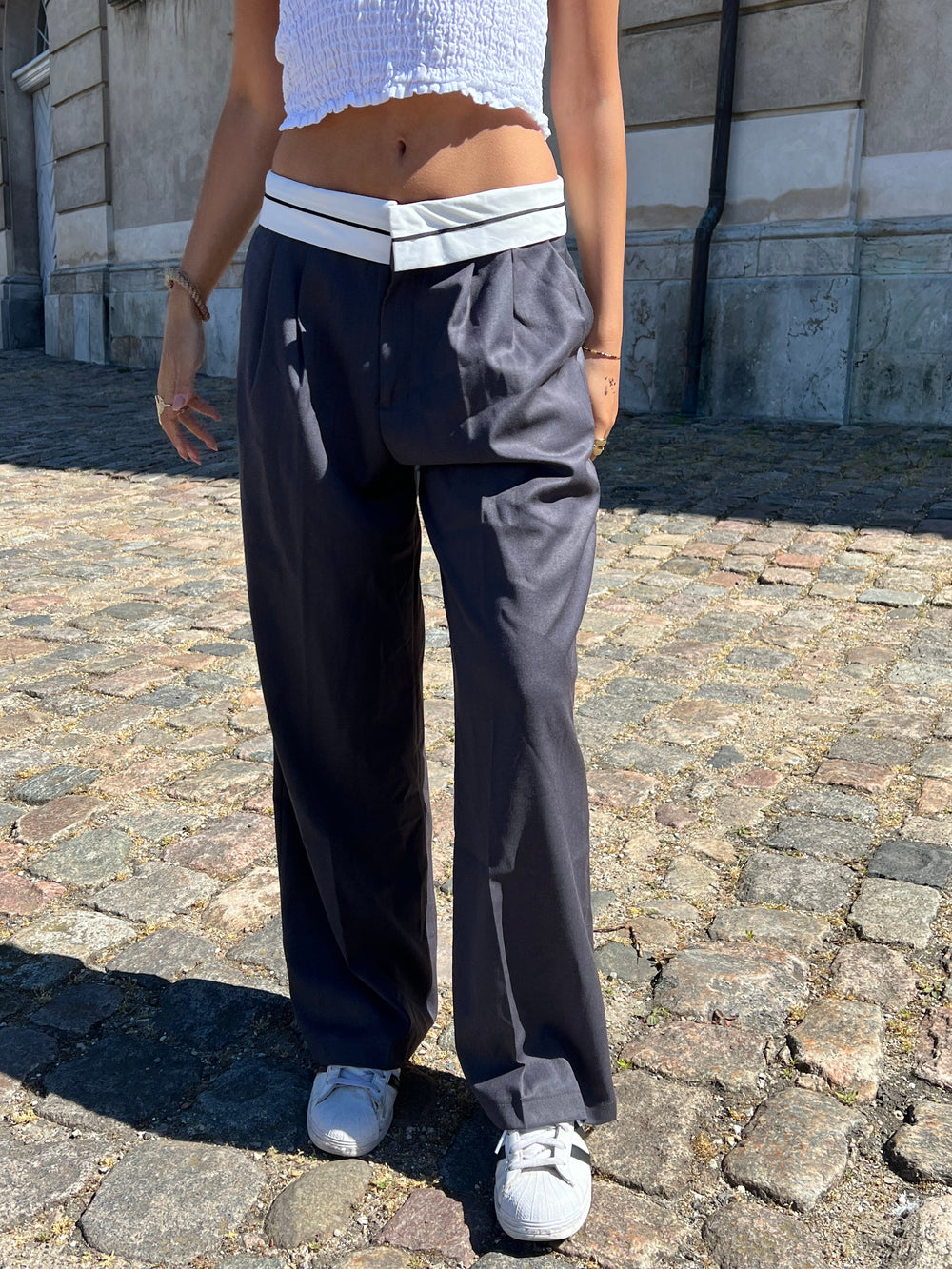 These pants have a wide reverse waistband that has a medium waist fit. The pants have a straight leg and a loose and wide look. They have 2 pockets on each side and 2 decorative pockets at the back.