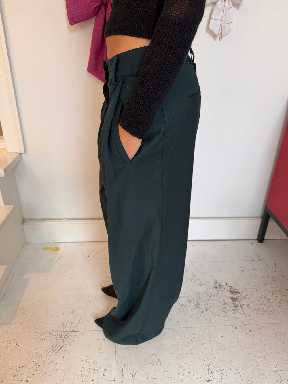 These elegant trousers in a deep dark-green shade combine comfort with classic style in one design. With their smooth fabric and subtly structured look, they can be styled for both everyday wear and more refined occasions.