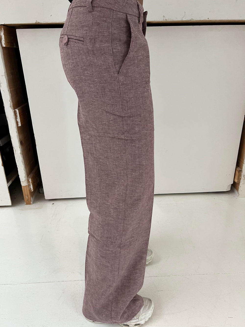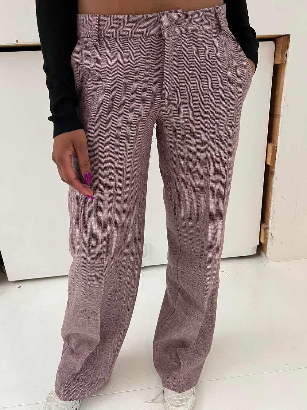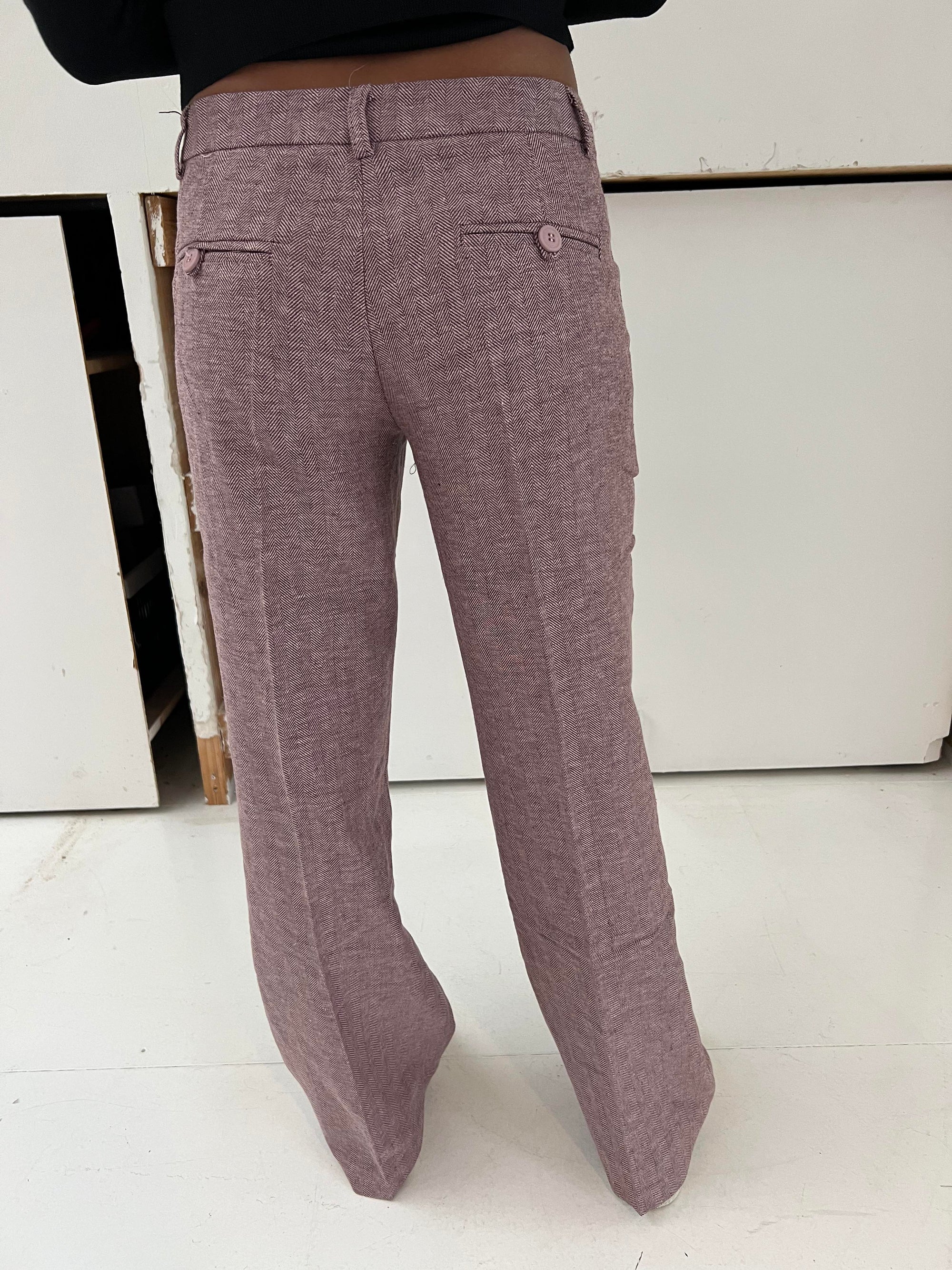 These pants are designed with a herringbone print and have a low waist. The pants have a straight and loose fit, 2 pockets on each side and 2 decorative back pockets. They close with a zipper and a hook-and-eye closure and have belt loops.