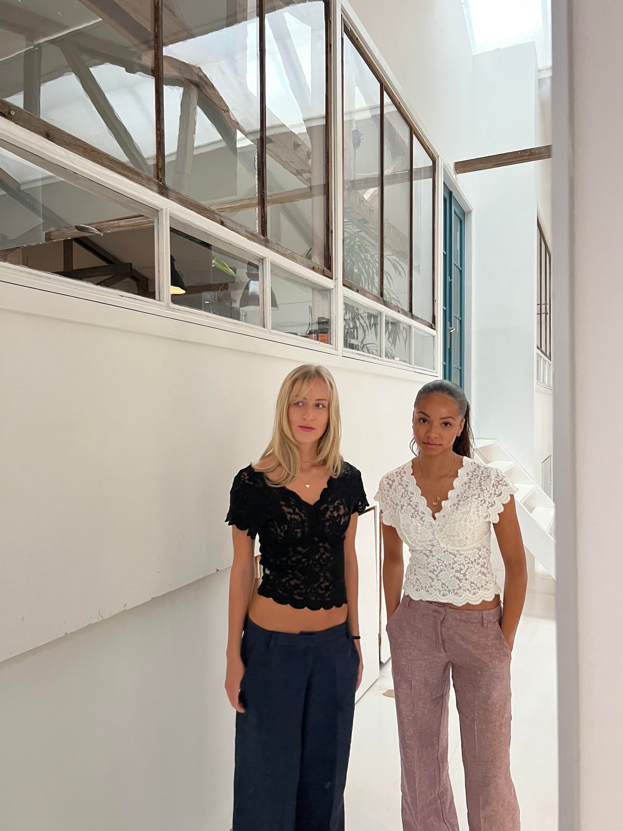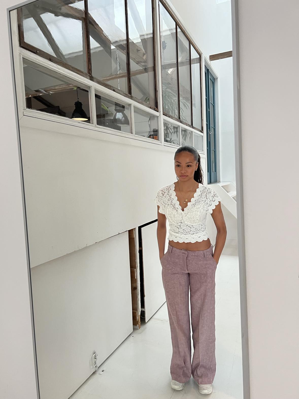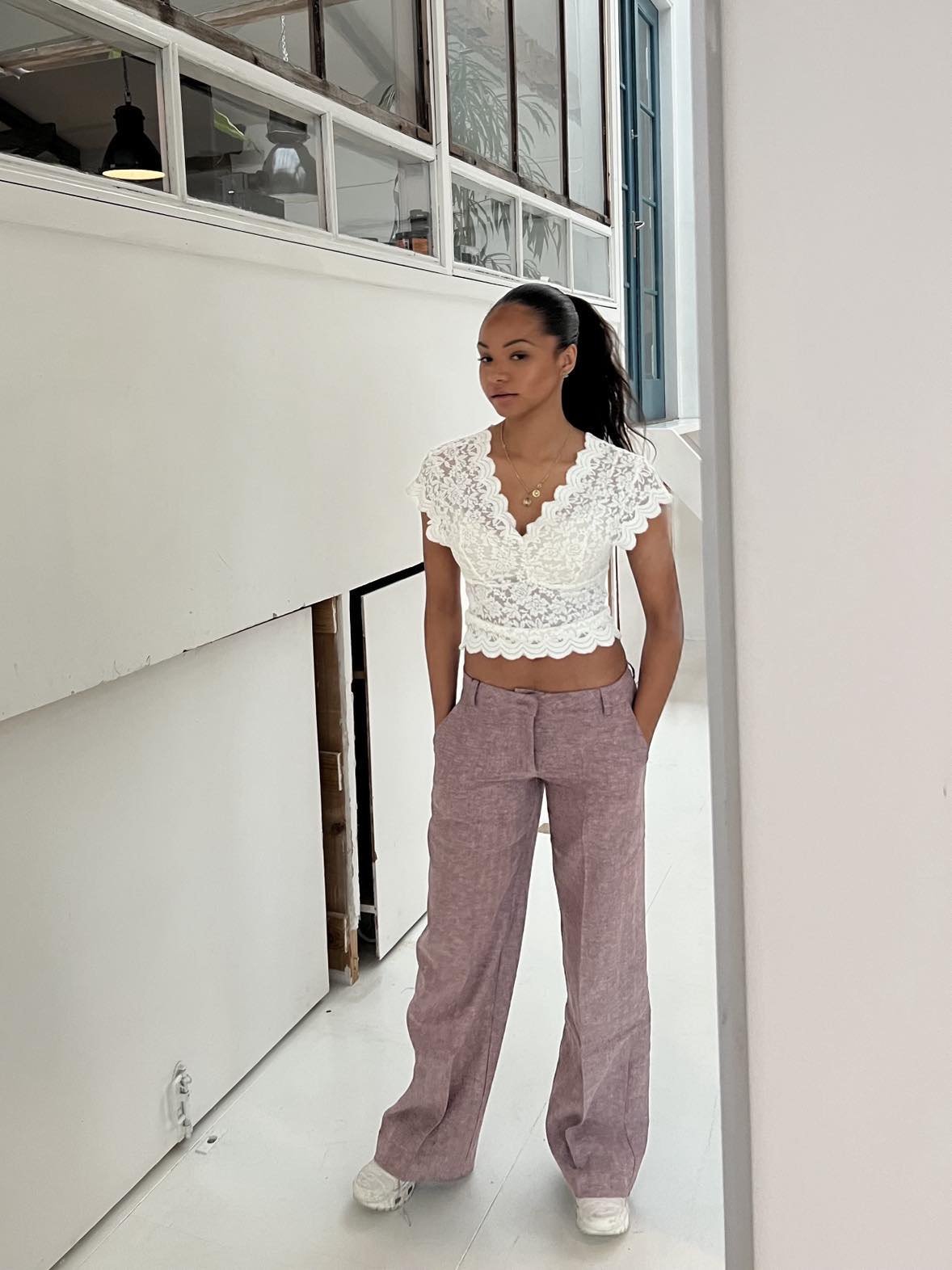 These pants are designed with a herringbone print and have a low waist. The pants have a straight and loose fit, 2 pockets on each side and 2 decorative back pockets. They close with a zipper and a hook-and-eye closure and have belt loops.