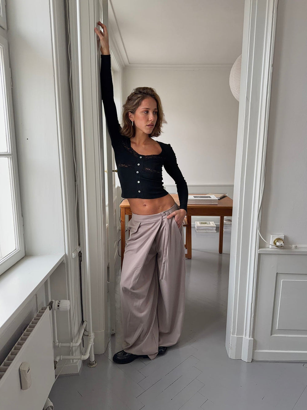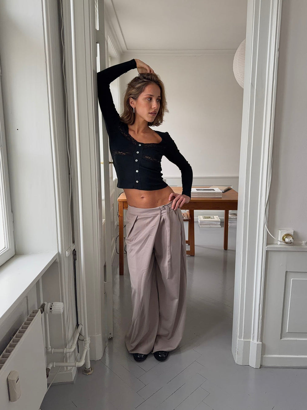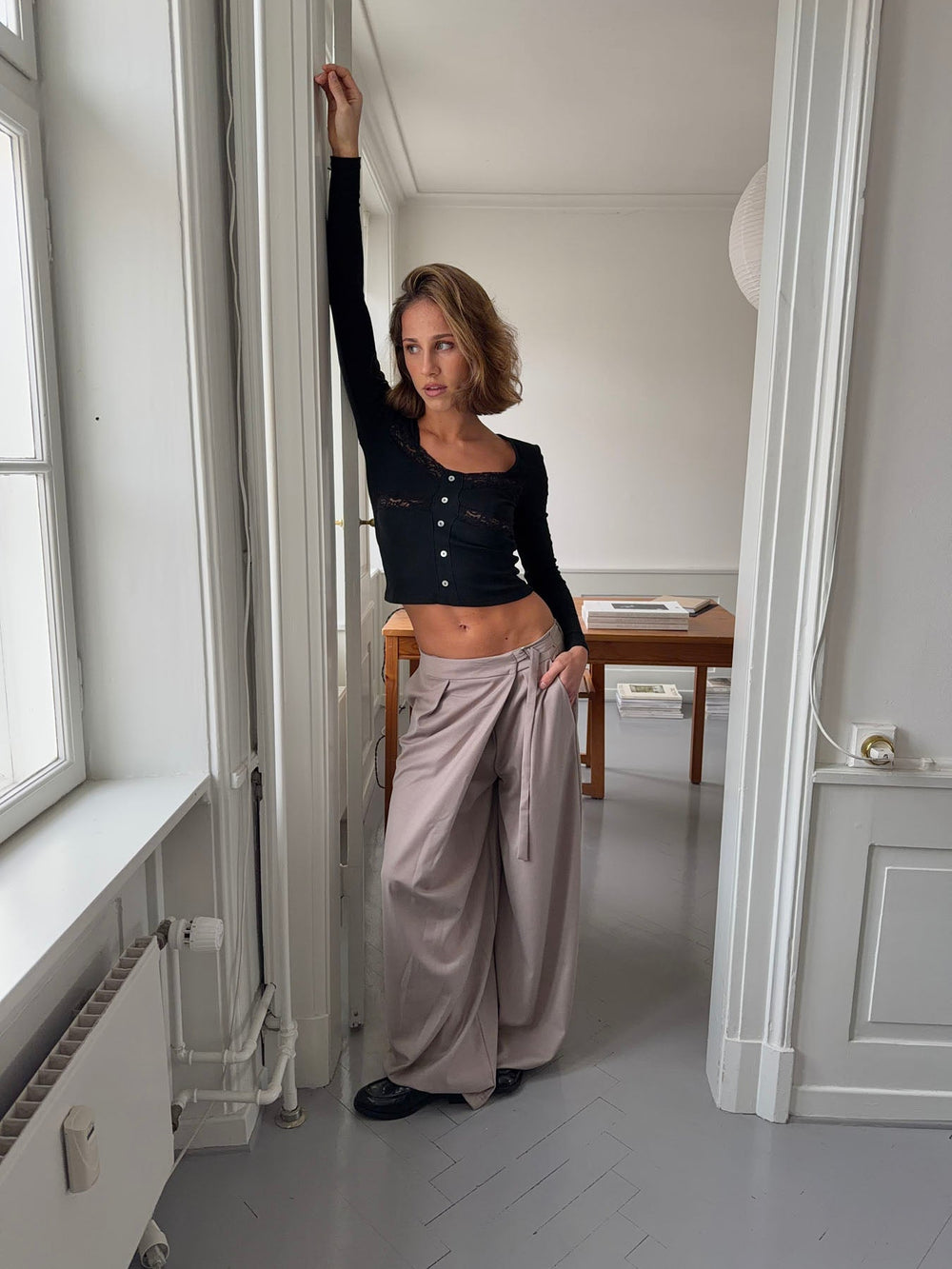 These beige trousers combine classic minimalism with a modern twist. The loose fit and lightweight drape create an elegant look, while the buckle detail at the waist adds a subtle yet sophisticated focal point. A beautiful pleat along the leg gives an exclusive, tailored feel that accentuates the trousers’ clean lines and feminine shape. The soft material ensures comfort throughout the day, and the deep black shade makes them easy to style for both everyday wear and special occasions. A versatile design that blends simplicity, style, and a touch of luxury.