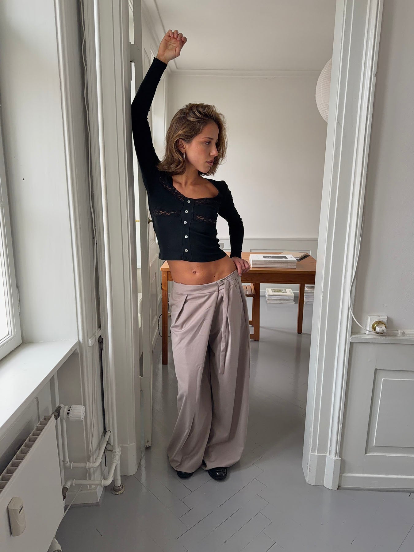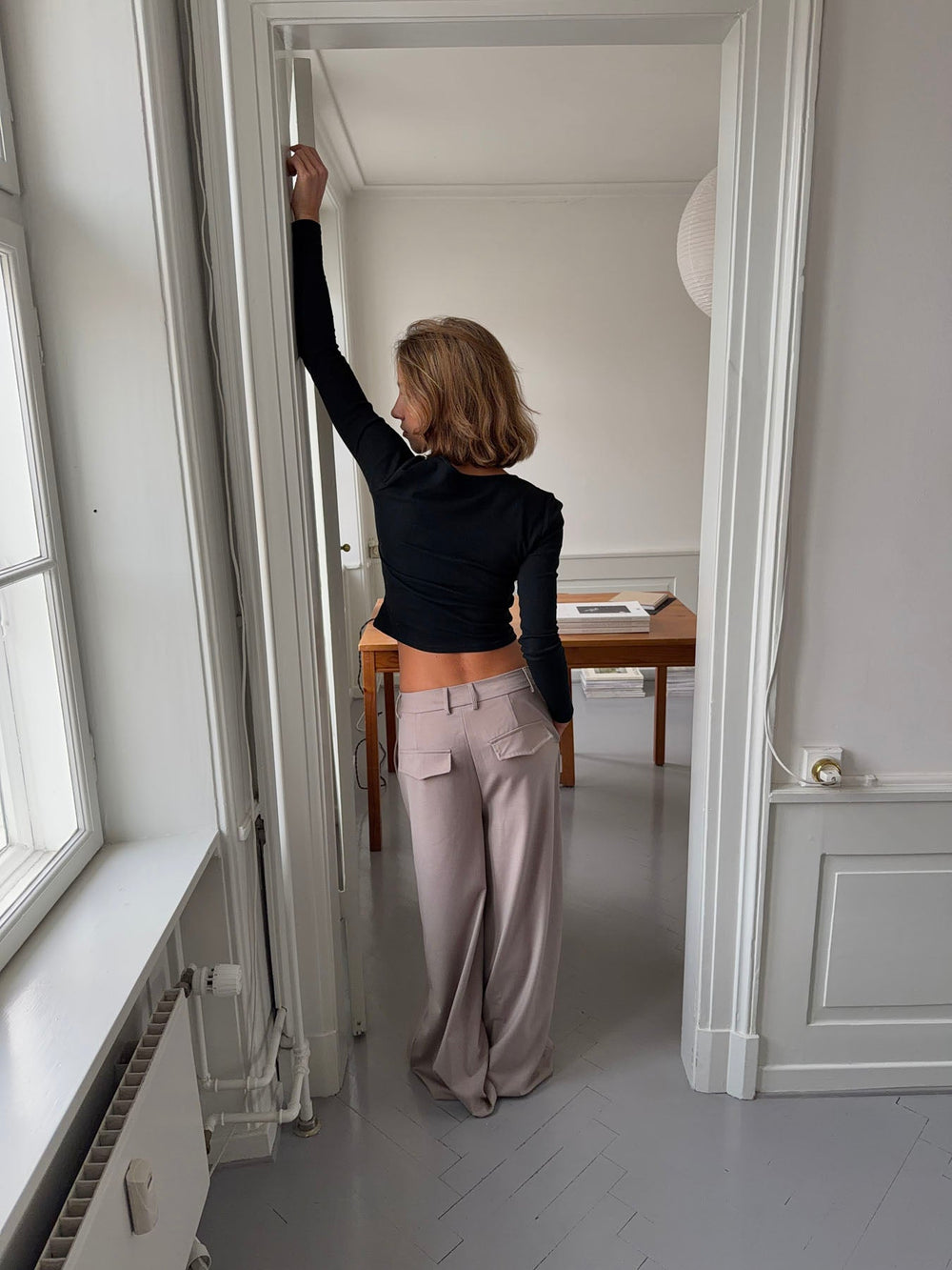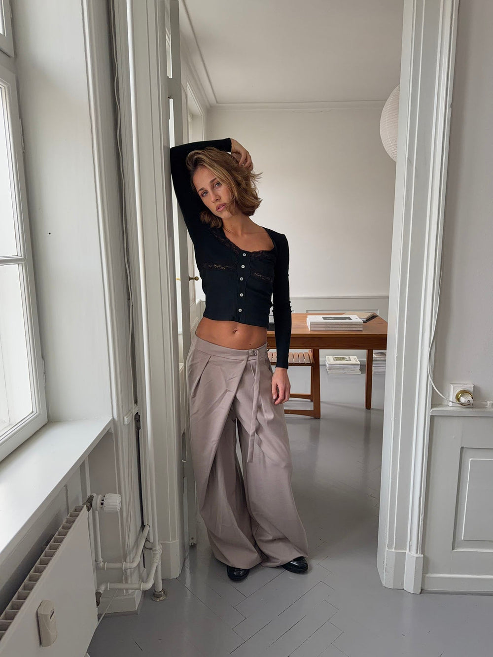These beige trousers combine classic minimalism with a modern twist. The loose fit and lightweight drape create an elegant look, while the buckle detail at the waist adds a subtle yet sophisticated focal point. A beautiful pleat along the leg gives an exclusive, tailored feel that accentuates the trousers’ clean lines and feminine shape. The soft material ensures comfort throughout the day, and the deep black shade makes them easy to style for both everyday wear and special occasions. A versatile design that blends simplicity, style, and a touch of luxury.