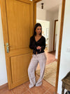 These trousers are designed with a herringbone print and have a low waist. The trousers have a straight and loose fit, and 2 pockets on each side and 2 decorative back pockets. They close with a zip and hook closure and have belt loops.