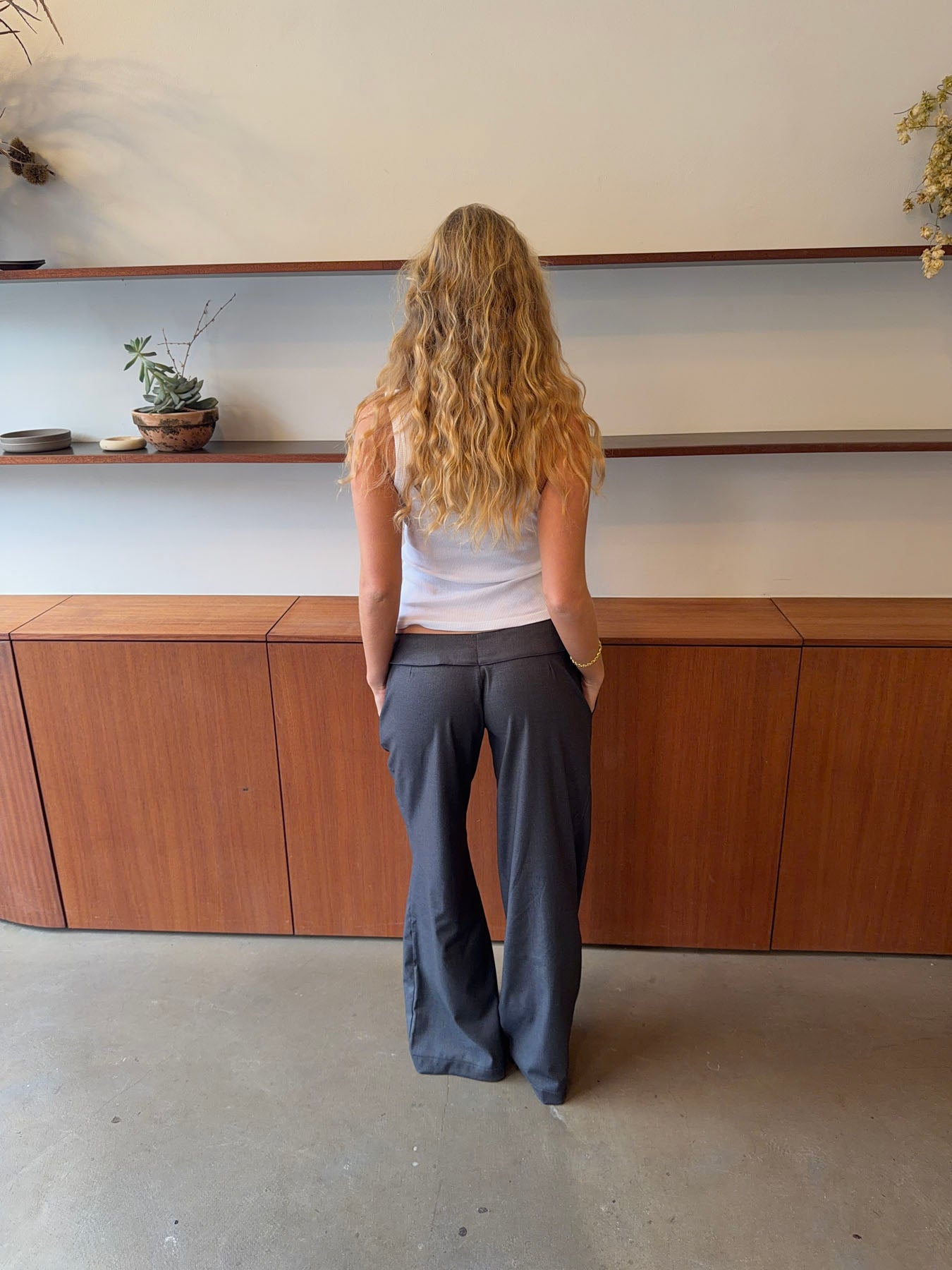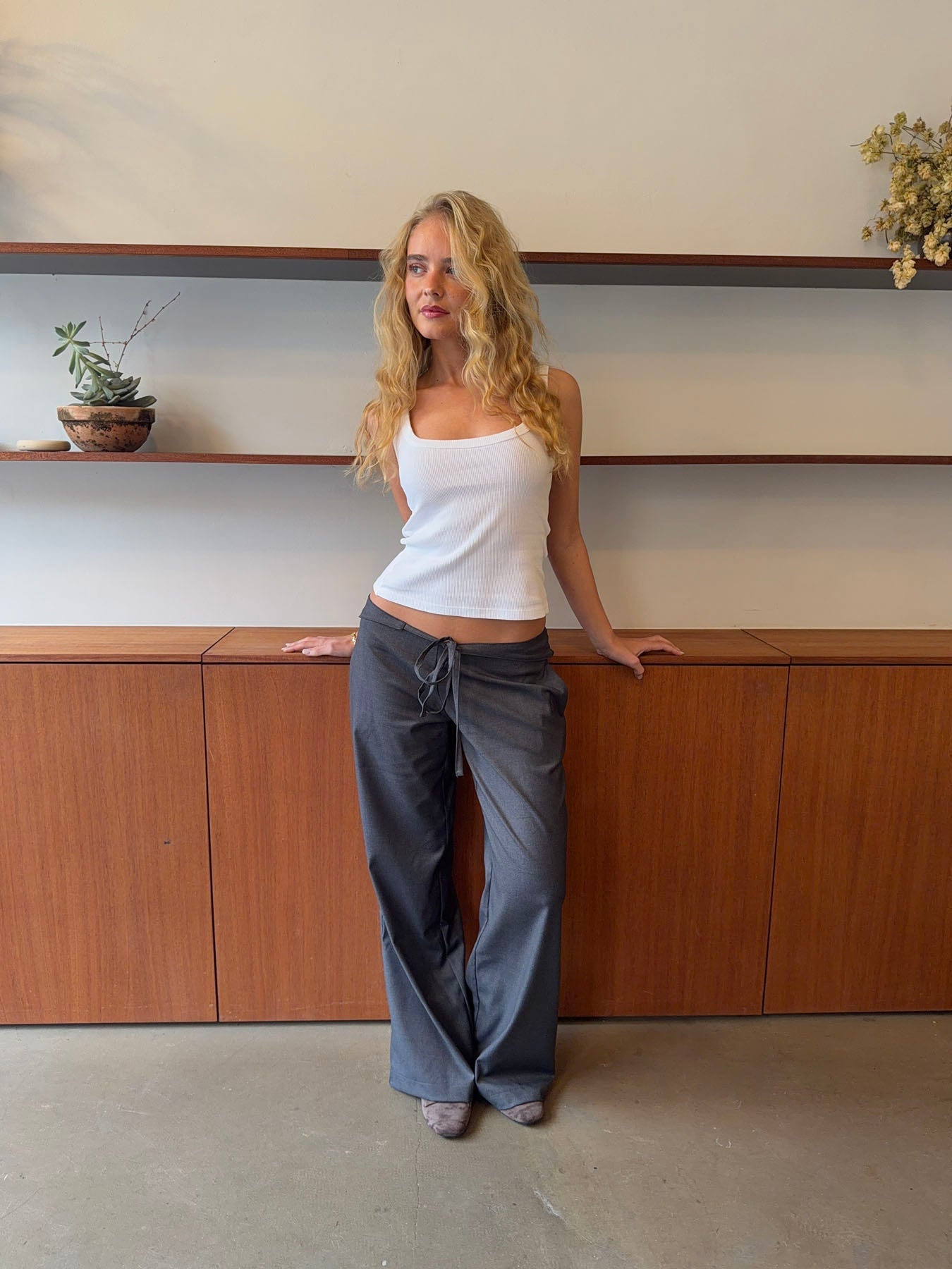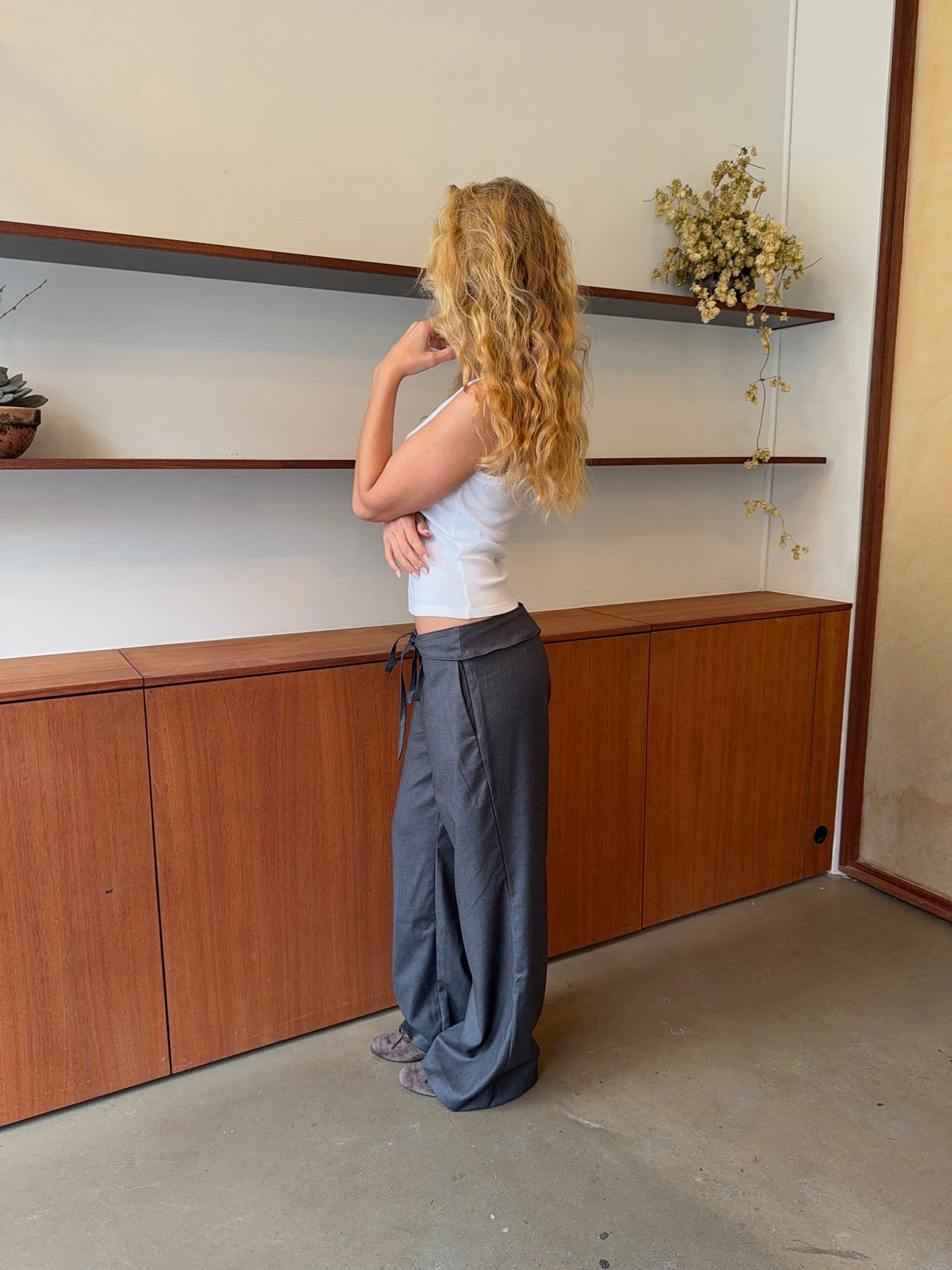 These grey trousers with a tie waist combine comfort and elegance in a timeless design. The soft, lightweight fabric drapes beautifully, creating a relaxed silhouette, while the tie detail accentuates the waist and adds a feminine touch. The straight legs offer a clean, modern look that makes the trousers versatile - perfect for both the office and casual days. Style them with a simple top or shirt for an effortless, refined look.