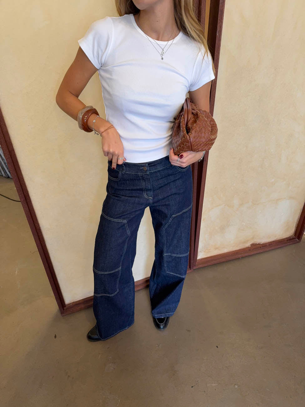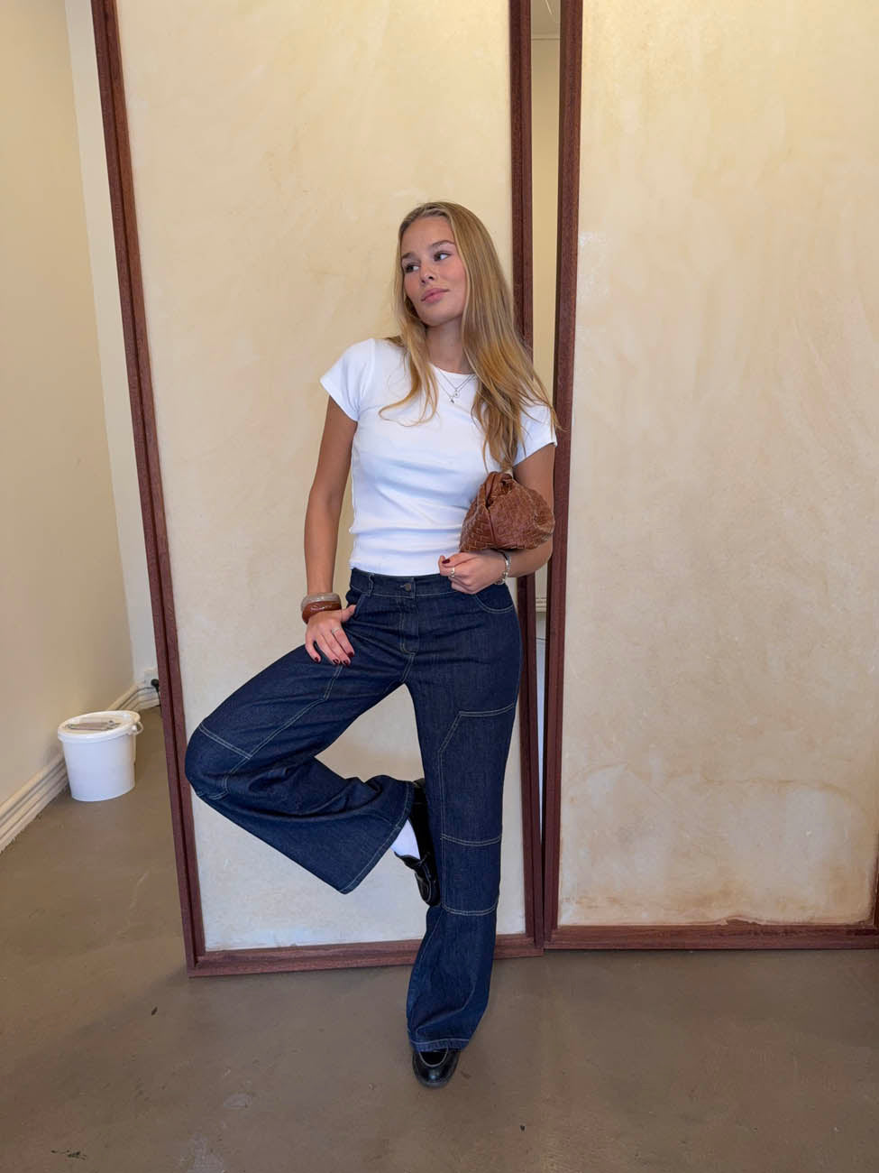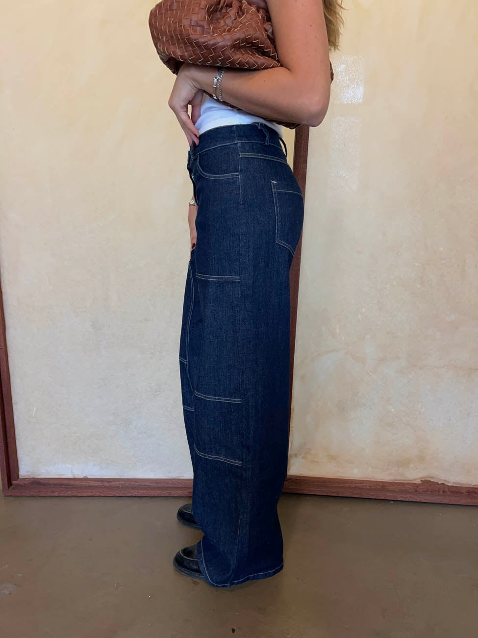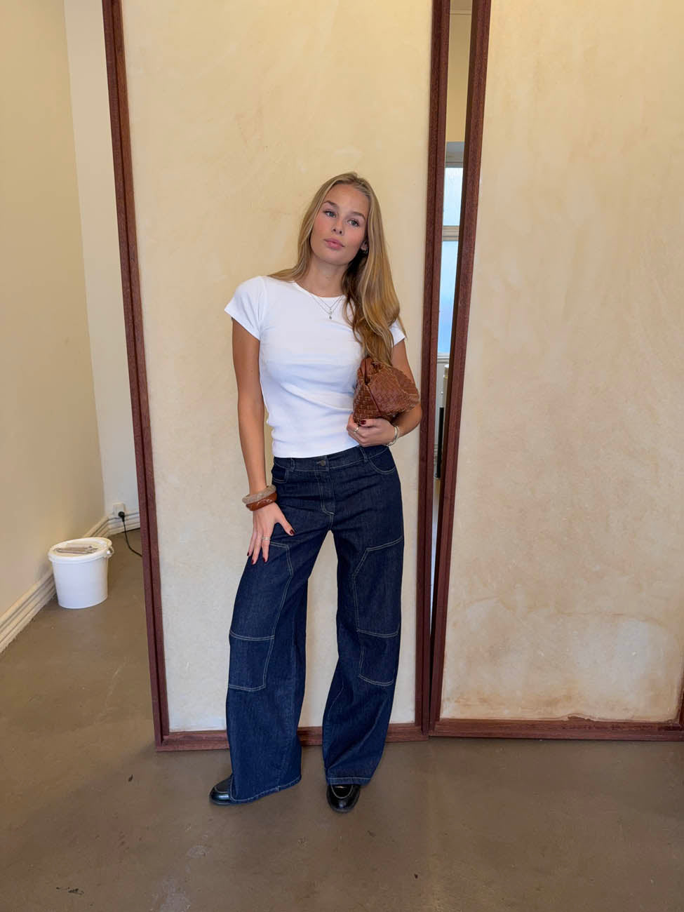 These dark blue denim trousers combine classic workwear with modern minimalism. The large front pockets and distinct contrast stitching add character and edge, while the straight fit and soft denim fabric ensure a comfortable and effortless feel.