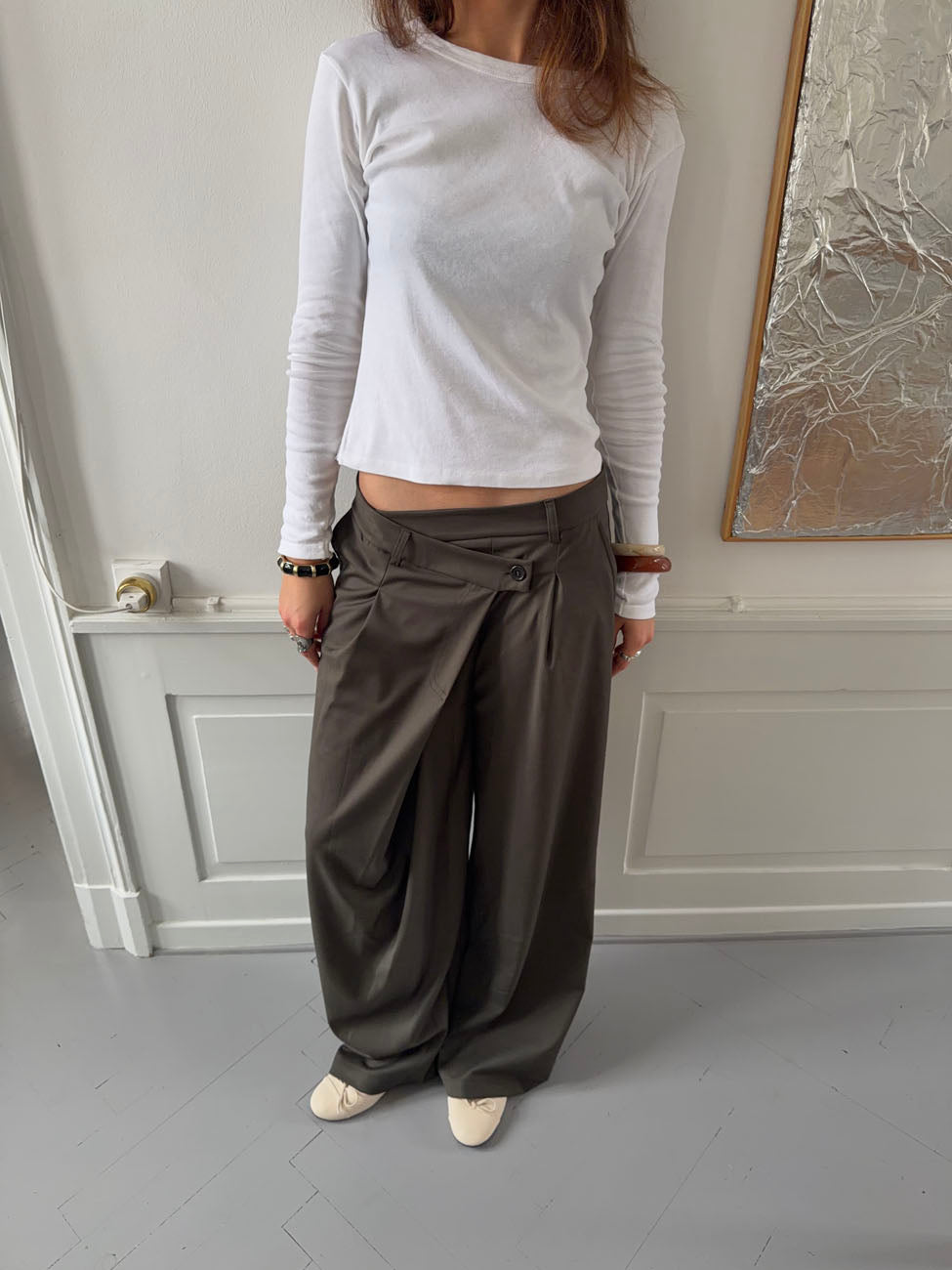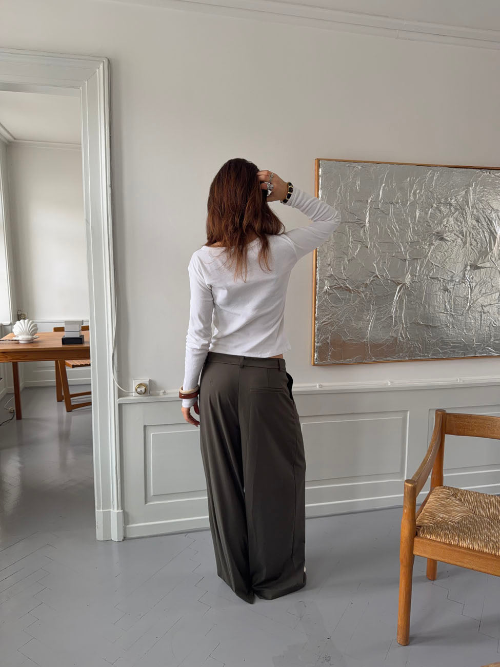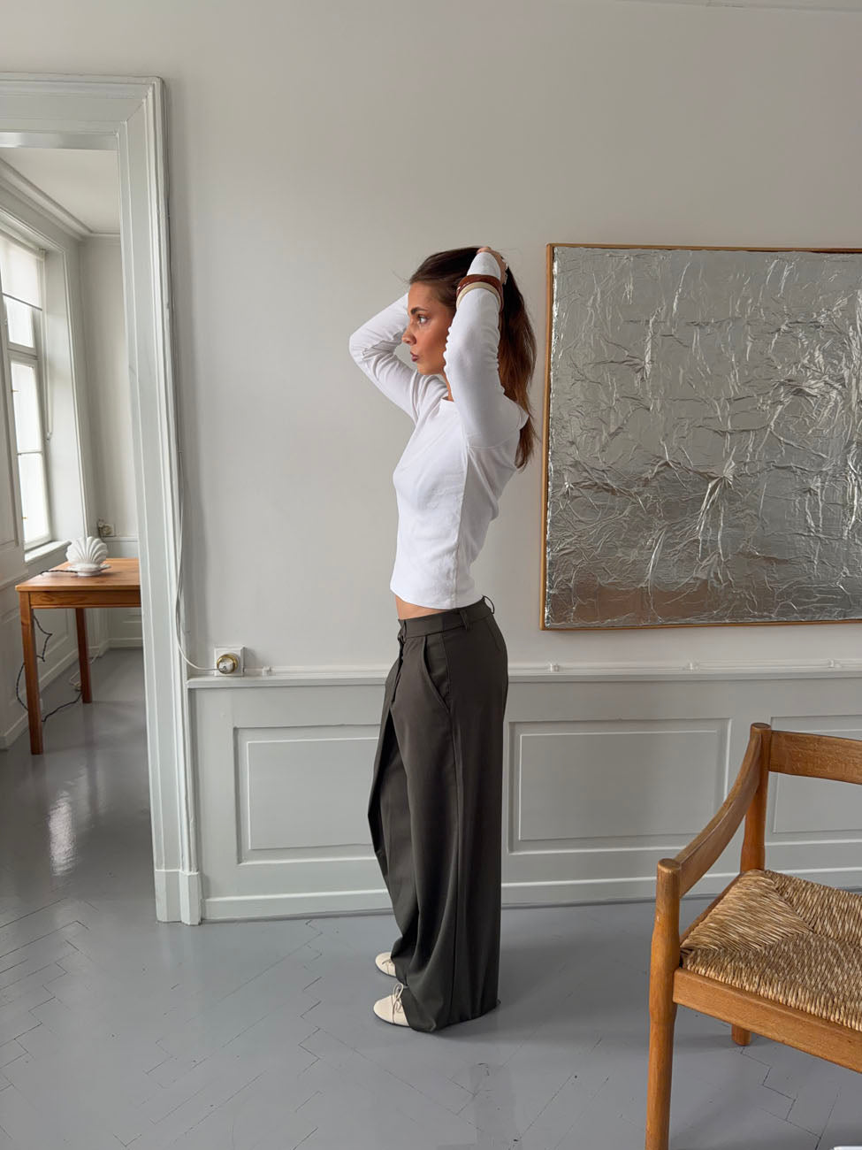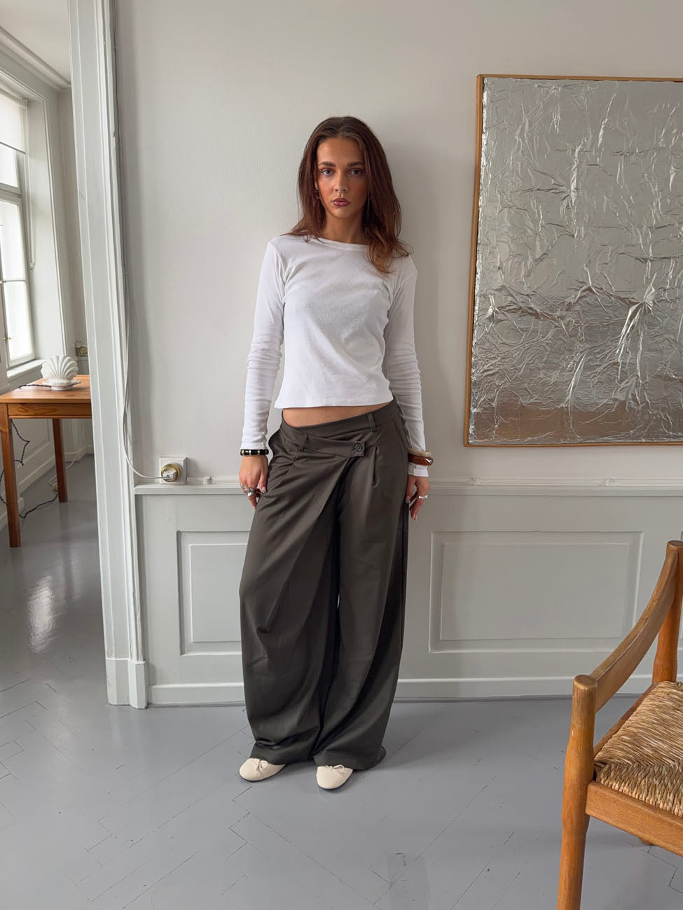A pair of light and comfortable trousers in a cool khaki color. They feature a relaxed cut with straight legs and are made from a soft, flexible fabric that makes them perfect for all-day wear. Ideal for both everyday outfits and occasions when you want to look effortlessly stylish without compromising on comfort.
