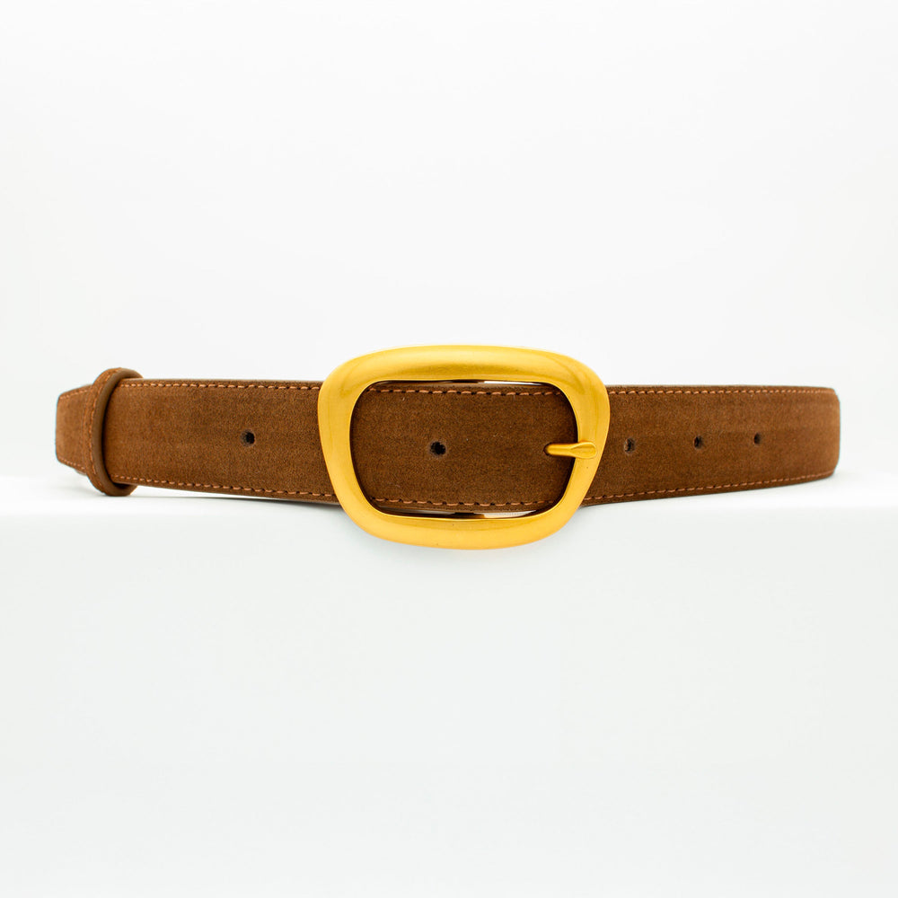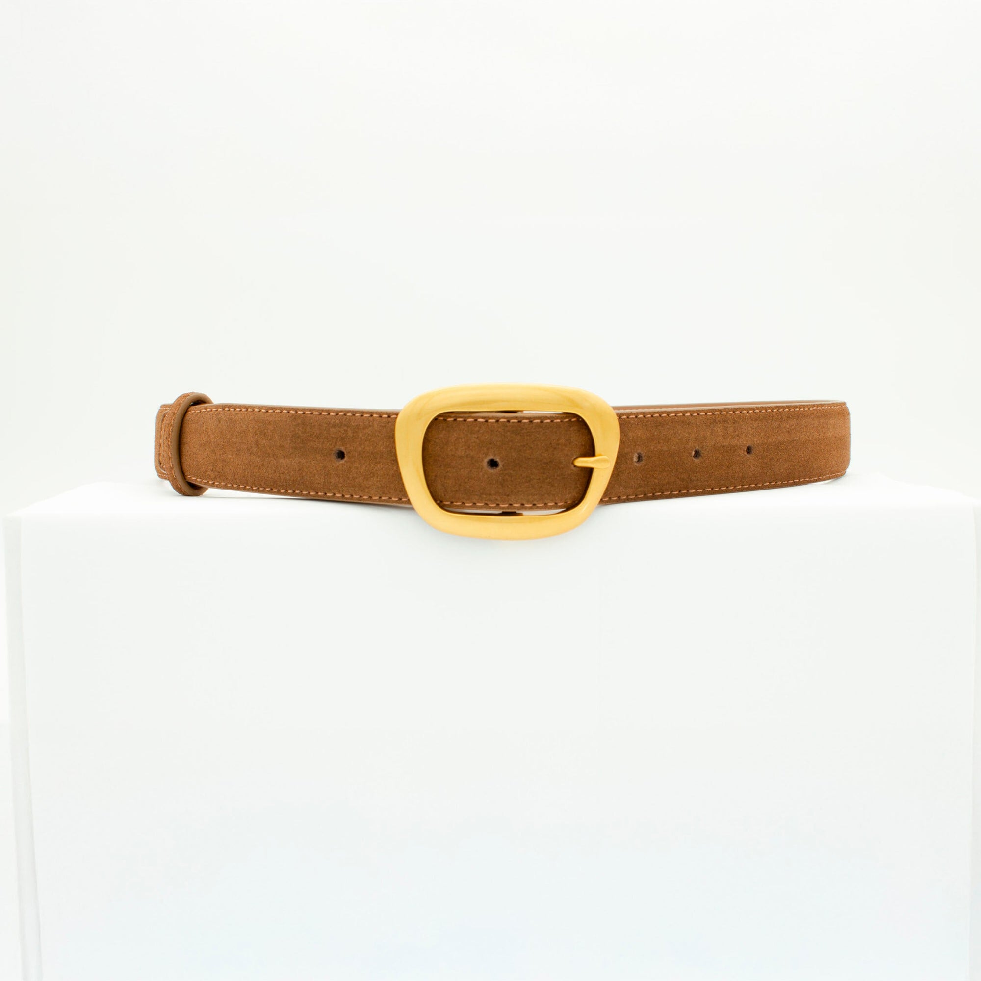 This is a stylish and modern waist belt made from faux suede. It features a sleek, minimalist design elevated by a distinctive oval buckle in a hammered amber-gold tone. The buckle adds a colorful detail and a subtle retro touch to the overall look. Perfect for pairing with neutral or earthy-toned outfits, this belt combines functionality with a contemporary expression and is ideal for both casual and elegant styles.
