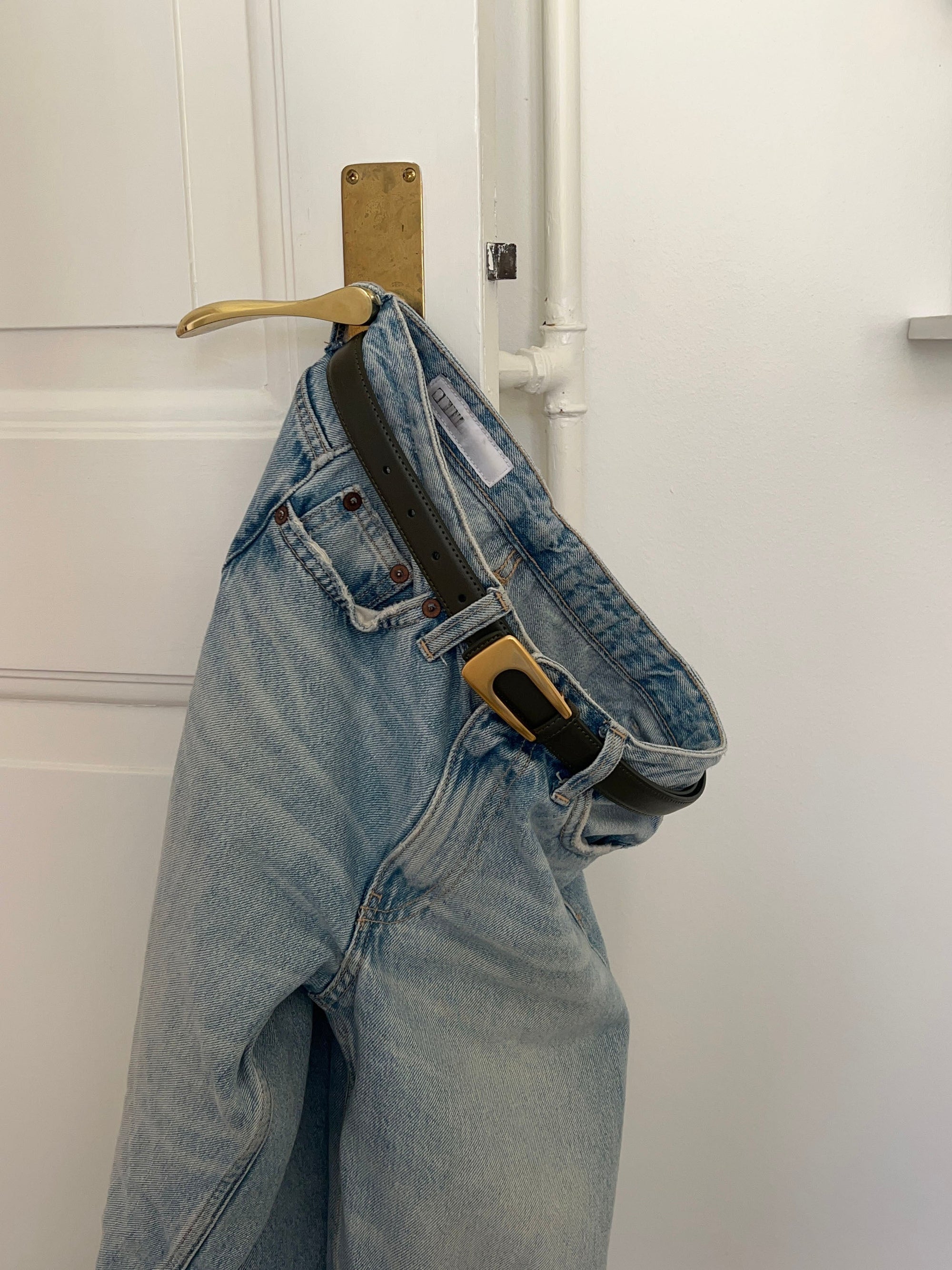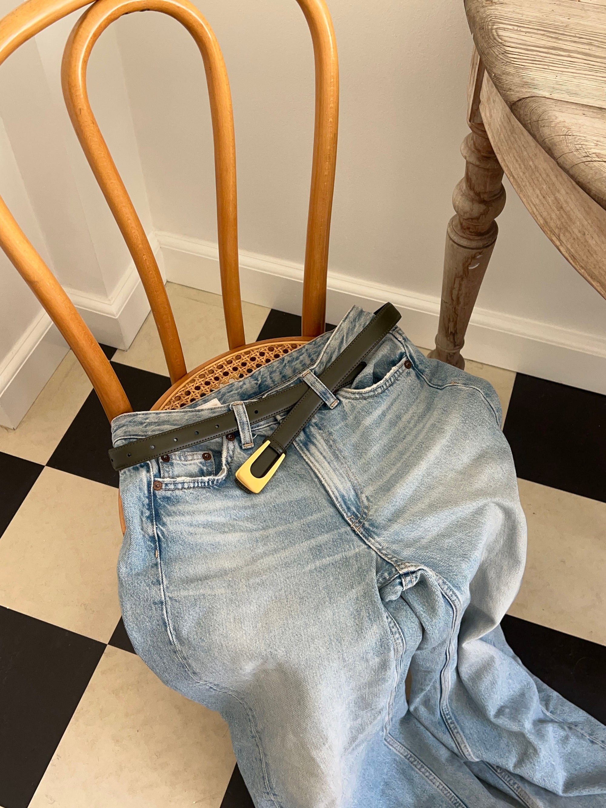 Add a sleek twist to your outfit with our "Edge Belt" in dark green with gold details. The minimalist design features a deep green leather-look finish paired with a rectangular gold-tone buckle, creating a graphic and modern look. The adjustable fit makes it perfect for styling with jeans, dresses, and cinched waistlines.