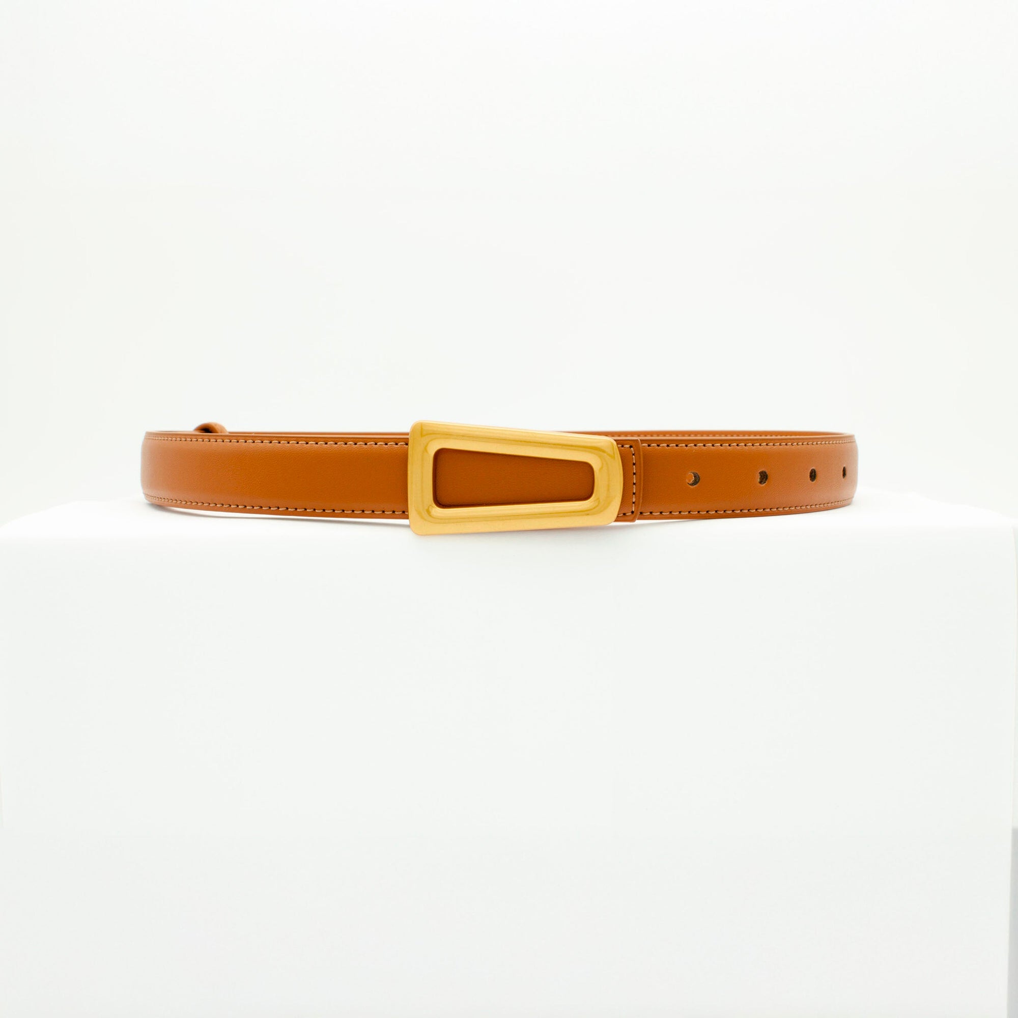 Add a sophisticated finishing touch to your outfit with our "Luce Belt" in cognac with gold details. The slim design in smooth faux leather is paired with an elegant, rectangular brushed gold buckle, creating a timeless and refined look.