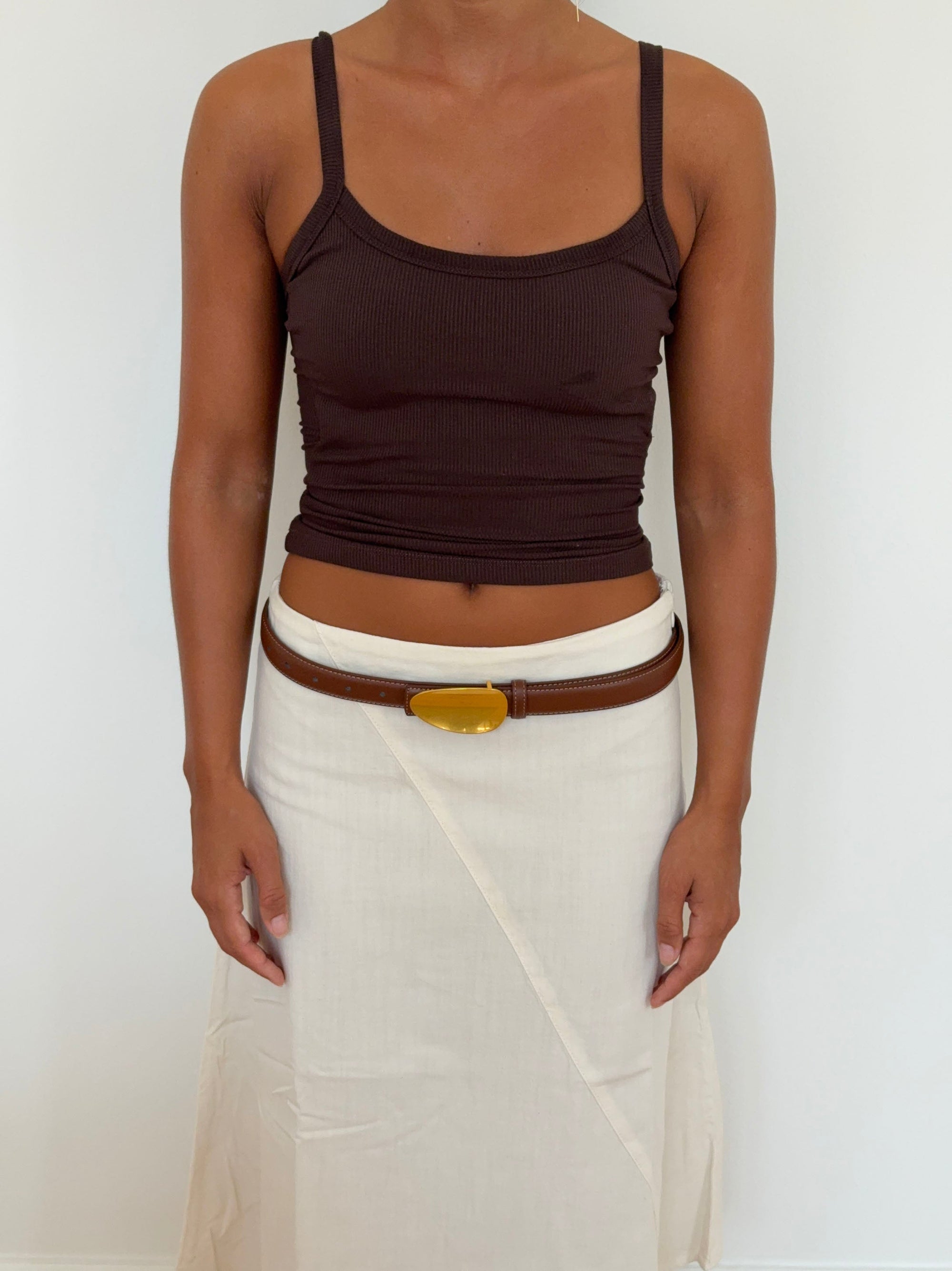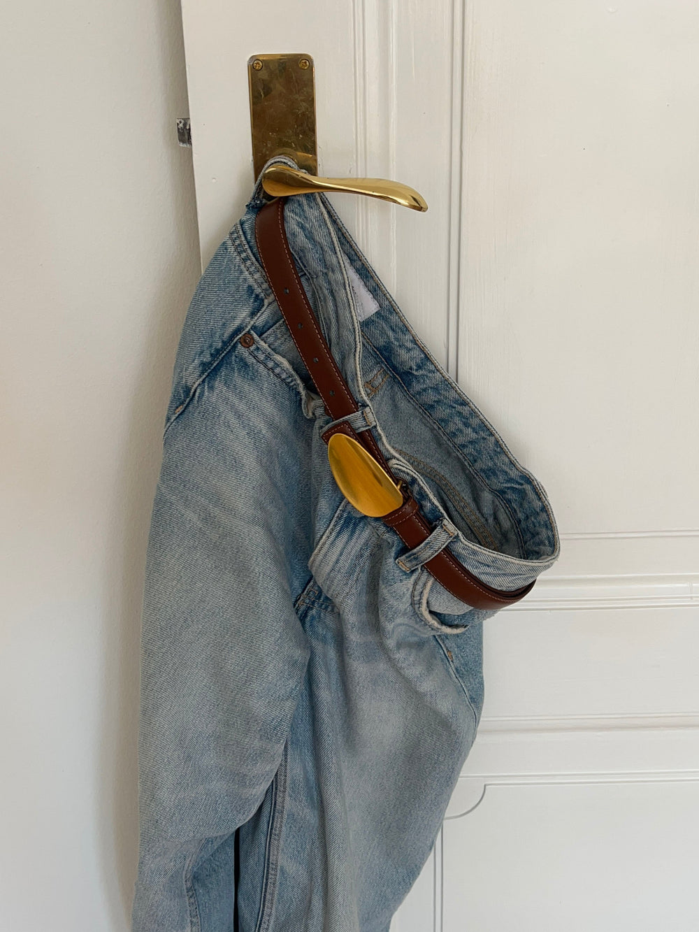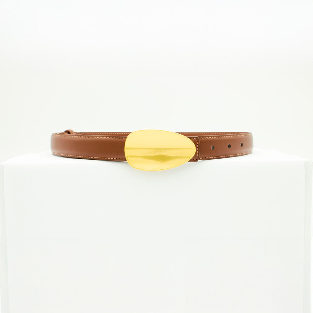 This is a stylish and modern waist belt made from smooth brown faux leather. It features a sleek, minimalist design elevated by a distinctive oval buckle in a glossy amber-gold tone. The buckle adds a colorful element and a subtle retro touch to the overall look. Perfect for pairing with neutral or earthy-toned outfits, this belt blends functionality with a modern expression and is ideal for both casual and elegant styles.