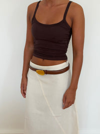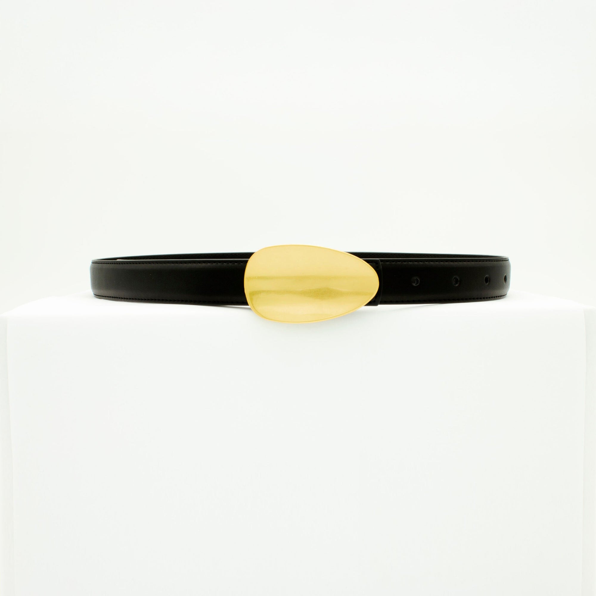 This is a stylish and modern waist belt made from smooth black faux leather. It features a sleek, minimalist design elevated by a distinctive oval buckle in a glossy amber-gold tone. The buckle adds a colorful detail and a subtle retro touch to the overall look. Perfect for pairing with neutral or earthy-toned outfits, this belt blends functionality with a modern expression and is ideal for both casual and elegant styles.