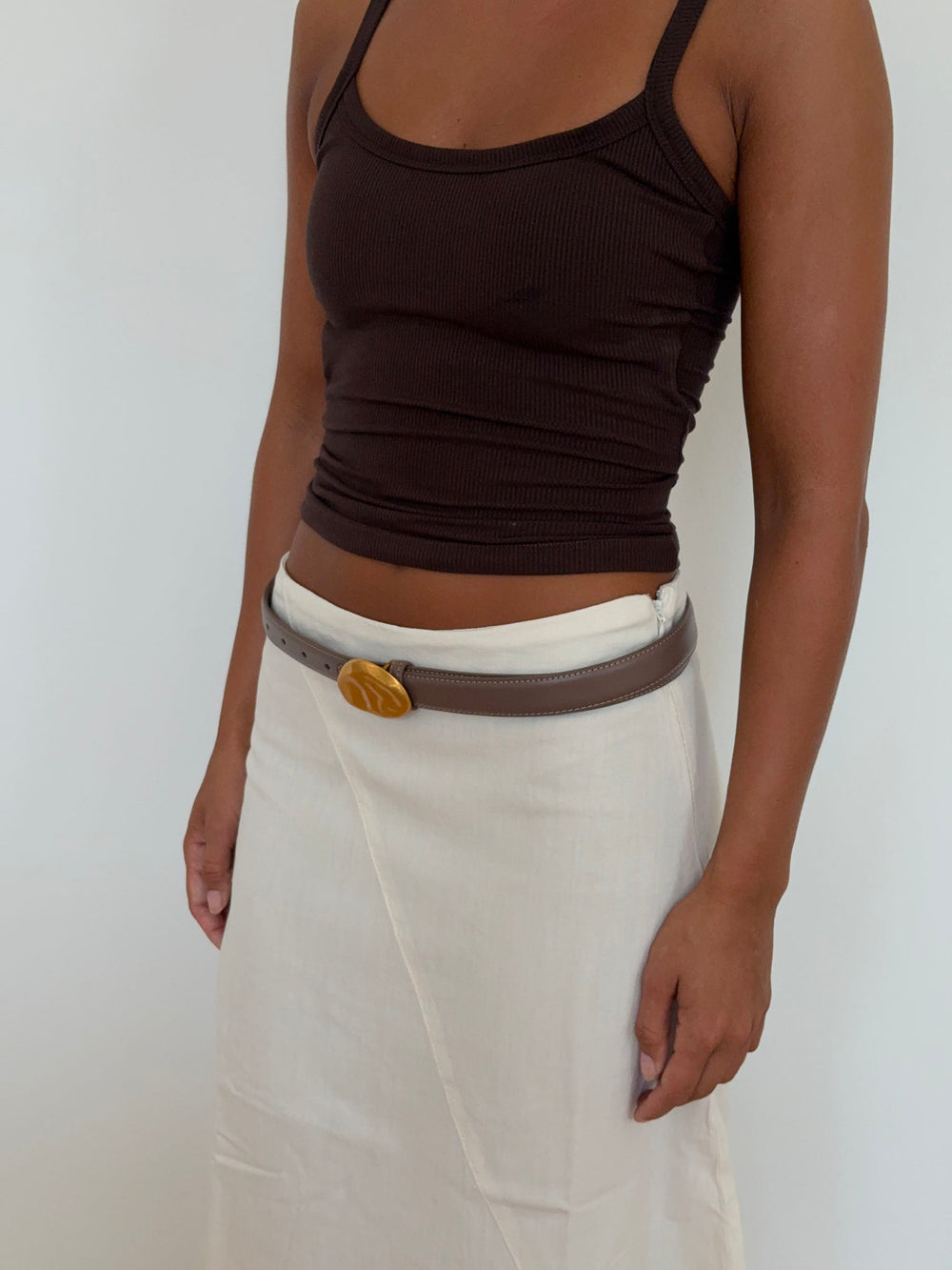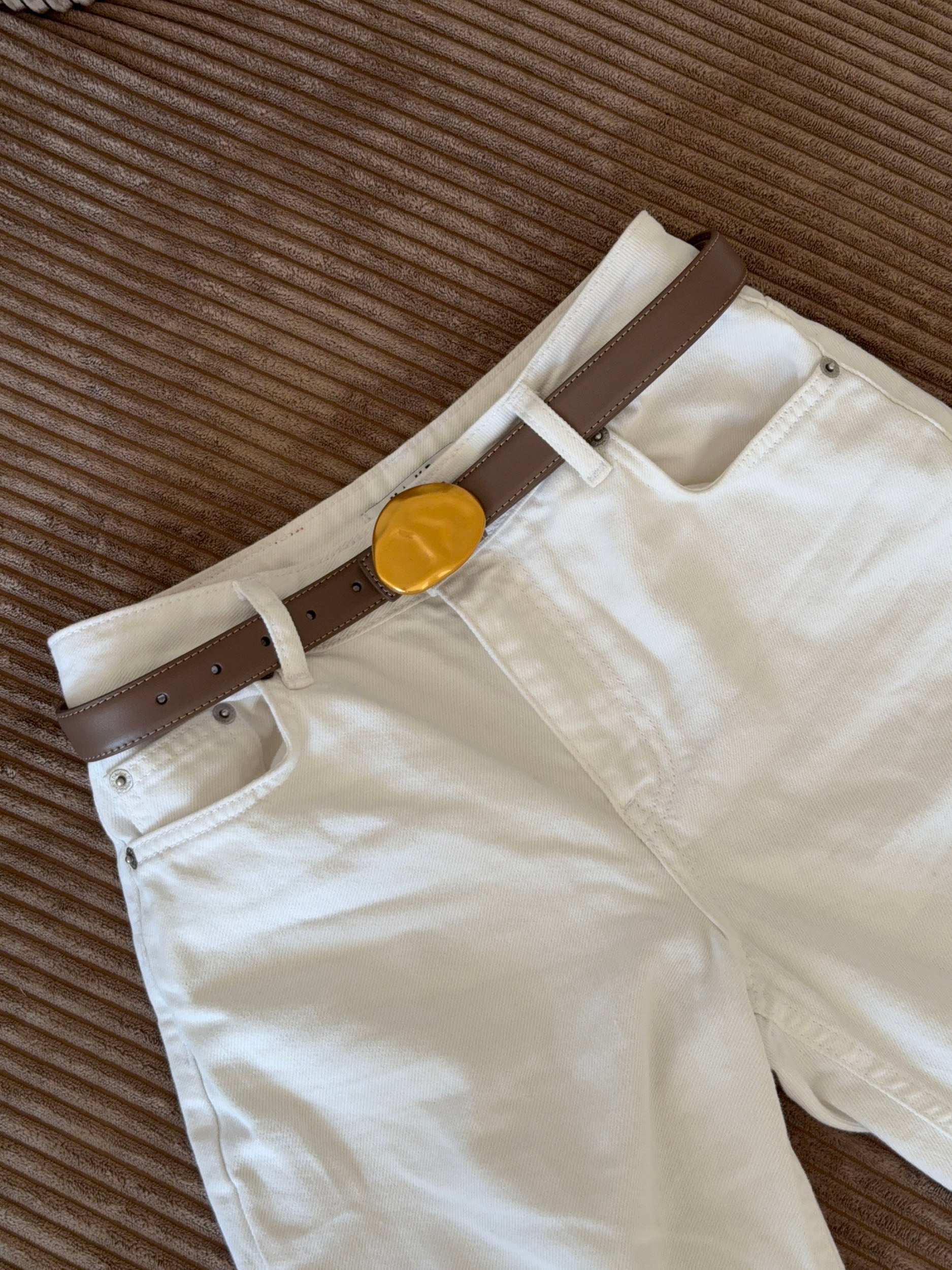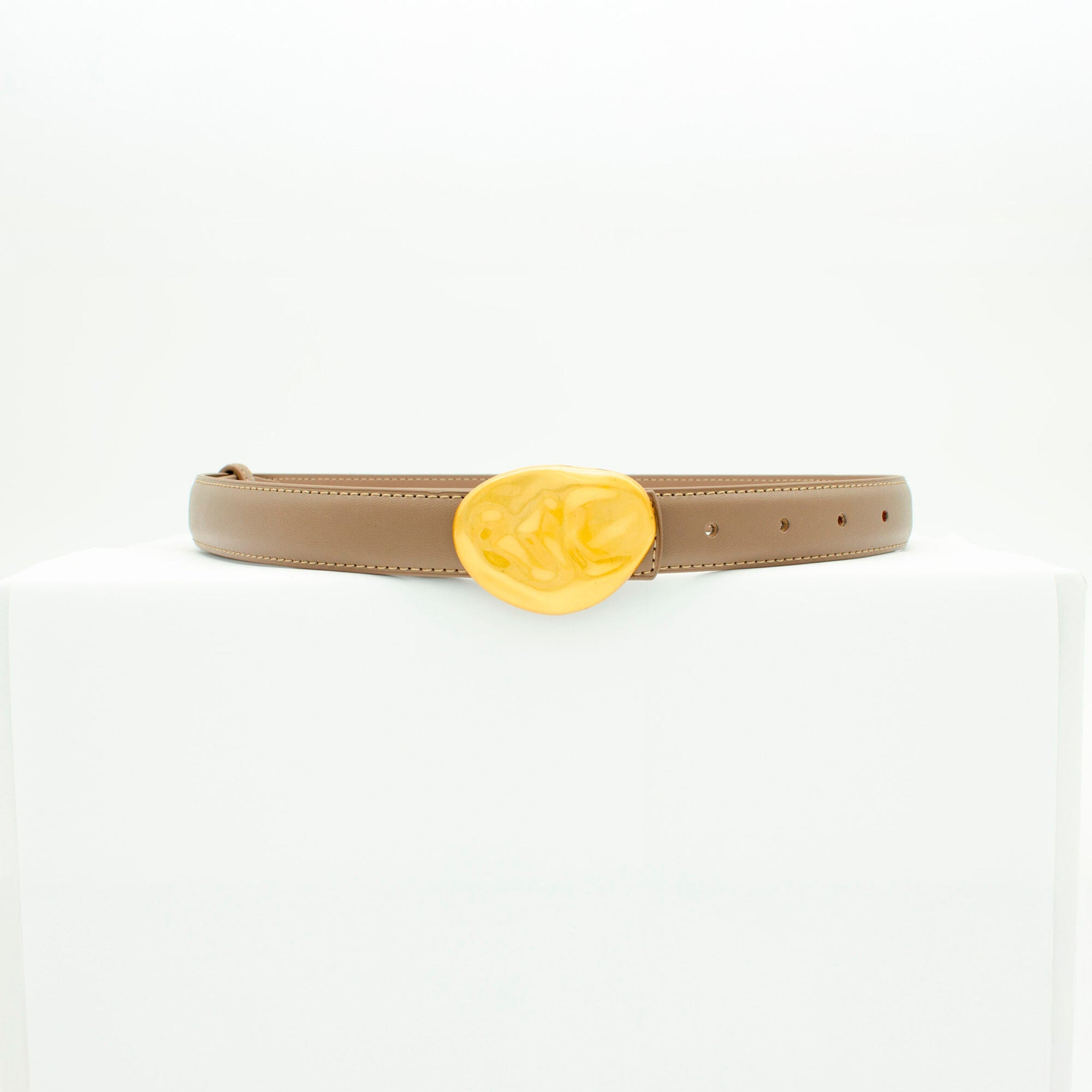 This is a stylish and modern waist belt made from smooth faux leather. It features a sleek, minimalist design elevated by a distinctive oval buckle in a hammered amber-gold tone. The buckle adds a colorful detail and a subtle retro touch to the overall look. Perfect for pairing with neutral or earthy-toned outfits, this belt blends functionality with a contemporary expression and is ideal for both casual and elegant styles.