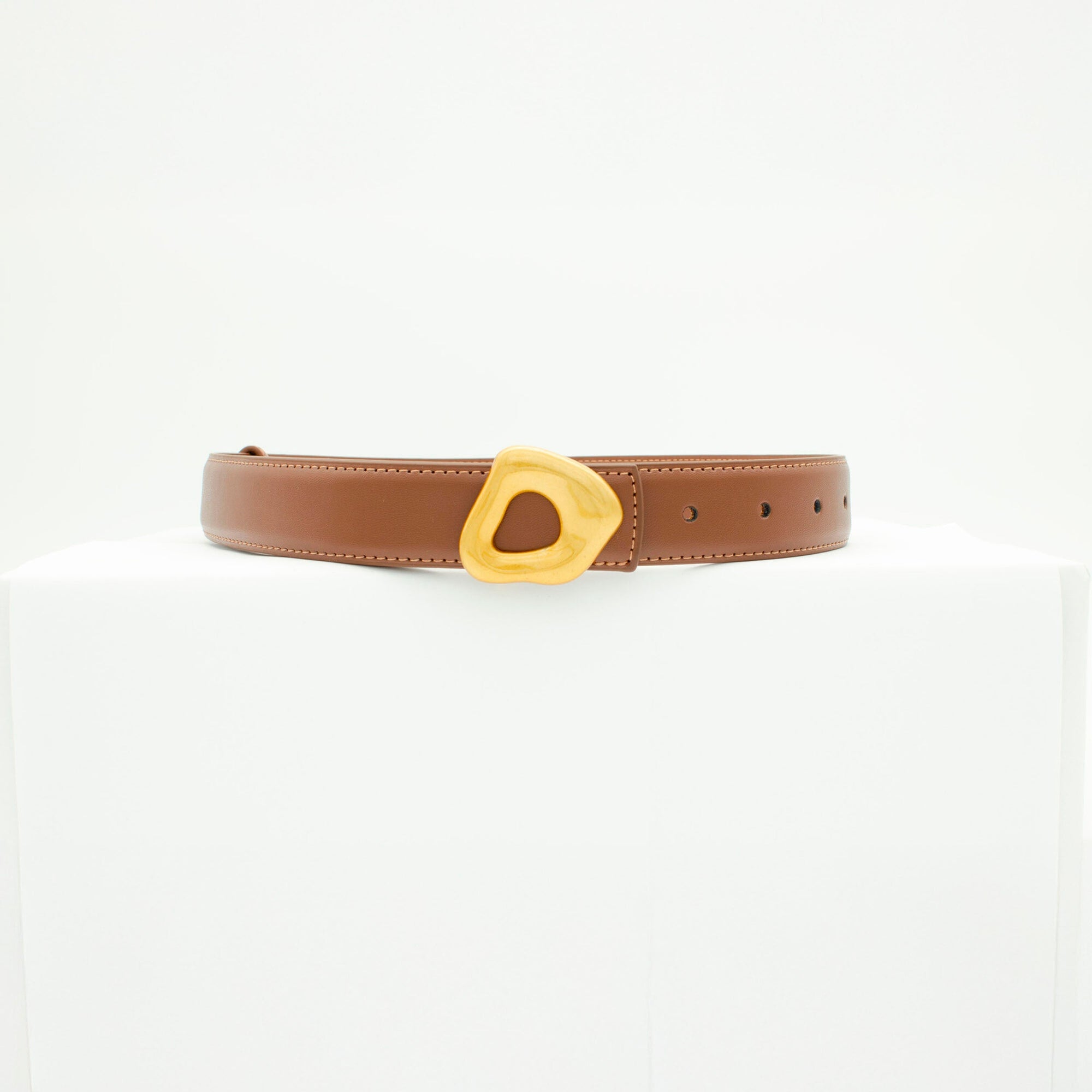 Add an elegant touch to your outfit with our "Forma Belt" with gold details. Designed in smooth brown faux leather, it features a sculptural, triangular buckle in a golden finish that adds edge and character. The adjustable closure makes it ideal for classic styling.