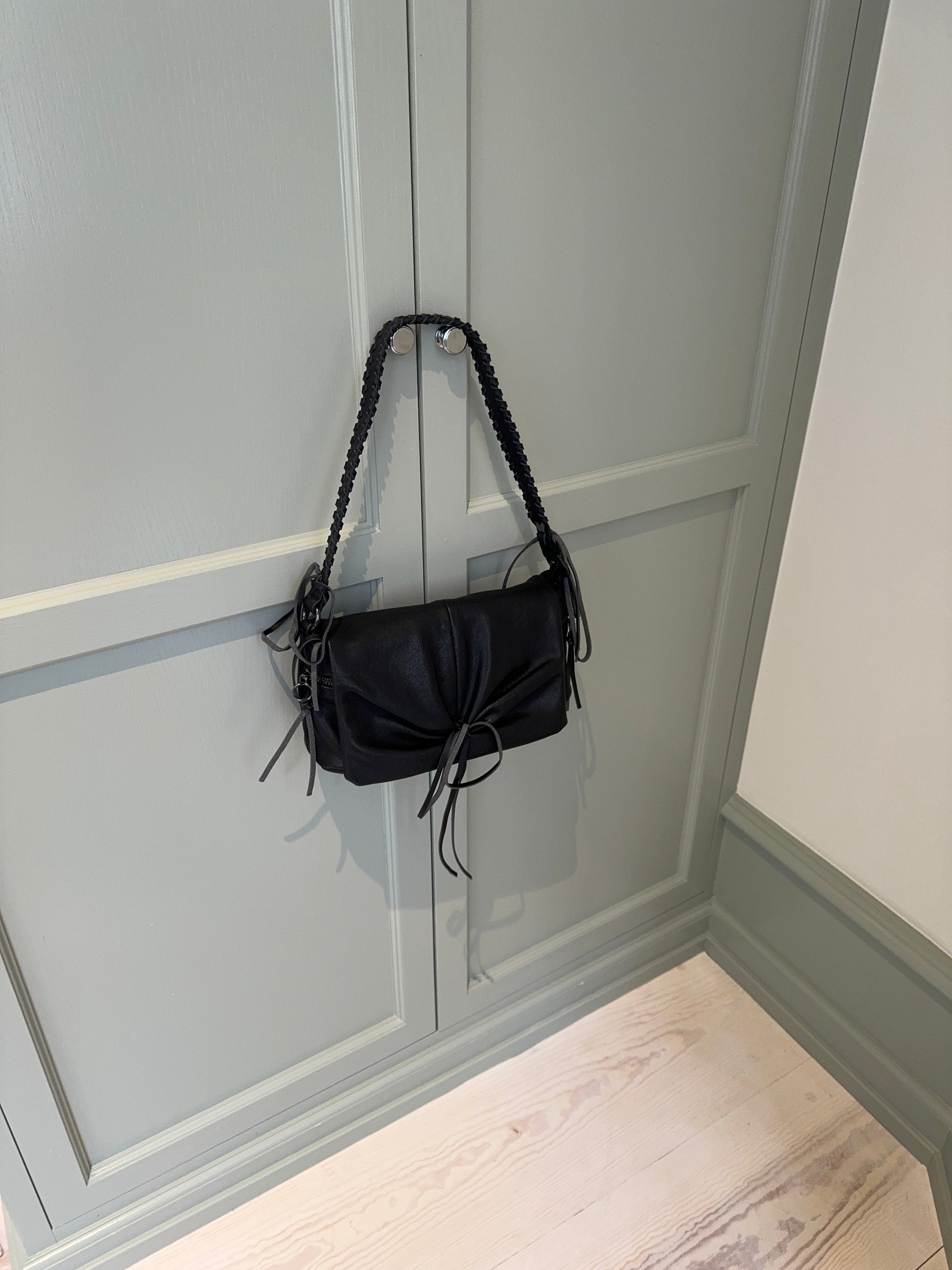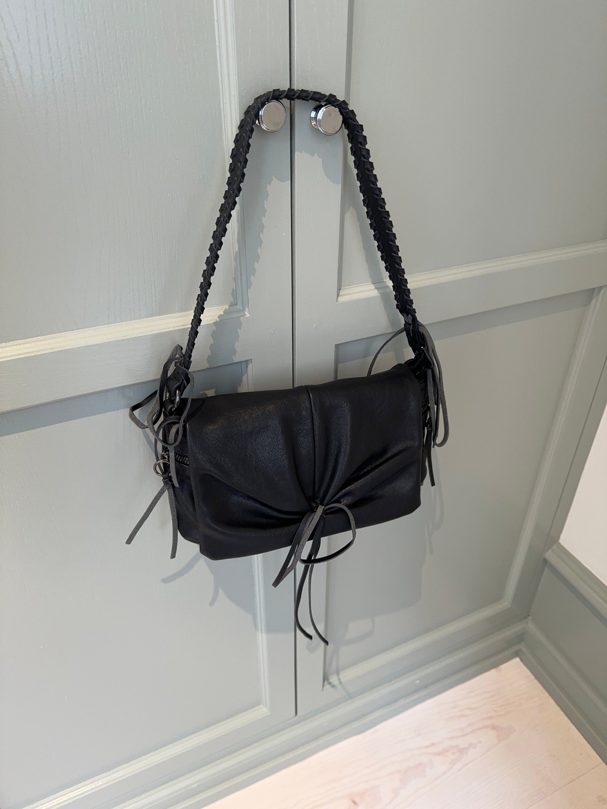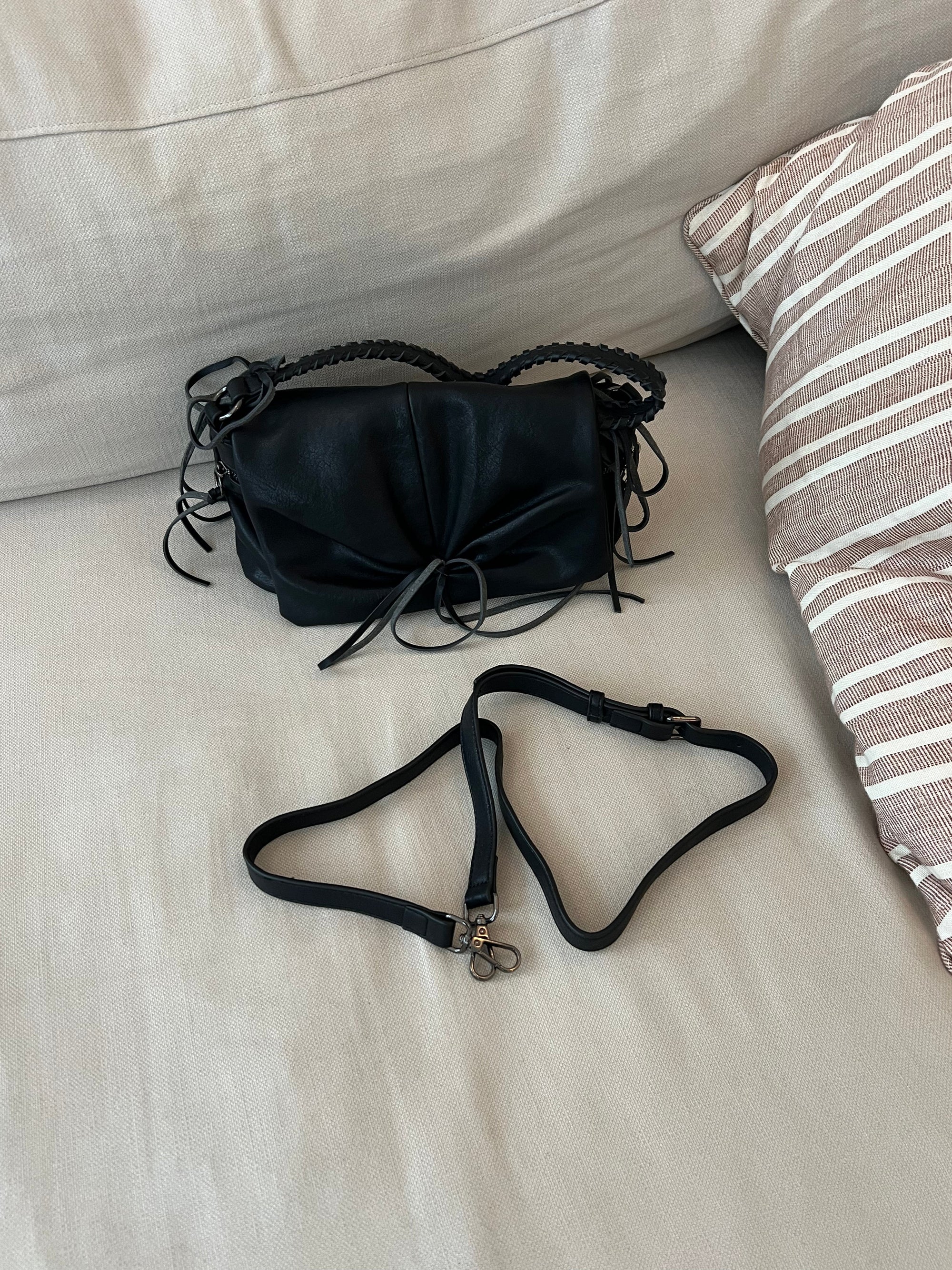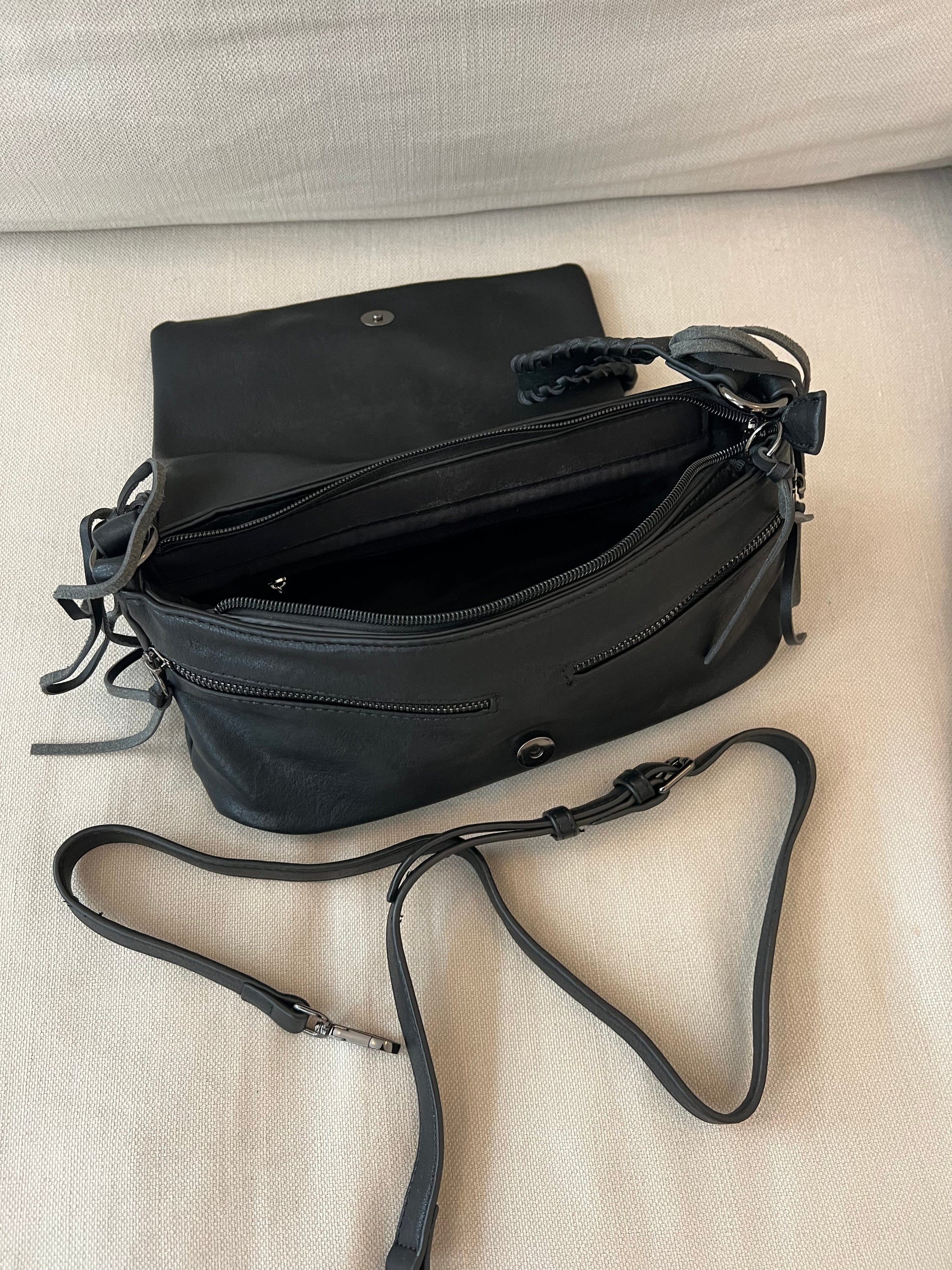 This small black bag is both stylish and practical. It features beautiful details, including a braided handle and fringe accents. The bag closes with a zipper and a metal/magnet snap for added security. Inside, you'll find a small compartment for storing your essentials.