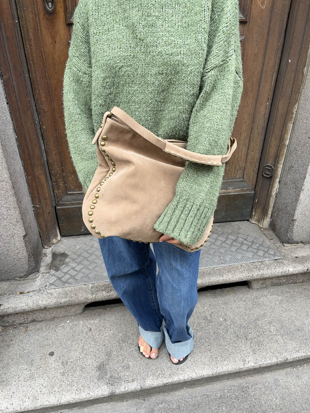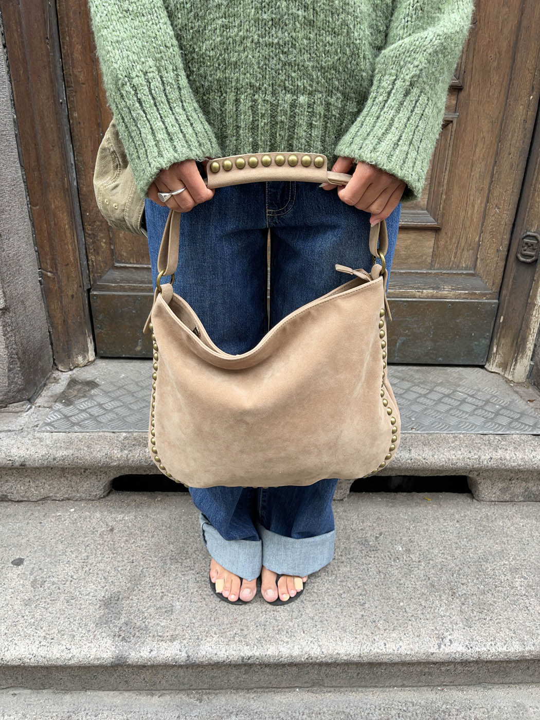 This sand-coloured suede hobo bag is the perfect choice for anyone who loves a casual, cool, and effortless look. The soft suede texture gives the bag a luxurious feel, while the raw studs along the edges add an edgy and trendy touch at the same time.