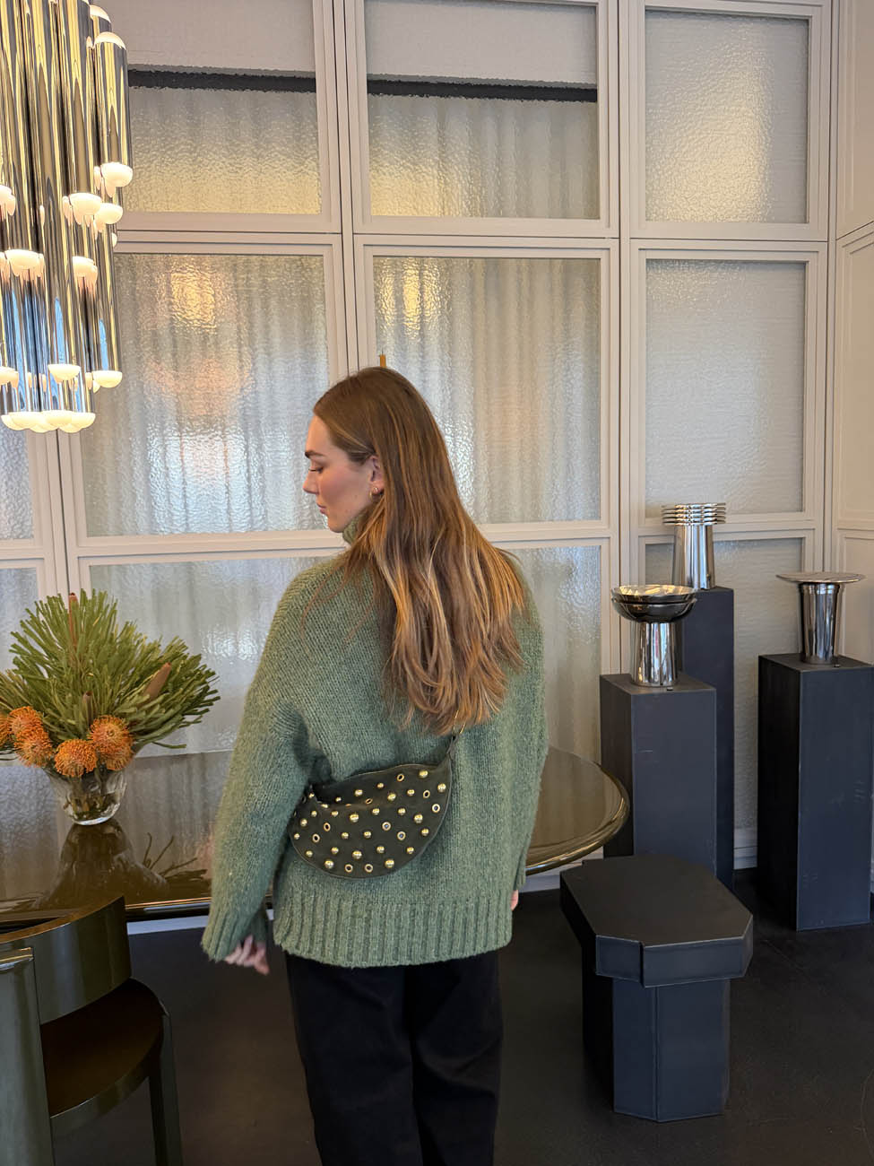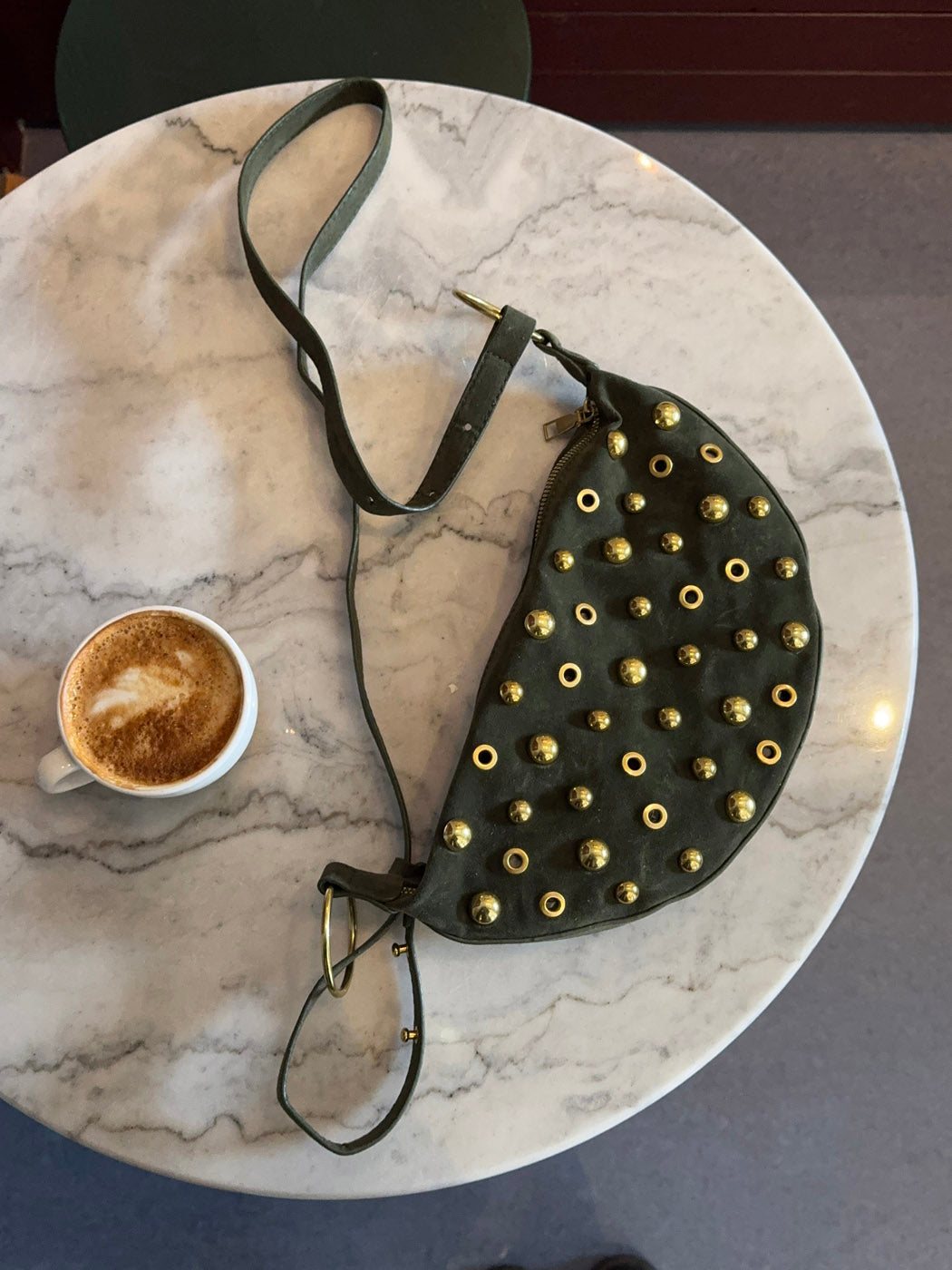 Cool and characterful bag in dark green suede with decorative gold-toned studs and details. The half-moon shape gives the bag a modern and trendy look, while the edgy metal accents add personality and attitude.