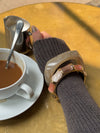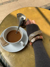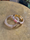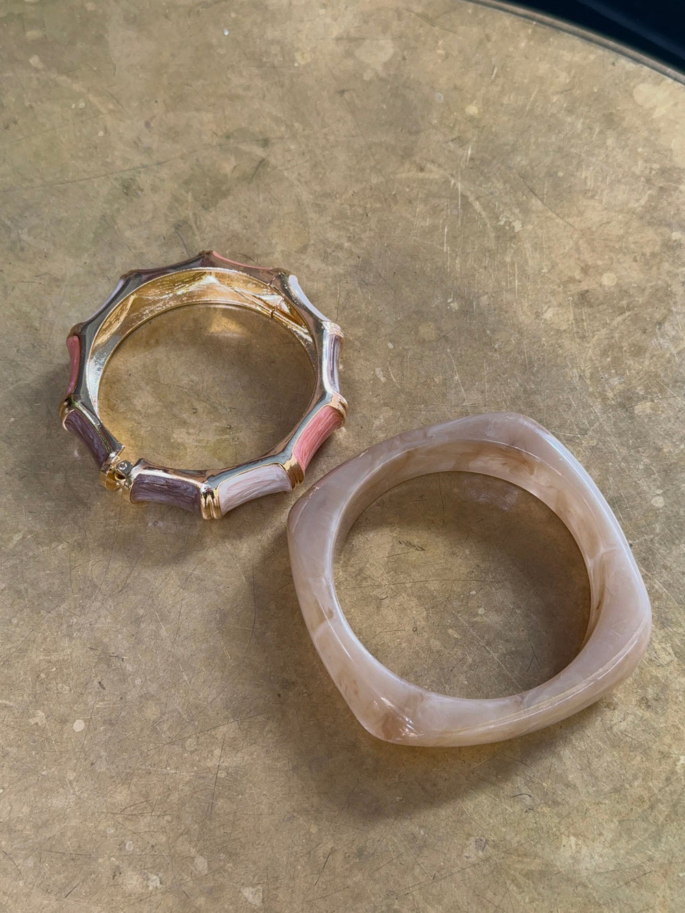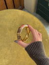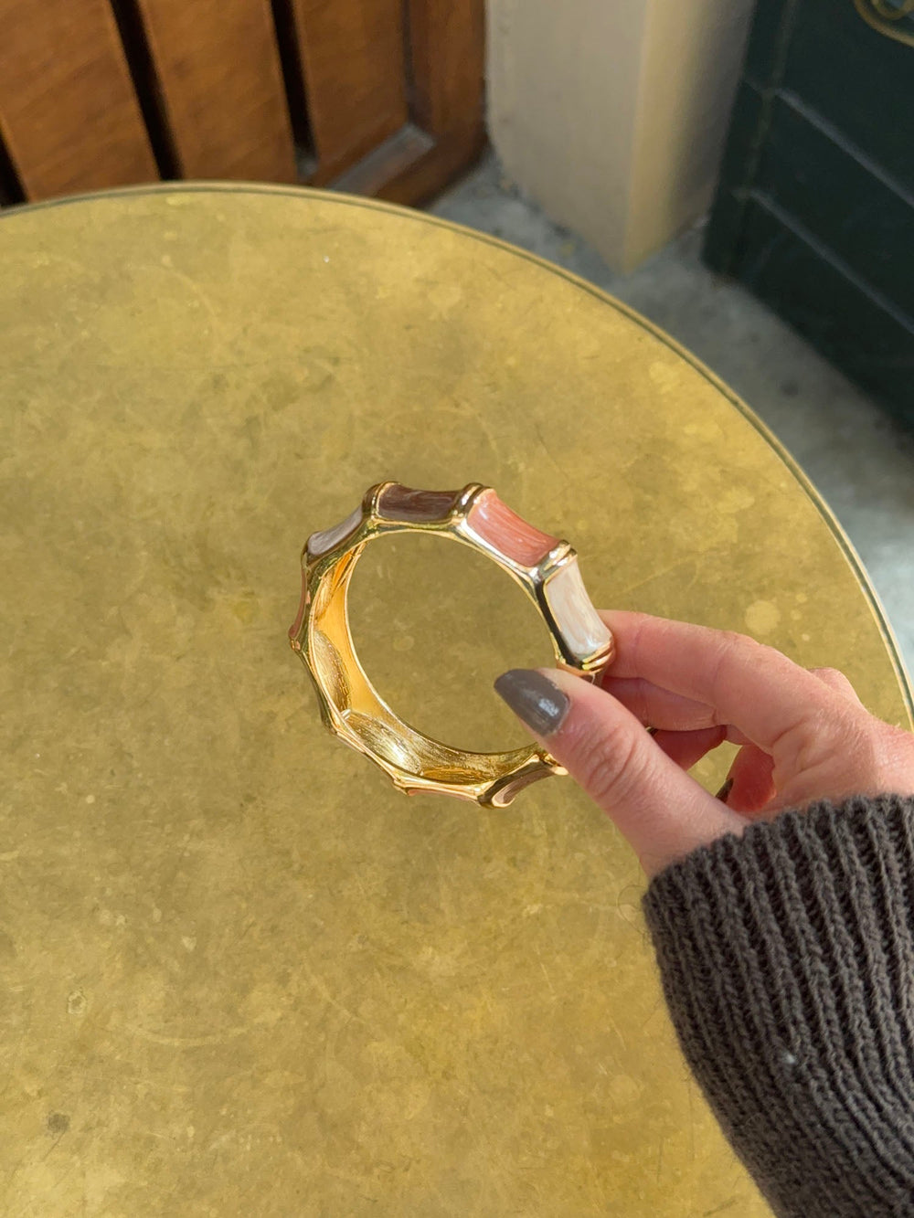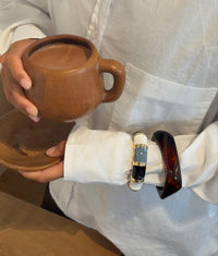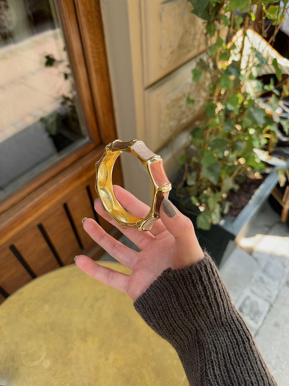 A characterful bangle bracelet crafted with golden metal and curved color segments in warm shades of coral, cream, and brown. The design is sculptural and organic, giving the bracelet a unique and eye-catching expression. Perfect as a statement accessory for both everyday wear and festive occasions.