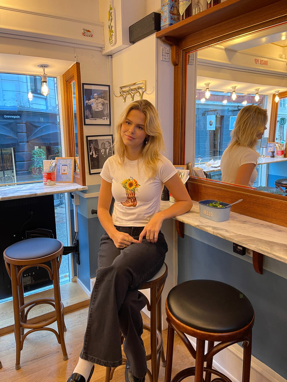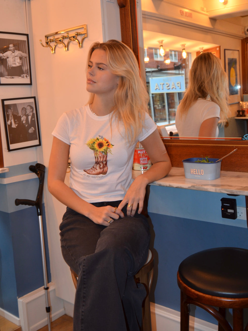 Baby tee with the text "be my sunflower" and a sunflower and cowboy-boot on it. Our tees are from Fruit of the Loom and made from super soft and comfortable quality.
