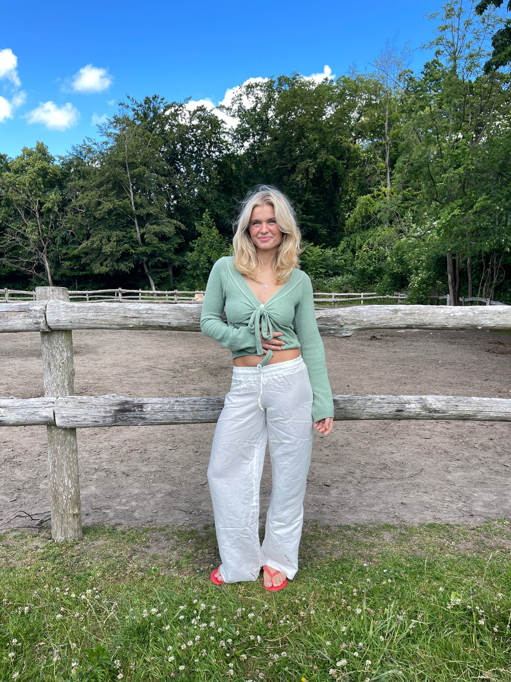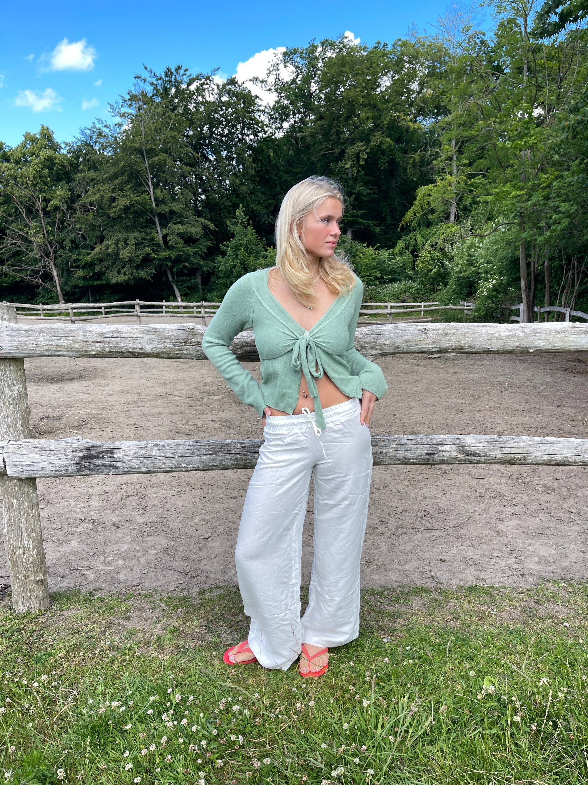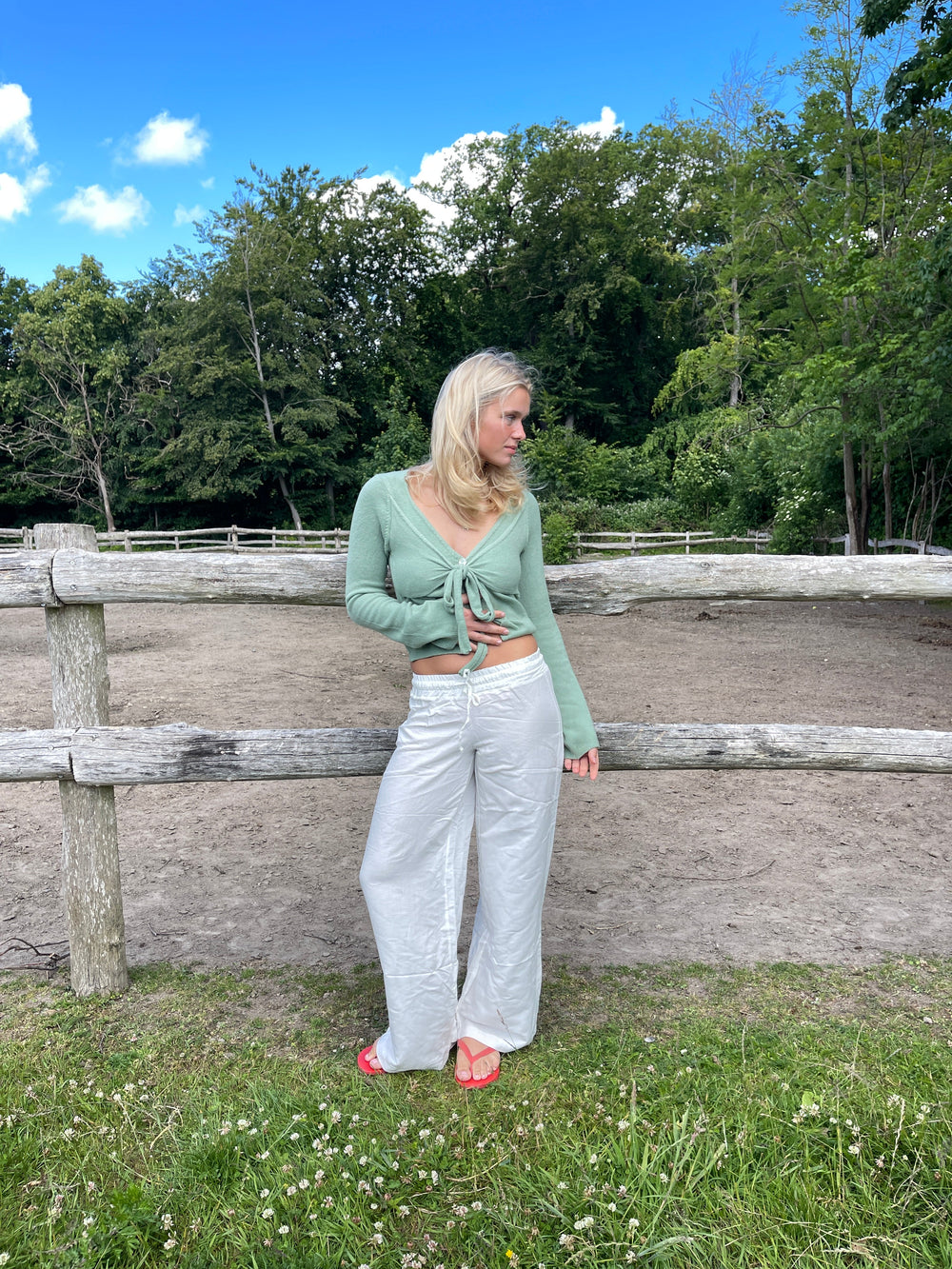 These trousers have a loose fit and an elasticated waistband with tieable drawstrings. They are made in a comfortable light material, which is absolutely perfect for summer.