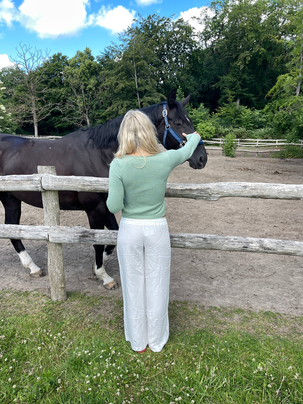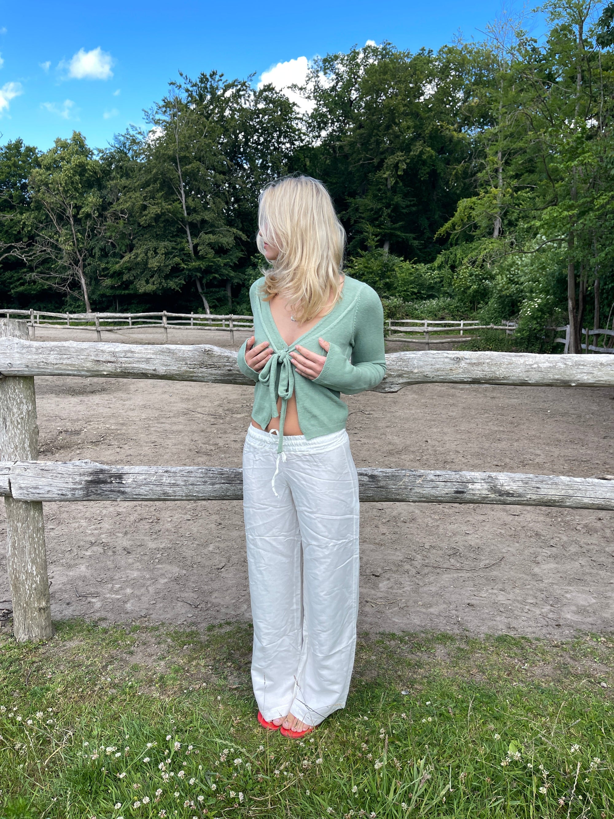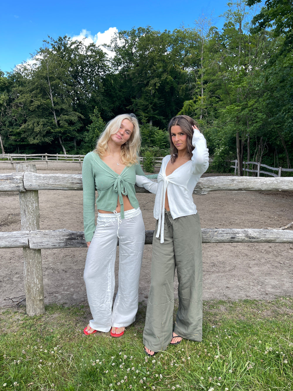 These trousers have a loose fit and an elasticated waistband with tieable drawstrings. They are made in a comfortable light material, which is absolutely perfect for summer.