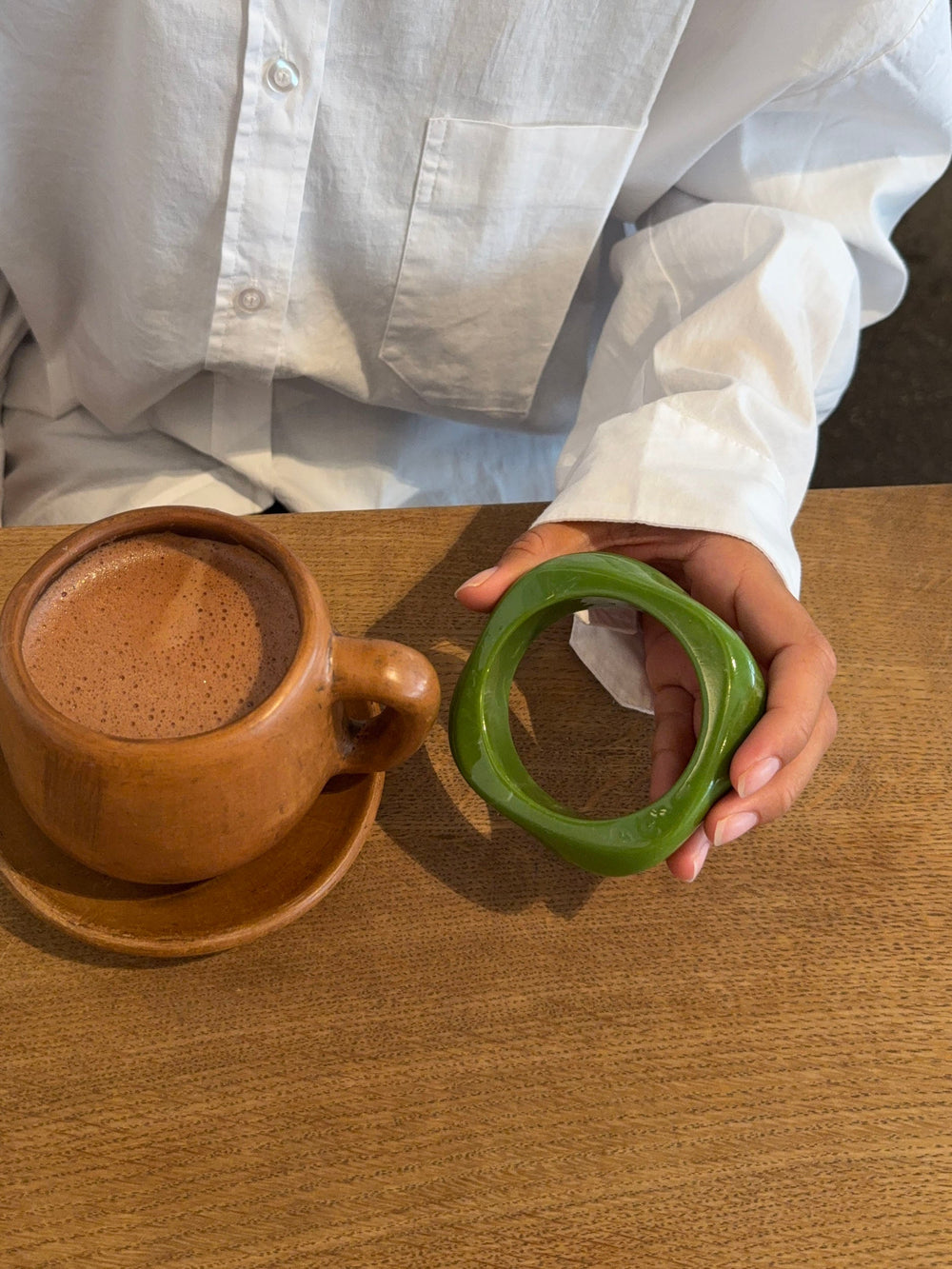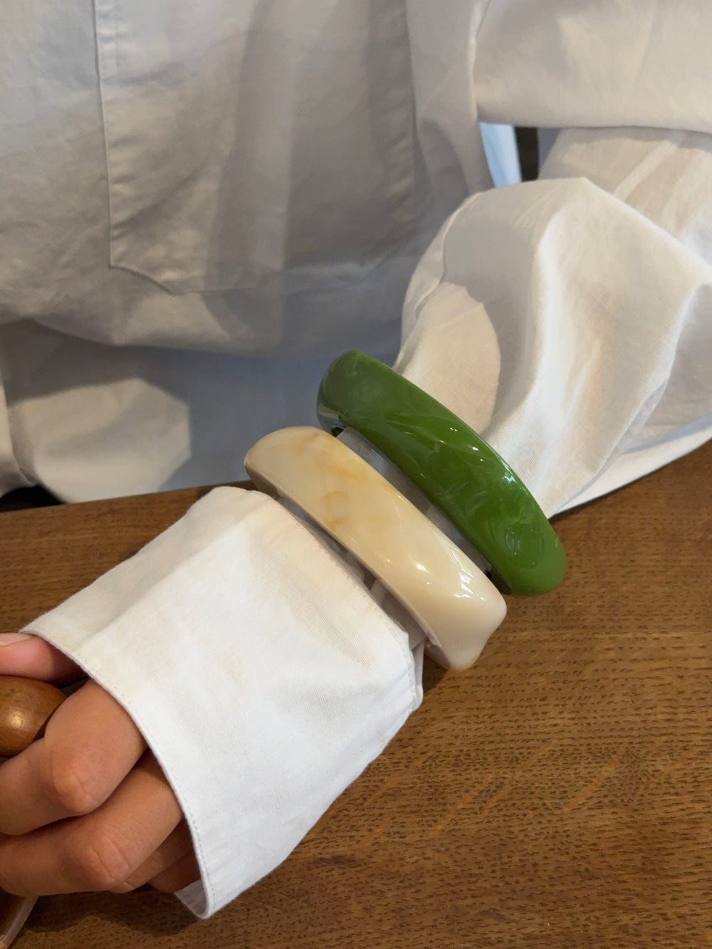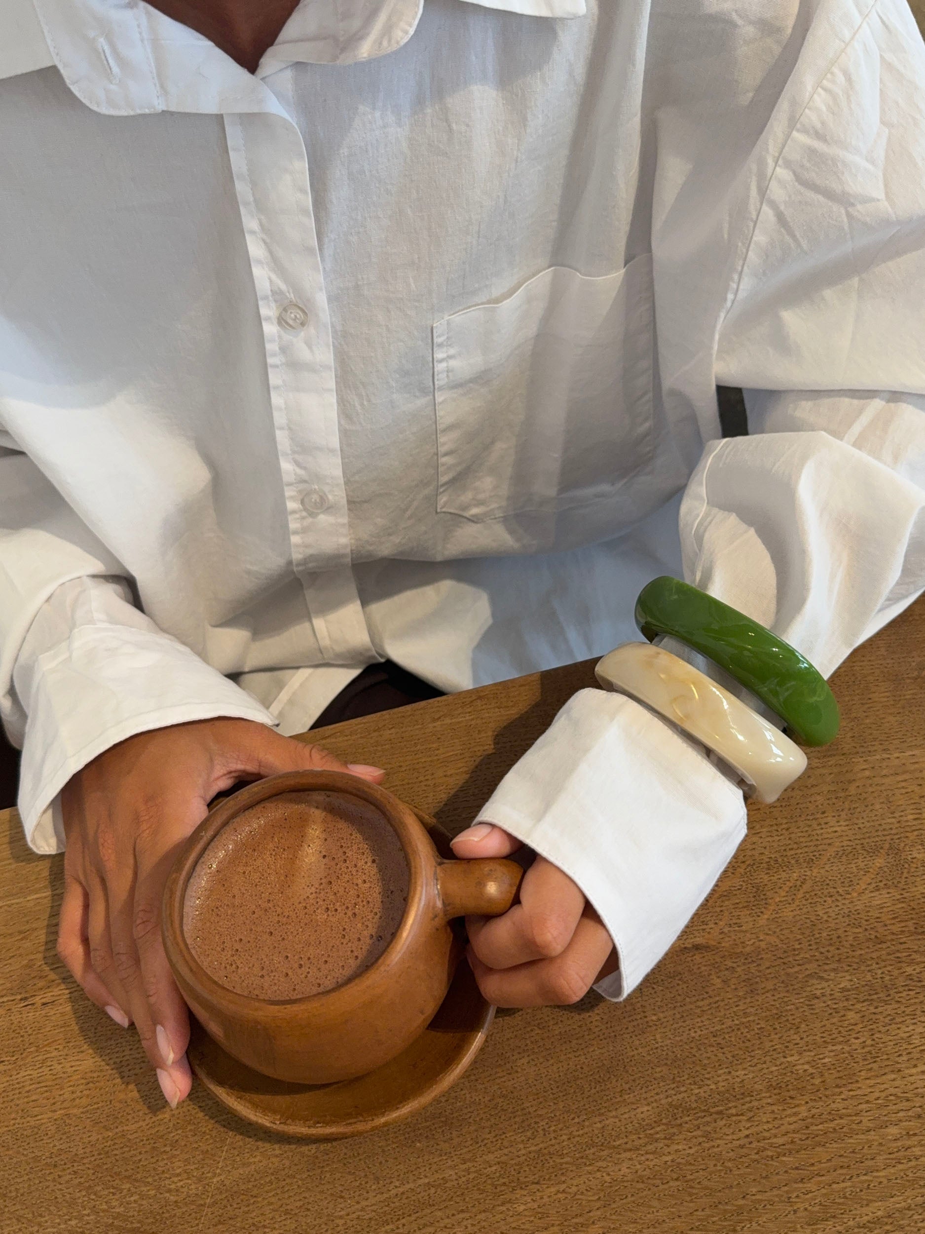 A sculptural and eye-catching bracelet made of glossy, marbled resin in a fresh green hue. The angular, asymmetrical shape adds a modern twist to an otherwise classic statement piece. Perfect on its own or paired with other chunky accessories for a playful, summery look.