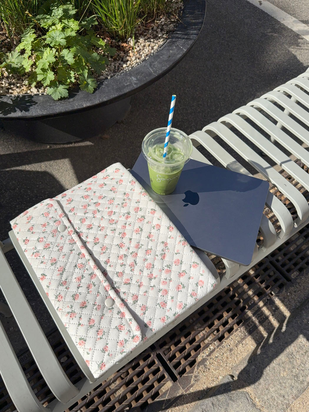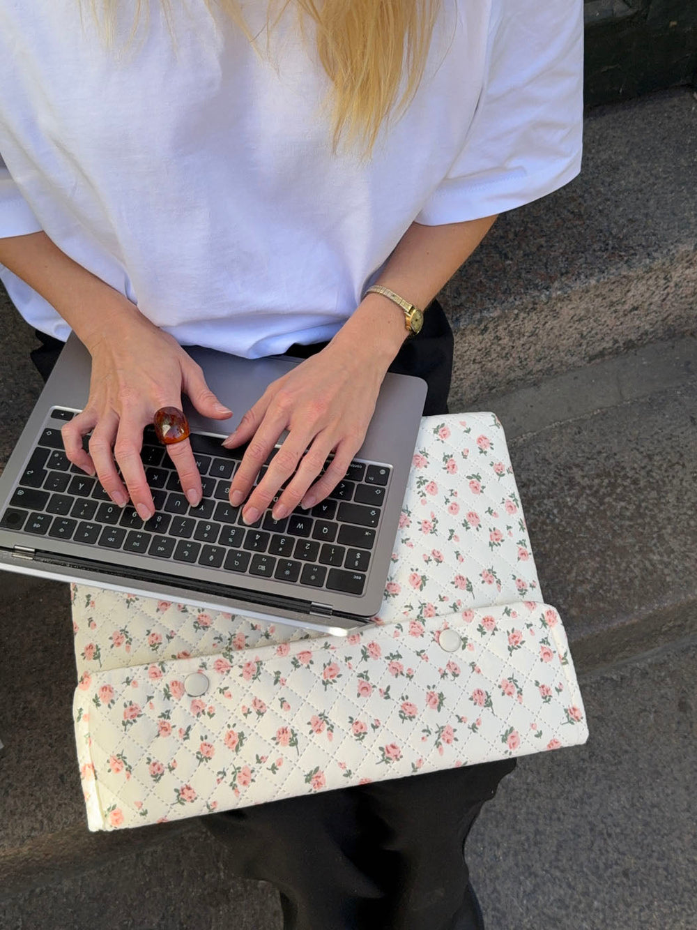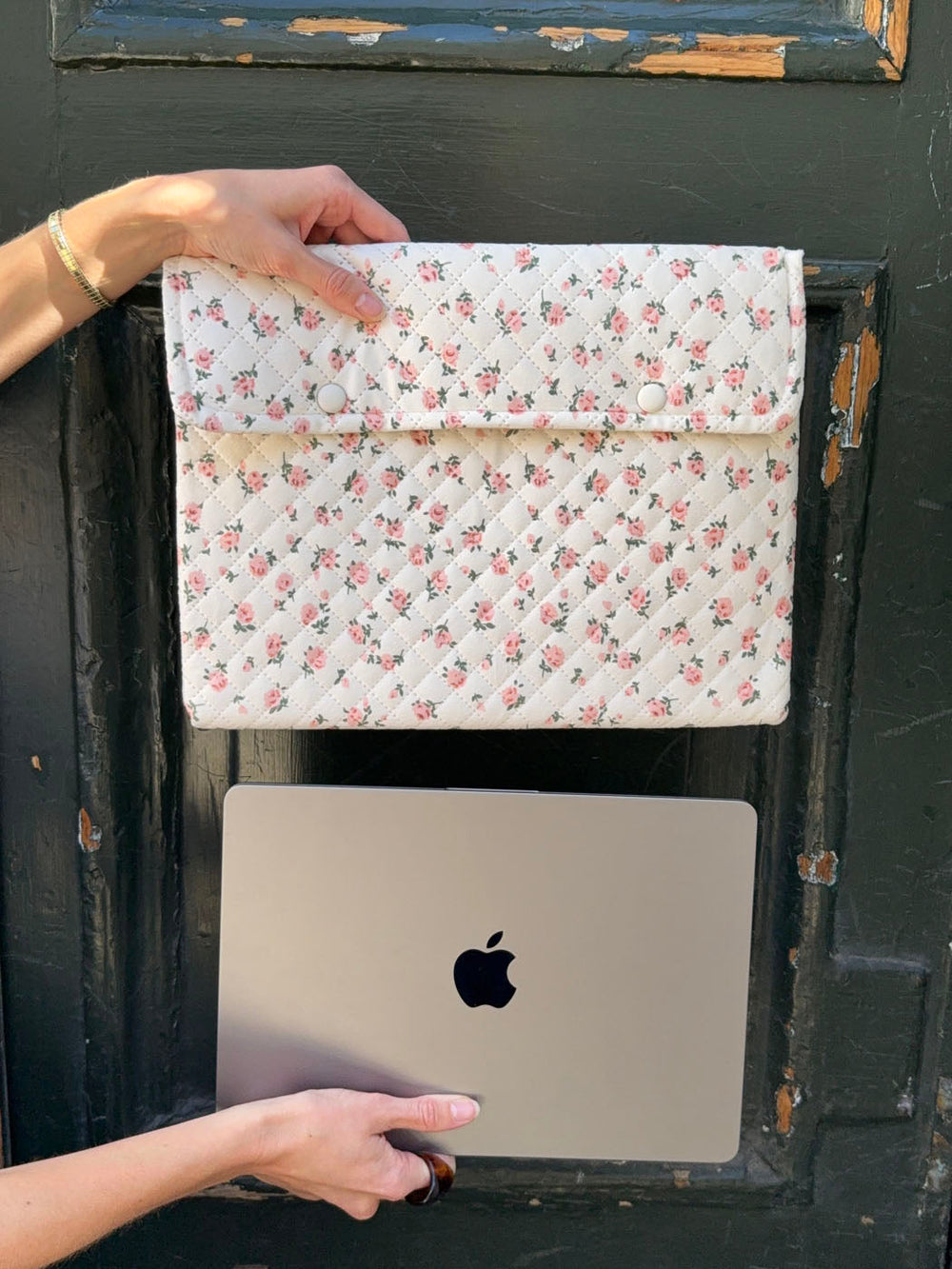 A romantic and feminine laptop sleeve in a quilted design. The white background is adorned with delicate pink flowers, creating a soft and charming look. Perfect for protecting your laptop with both style and personality.