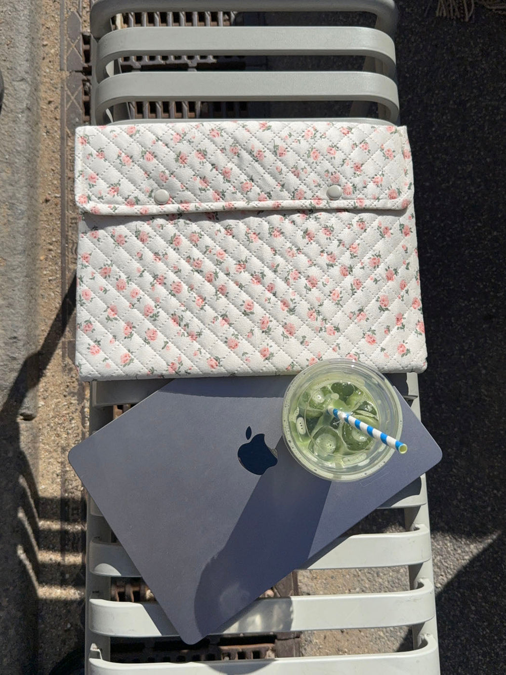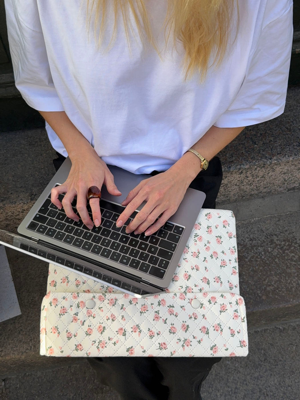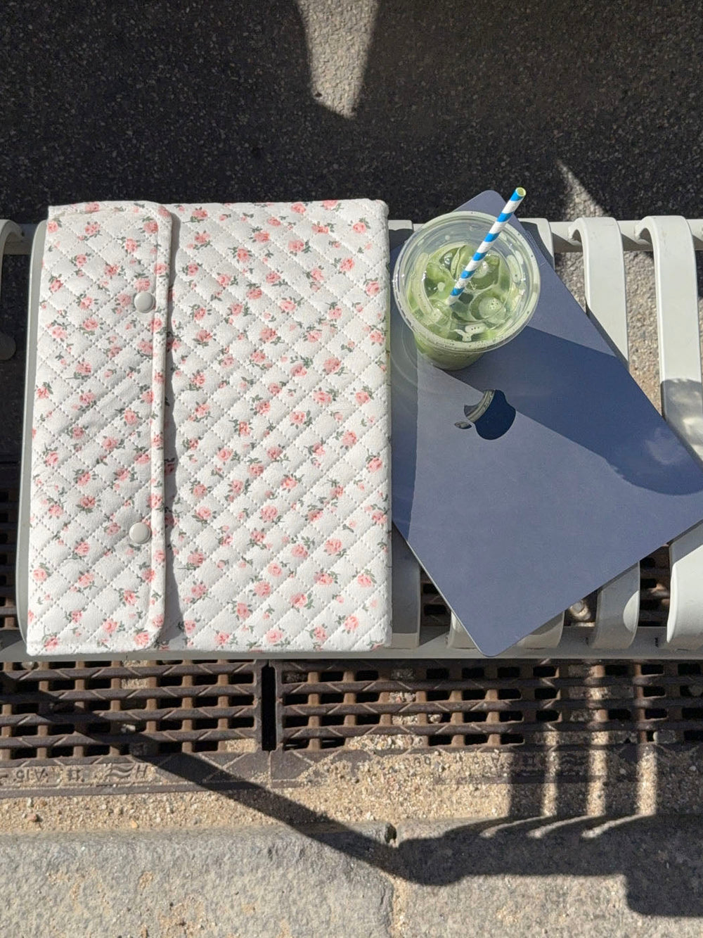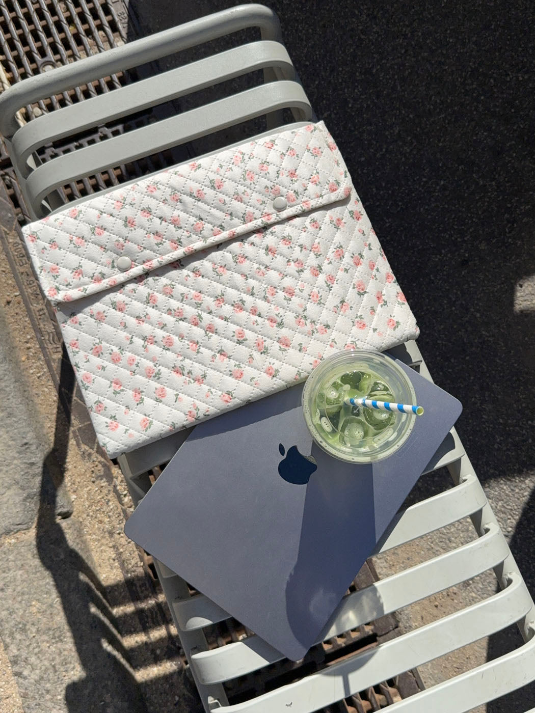A romantic and feminine laptop sleeve in a quilted design. The white background is adorned with delicate pink flowers, creating a soft and charming look. Perfect for protecting your laptop with both style and personality.