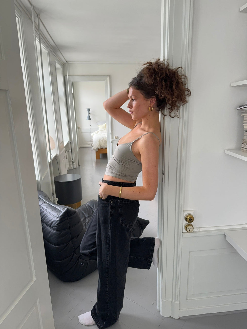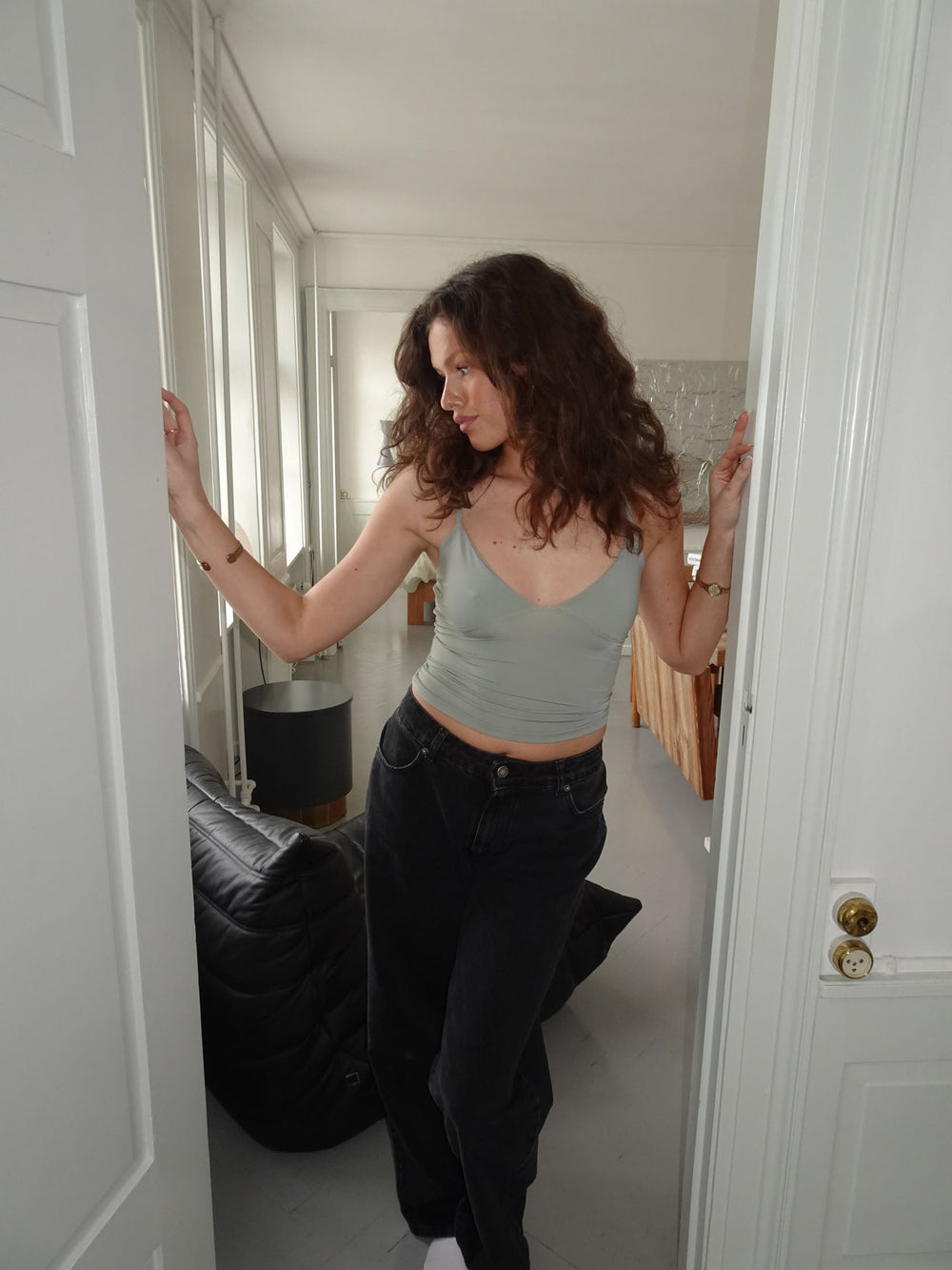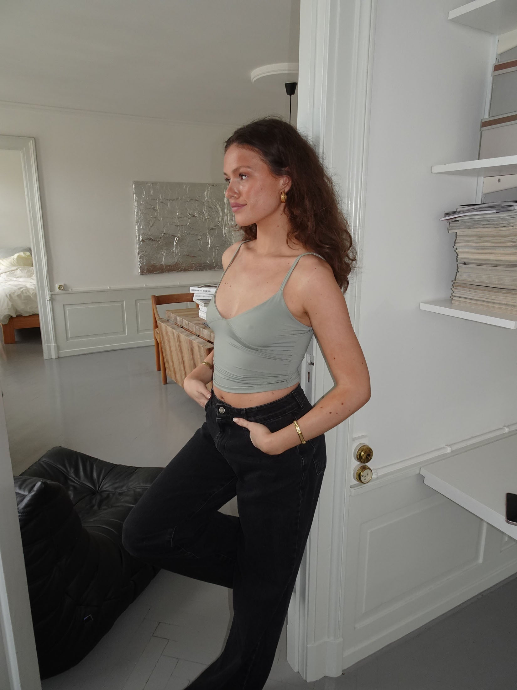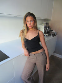 This black tank top with spaghetti straps has a fitted design that beautifully highlights your figure. It features an elegant v-neckline, adding a feminine and modern touch. Made from soft, stretchy material, it offers both comfort and flexibility, whether you're wearing it for a workout or as a stylish basic in your everyday wardrobe.