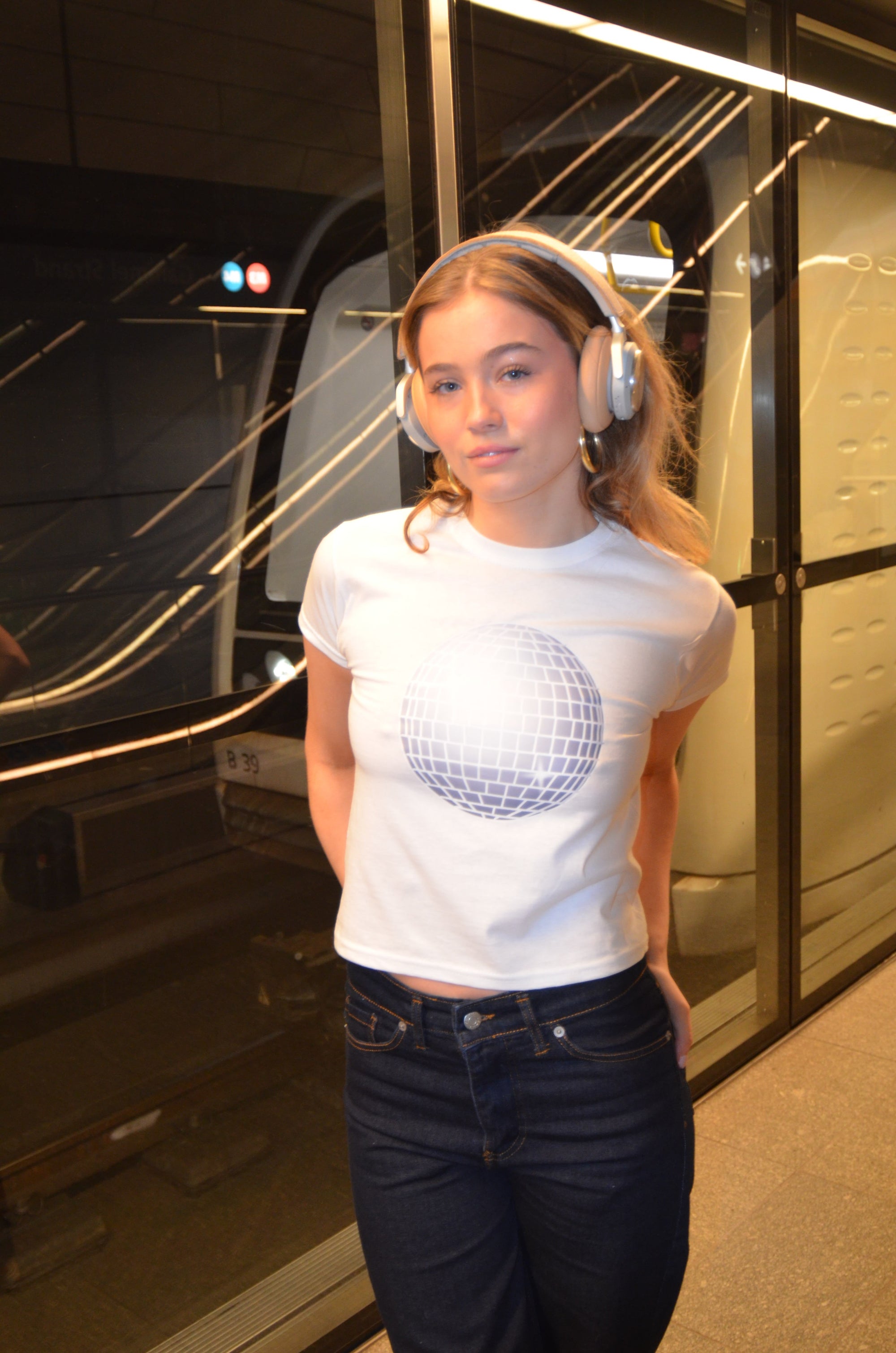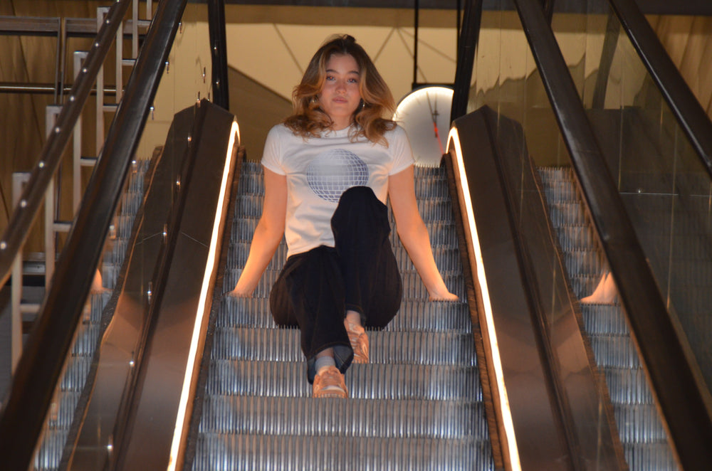 Baby tee with disco ball symbol. Our tees are from fruit of the loom and in a super soft and comfortable quality.