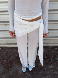 These lightweight trousers in a muted burgundy hue combine comfort and elegance with an airy, loose fit. Made from mesh fabric, they are semi-transparent. The belt wraps around the back, making the trousers appear less see-through. The elastic waistband ensures flexibility and a comfortable fit, while the long, matching belt adds definition and style. A versatile choice for both relaxed and sophisticated looks.