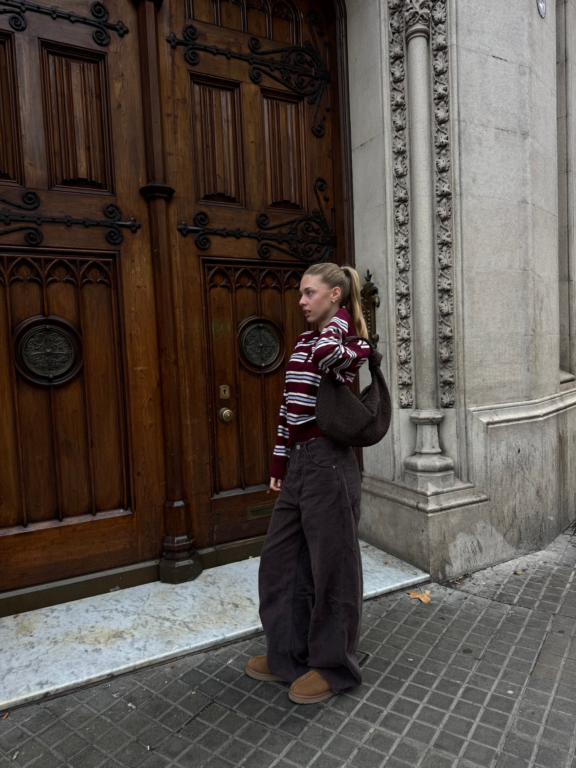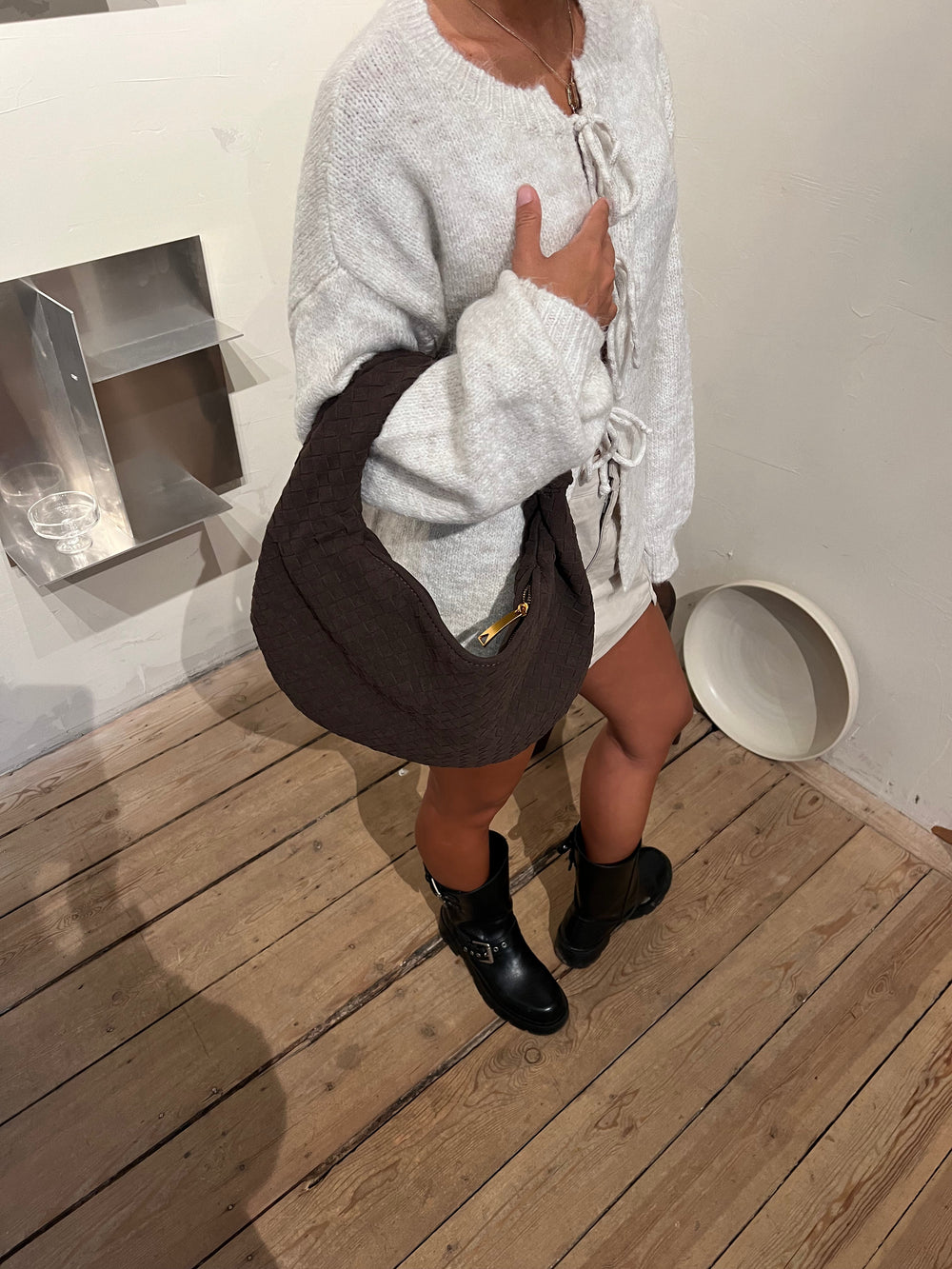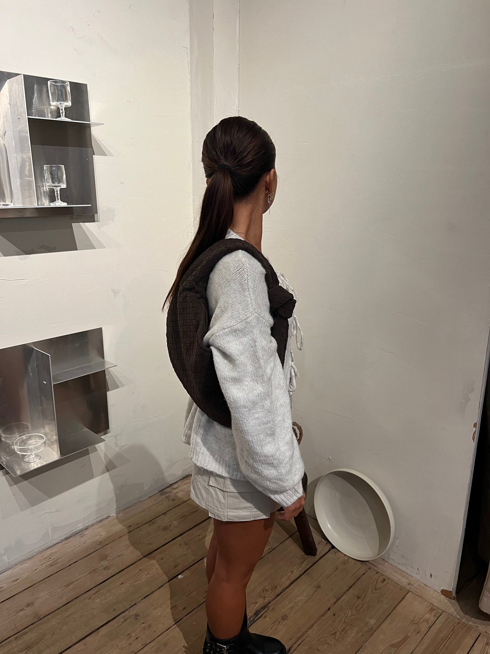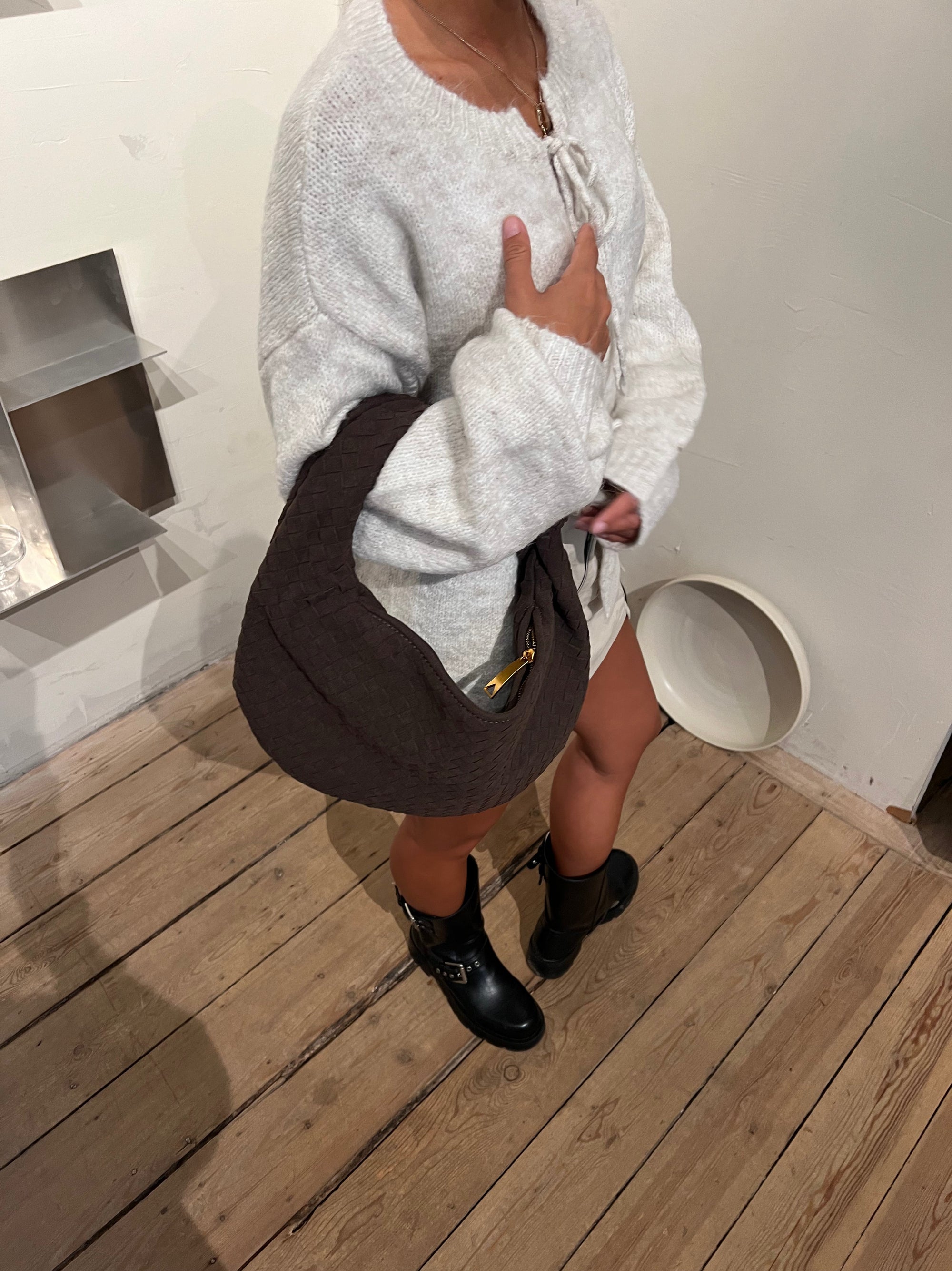 Our Florence shoulder bag has a round shape and a woven/braided design with knot detail. The bag has a large main compartment with zip closure, and a smaller compartment with zip inside the bag. Perfect for a city trip or everyday life.